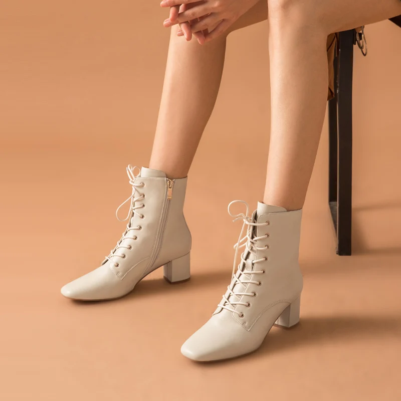 100% из натуральной кожи Материал верхней части из мягкой овчины Дышащая подкладка и стелька из свиной кожи Нескользящая резиновая подошва Обувь с квадратным носком Шнуровка и застежка-молния Высокий каблук: 5,2 см Доступные цвета: винный, розовый, бежевый Ручной работы Обувь с коробкой