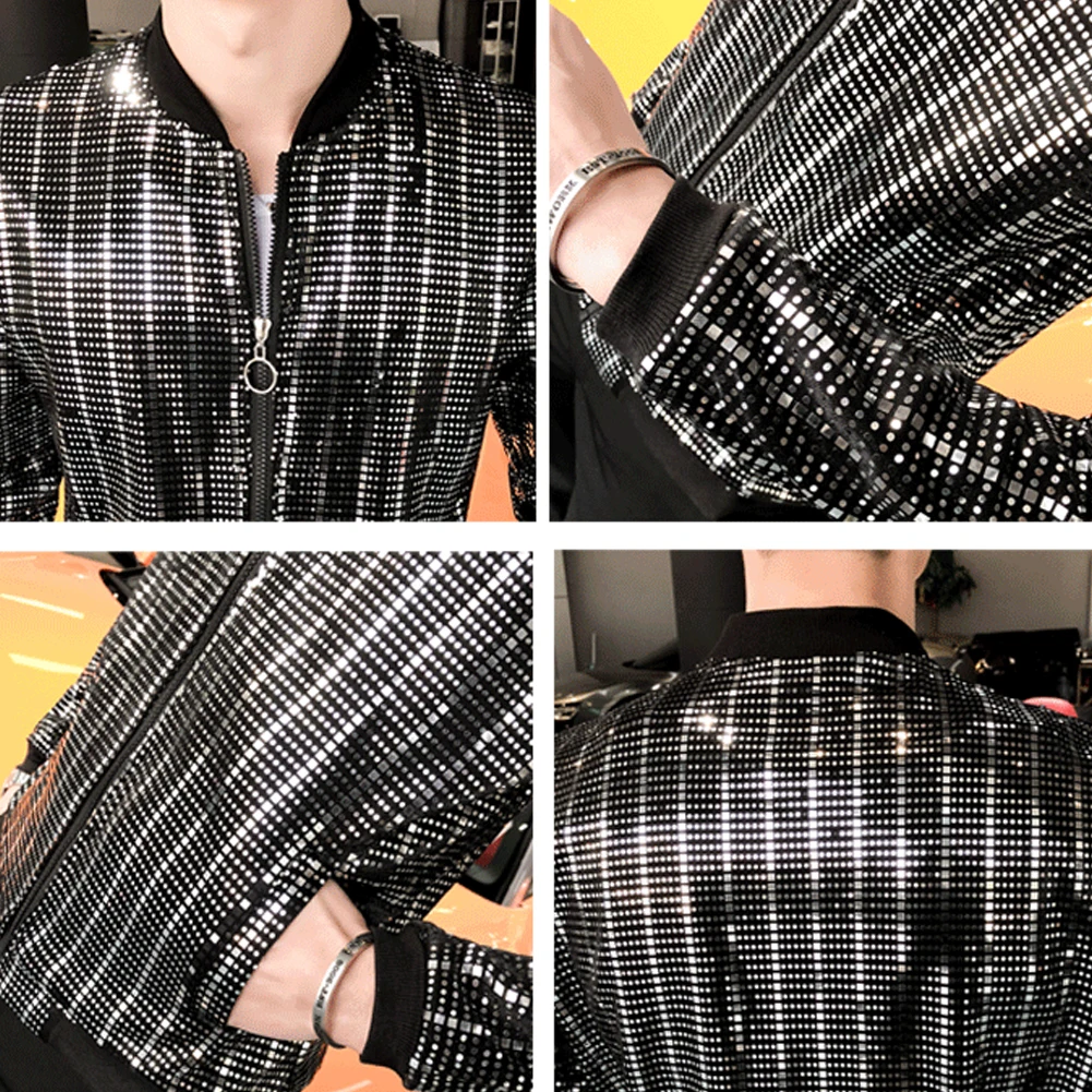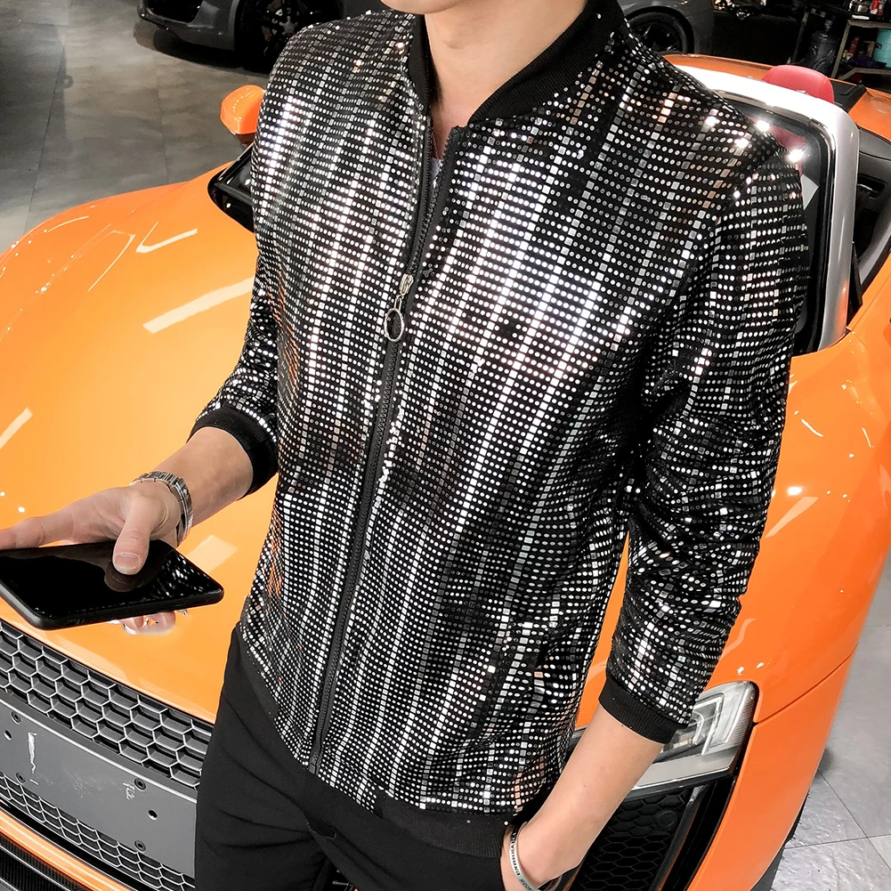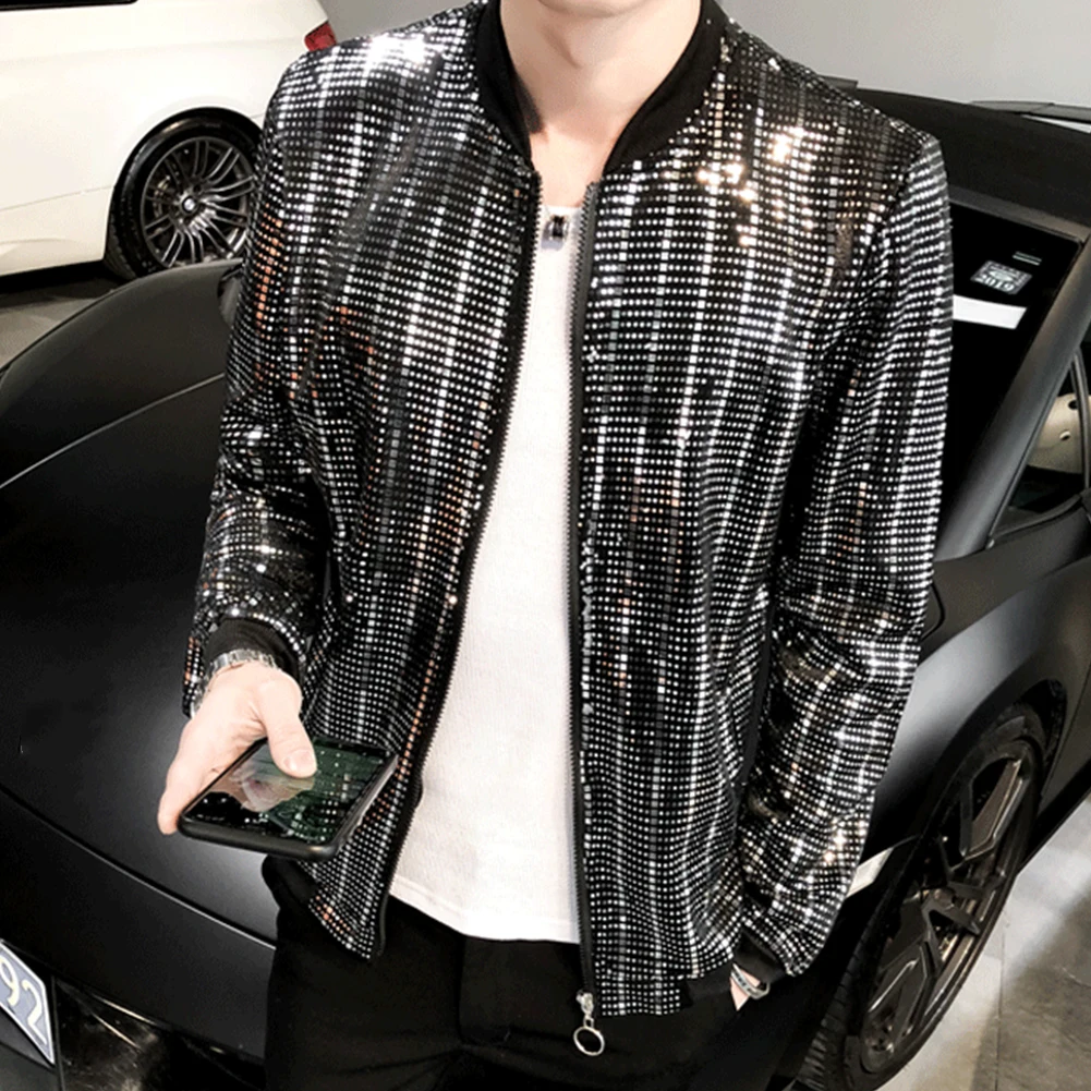 Мужская блестящая куртка певца с длинным рукавом на молнии с карманом для ночного клуба приталенное пальто