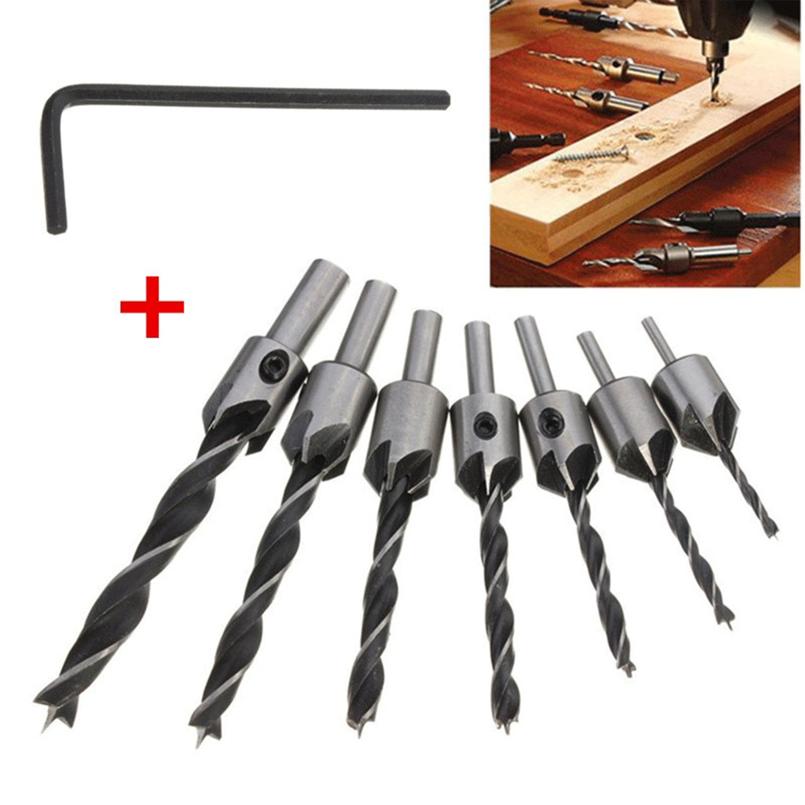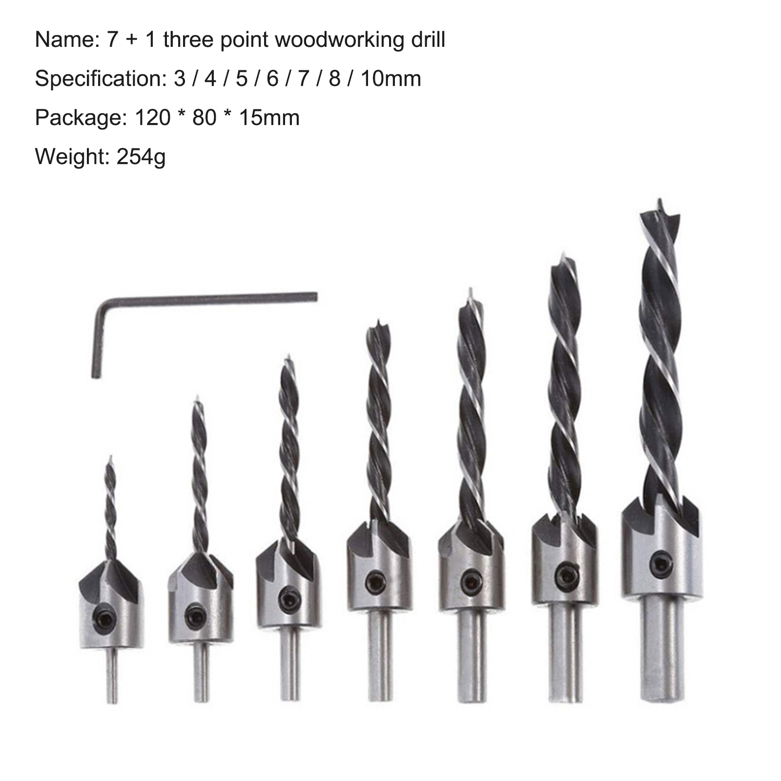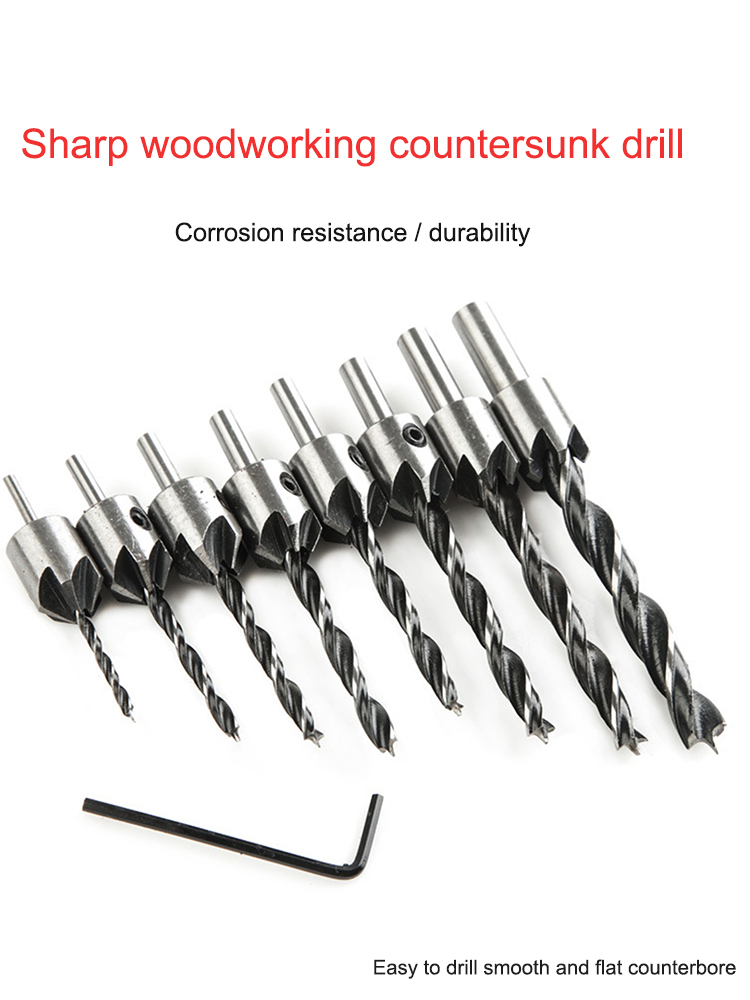 Название продукта: набор сверл для зенковки Материал: Высокоскоростная сталь Цвет: серебристый и черный Размеры: 3 мм (диаметр) x 60 мм (Д) 4 мм (диаметр) x 75 мм (Д) 5 мм (диаметр) x 85 мм (Д) 6 мм (диаметр) x 93 мм (Д) 7 мм (диаметр) x 10 мм (Д) 8 мм (диаметр) x 11 мм (Д) 10 мм (диаметр) x 12 мм (Д)