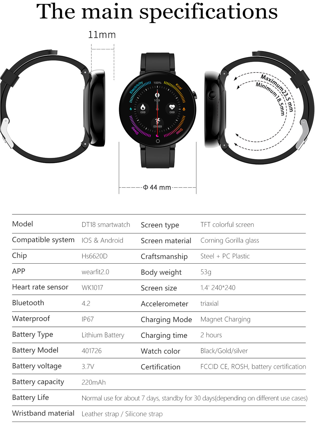 Параметры Бренд DT NO.1 Модель DT18 Цвет черный, коричневый, синий Версия bluetooth BT 4,2 или выше Совместимость с ОС Android 4,4 или выше, iOS 8,4 или выше Режим работы с одним касанием Название приложения Wearfit2.0 Языки приложения: английский, португальский, испанский, французский, немецкий, итальянский, чешский, русский, японский, корейский, упрощенный китайский, традиционный китайский Особенности Водонепроницаемый IP67 Монитор сердечного ритма Поддержка Поддержка монитора артериального давления Поддержка монитора кислорода в крови Монитор наблюдения за сном Поддержка Поддержка нескольких спортивных режимов (бег, езда на велосипеде, скалолазание) Поддержка напоминания о звонках или сообщениях Отклонение входящего звонка Поддержка Поддержка уведомлений: Facebook,Twitter,Wechat, WhatsApp и т. Д. Оповещение о Тип вибрации Автоматический светильник с поддержкой экрана Секундомер/ Другие функции, поддержка шагомера, будильника, календаря, напоминания о сидячем положении, пульта дистанционного управления камерой, защиты от потери Технические параметры Датчик сердечного ритма Размер экрана: 1,4 дюймов Тип: на тонкопленочных транзисторах на тонкоплёночных транзисторах Разрешение: 240*240 пикселей Емкость аккумулятора: 220 мАч Время в режиме ожидания: около 7 дней Время использования: около 3 дней Время зарядки: около 2 часов Тип зарядки: Магнитная Зарядка Внешний вид и детали Материал ремешка: силикон Длина: около 255 мм Ширина: около 20 мм Посылка в комплекте 1 * DT NO.1 DT18 умный Браслет 1 * оранжевый ремешок для часов 1 * зарядный кабель 1 * Руководство пользователя (версия на английском языке) Вопросы и ответы 1. В. Это из водонепроницаемого материала A. Это lP67 из водонепроницаемого материала. 2. В. Что такое приложение A. Это Wearfit2.0. 3. В. Как изменить время работы моего устройства A. Пожалуйста, Синхронизируйте устройство с вашим телефоном через Bluetooth, чтобы откалибровать время.