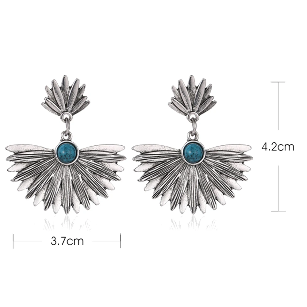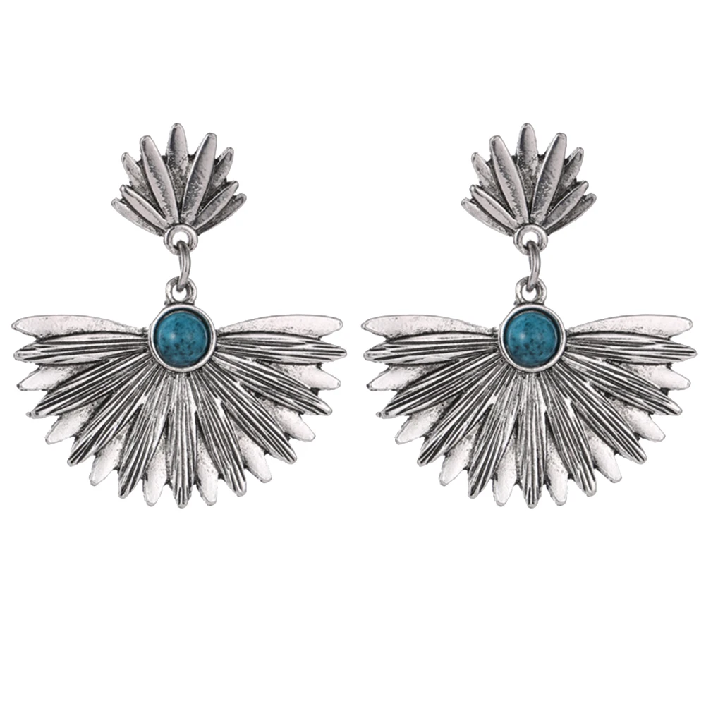 Металлическая подвеска в форме веера, украшенная искусственным бирюзой, придает винтажный вид.