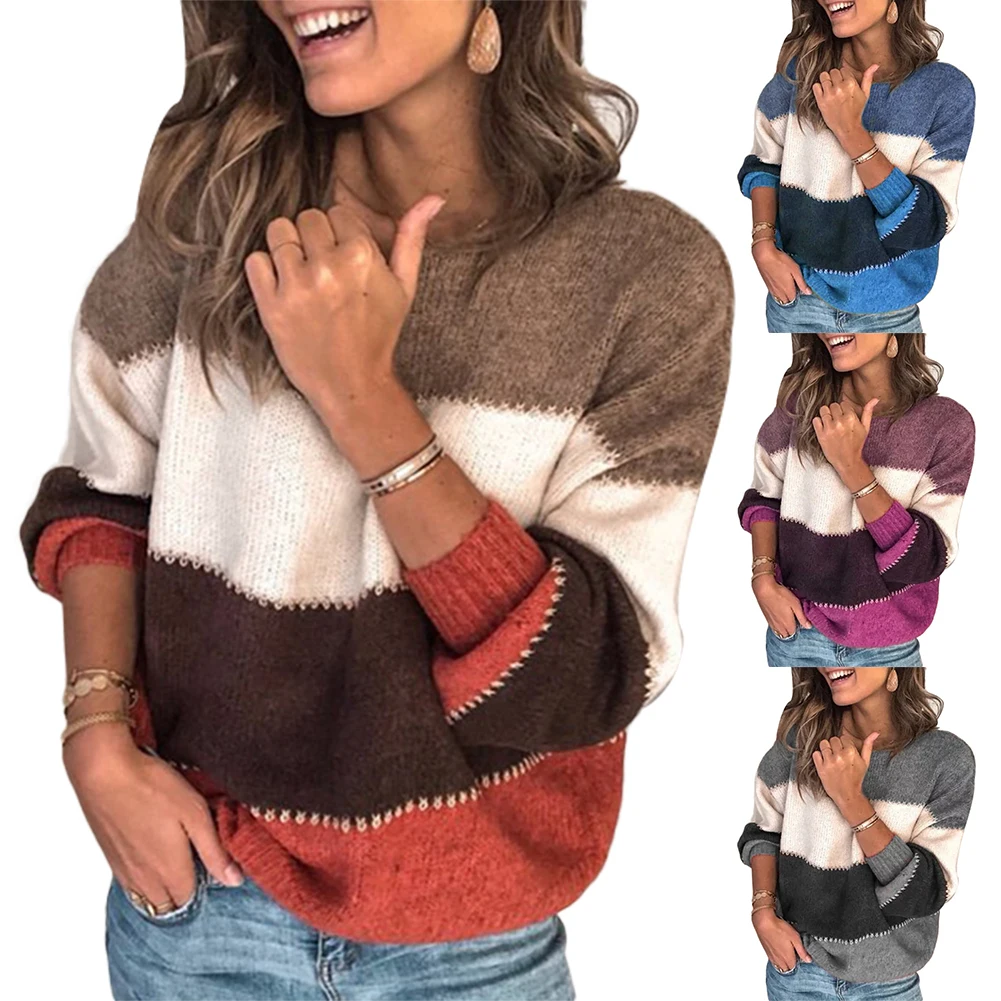 Повседневный женский зимний теплый вязаный свитер с круглым вырезом и длинными рукавами в стиле пэчворк