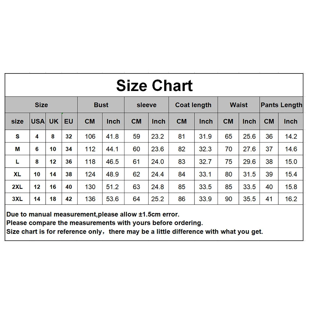 [Наш Размер XXXL] Обхват груди: 136 см/53,6 ", обхват талии: 90 см/35,5", рукав: 64 см/25,2 ", длина пальто: 86 см/33,9", брюки Длина: 41 см/16,2 "(прибл.)