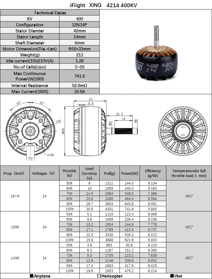 Противоскользящая алюминиевый звонок, 420 нержавеющая сталь 26,5 мм (внешняя длина) Φ6 мм вал и Шестигранная гайка M6 позволяют большинству пропеллеров на рынке легко устанавливать и снимать на 4214. Предварительно луженые провода 800 мм и отверстия с резьбой 4 мм в рисунке 30*30 мм на задней пластине применимы к большинству Рам X-класса на рынке. Выдолбленное легкое основание повышает охлаждение и эффективность.