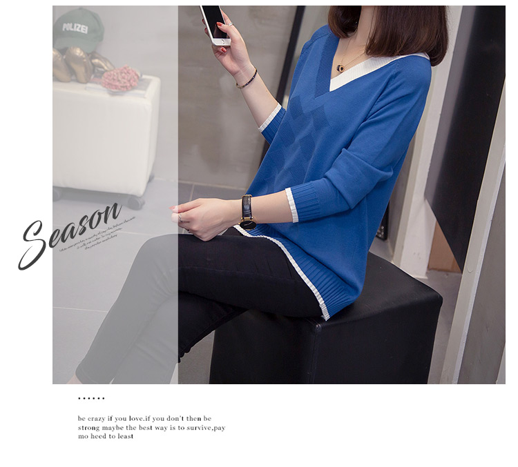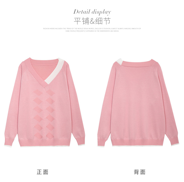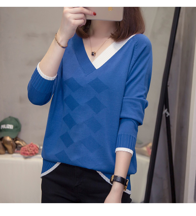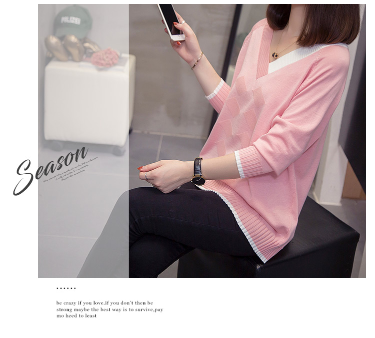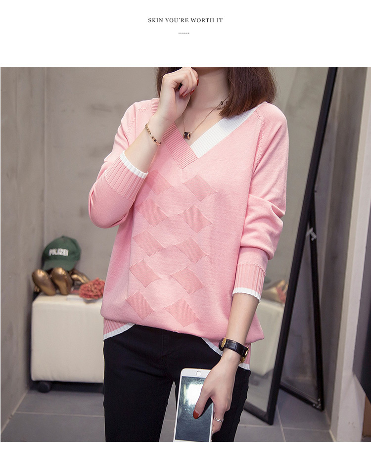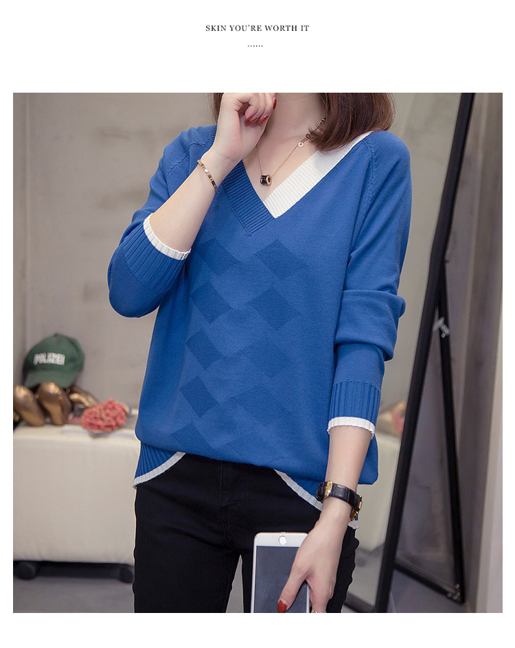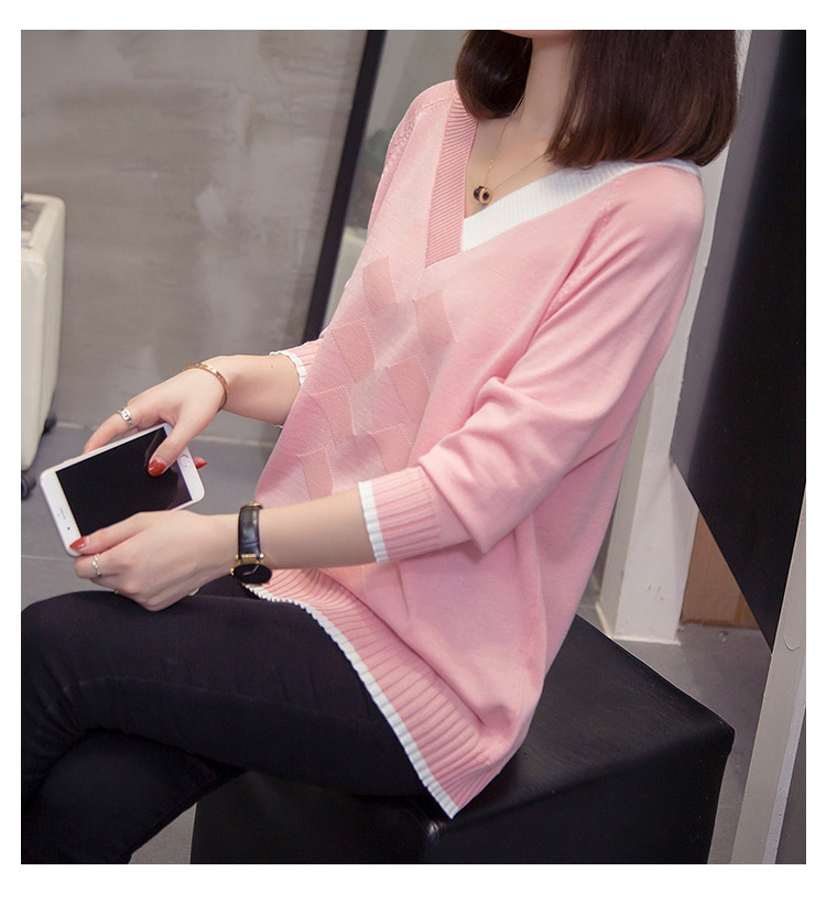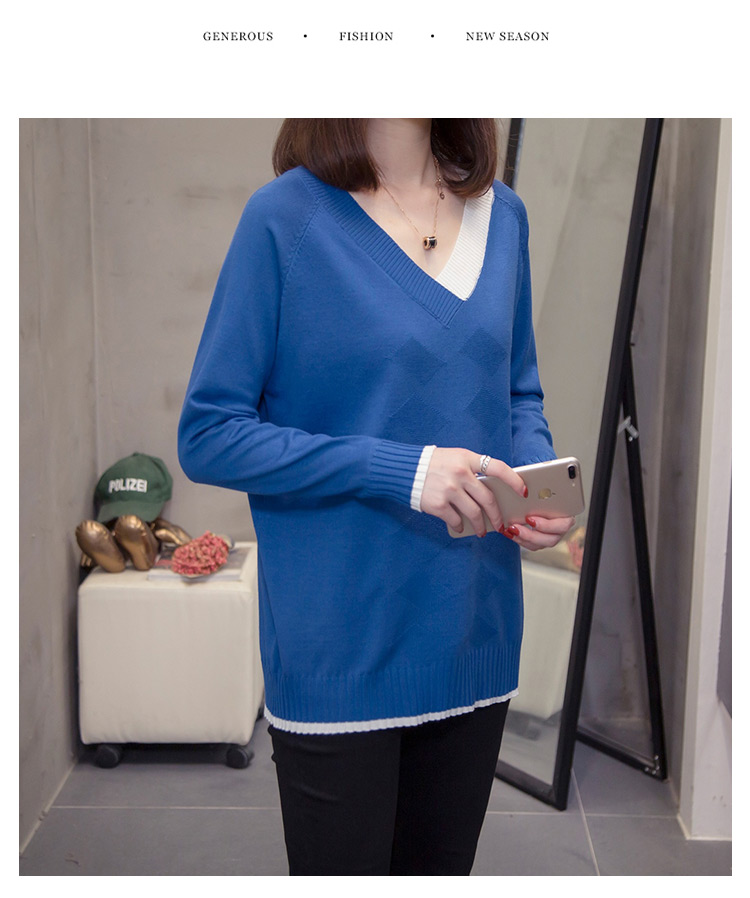 Пуловер с v-образным вырезом размера плюс, женский свитер, Осень-зима, свободный, пэчворк, вязанные топы, верх размера, трикотаж, джемперы DA62