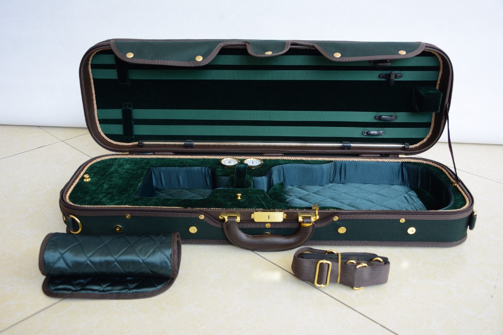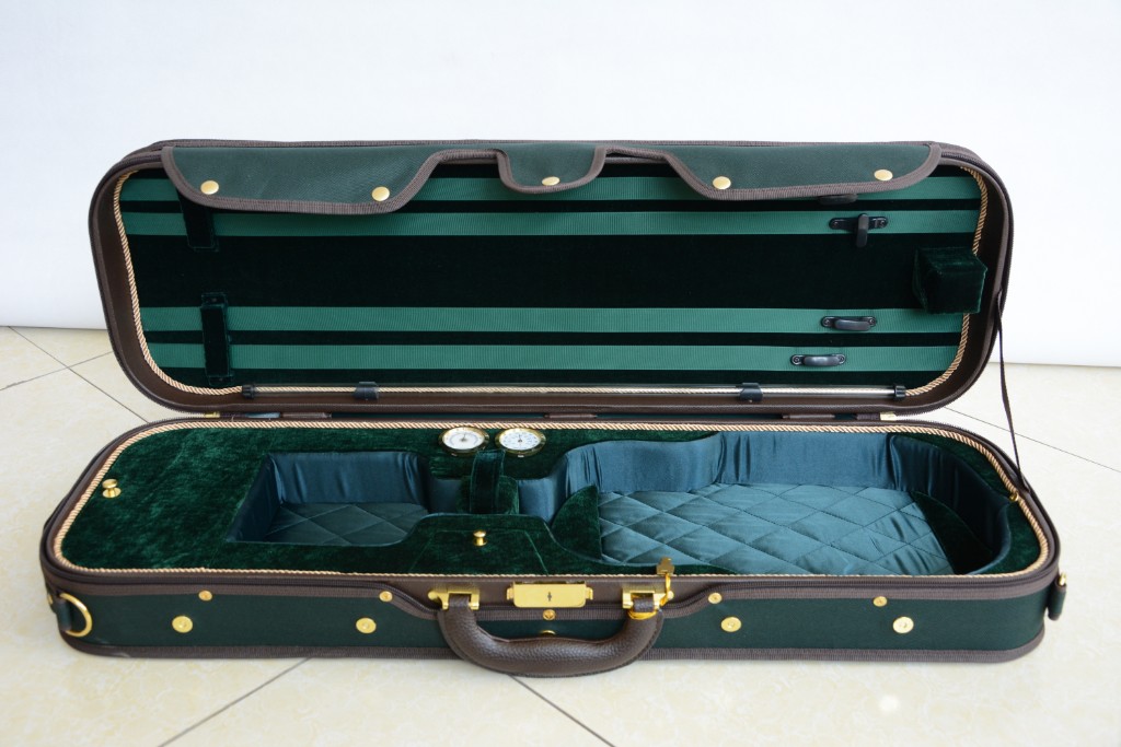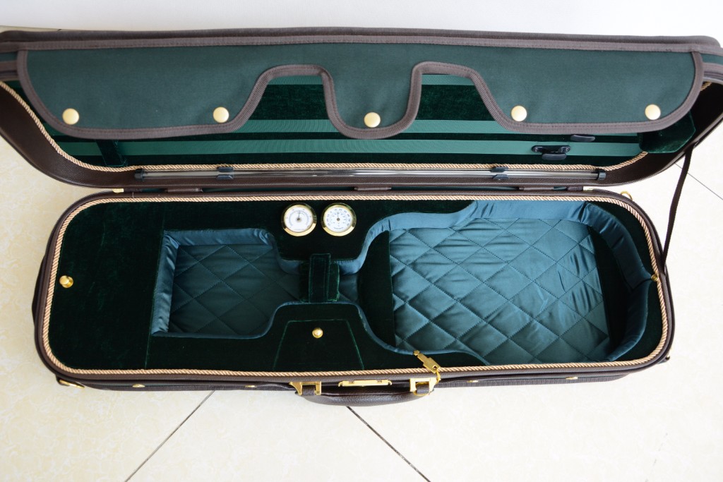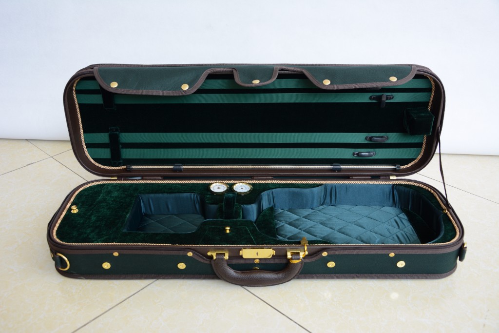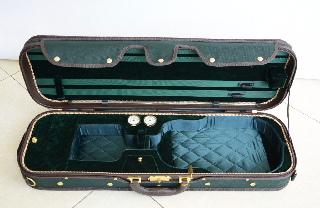 Это высококачественный роскошный и Королевский Деревянный чехол для скрипки, прочный, прочный и долговечный светильник, конструкция из цельного дерева; Непромокаемый зеленый холст снаружи и внутри, 4 держателя для банта, подходящая Крышка для одеяла, оснащен гигрометром, струнной трубой для дополнительных струн, достаточно большим отсеком для хранения канифоли, плечевого отдыха, плечевых ремней и многого другого; Продуманный и элегантный бархатный интерьер.Фотографии продукта