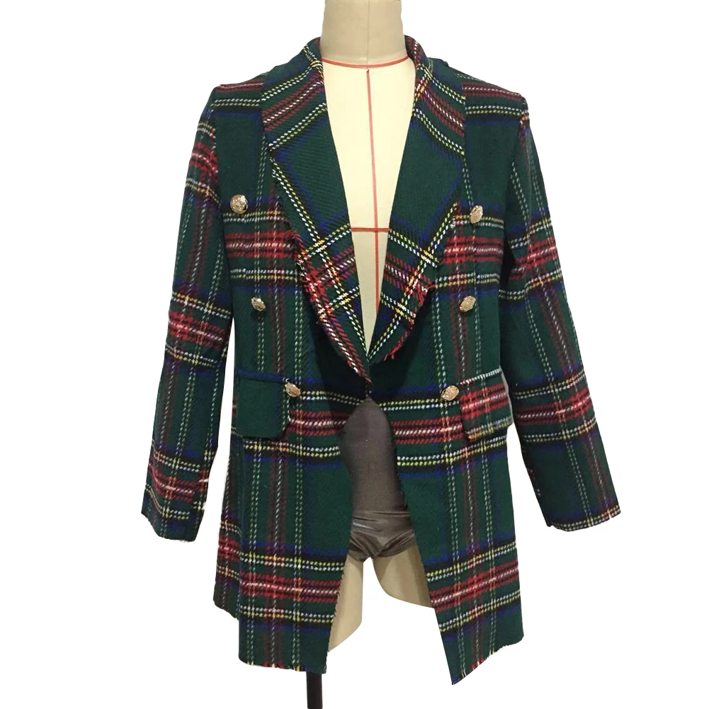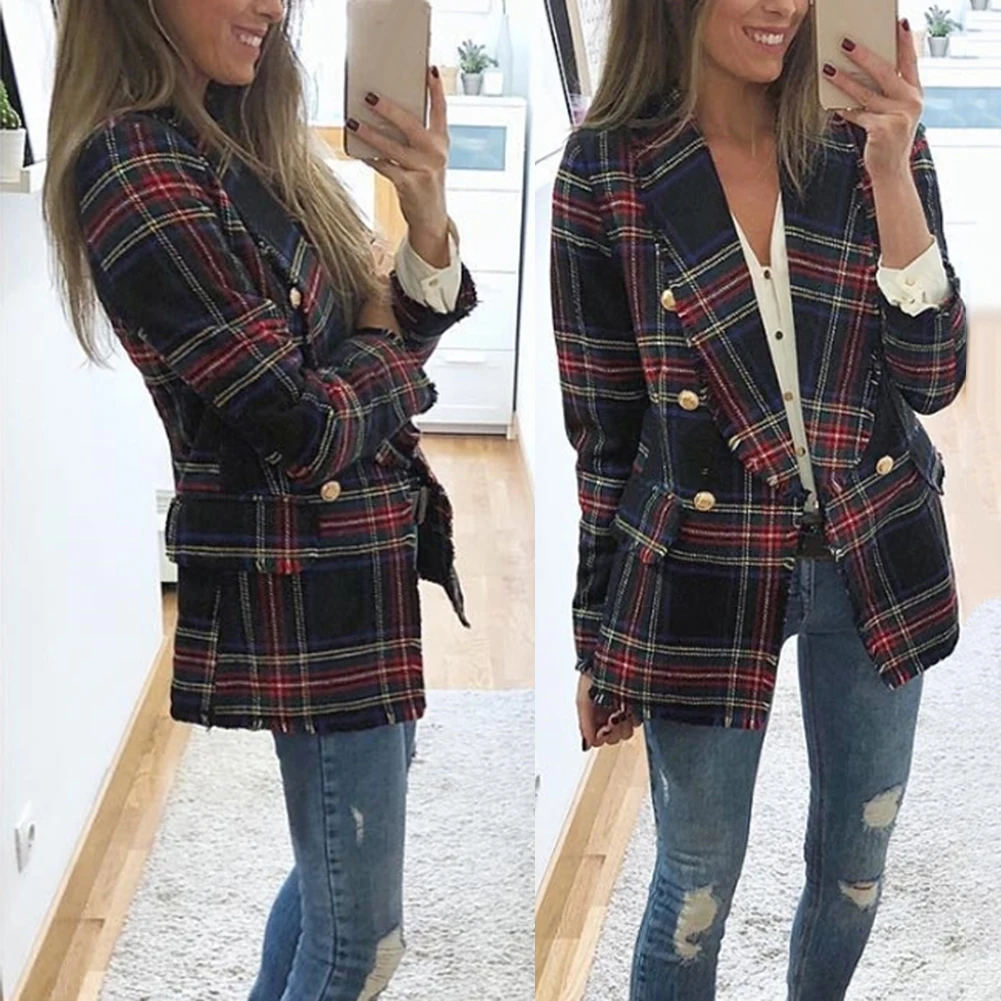 Офисный женский двухсторонний шерстяной кардиган, клетчатый двубортный пиджак