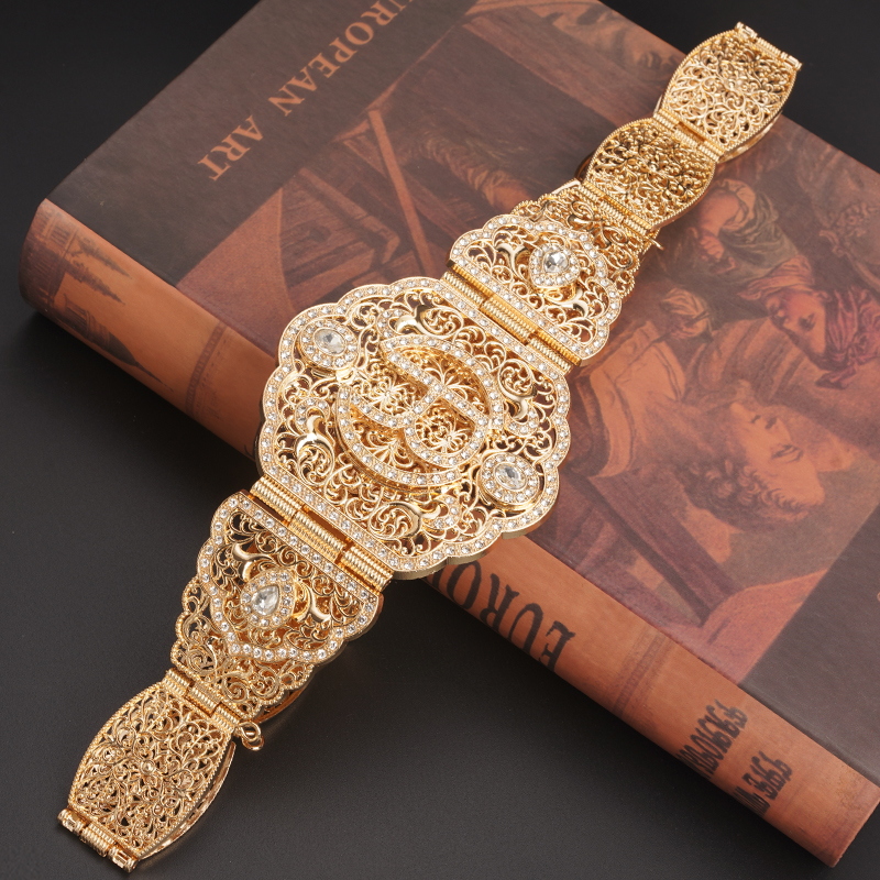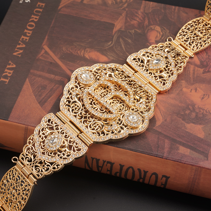 Moroccan R Brand Metal Belts for Women Golden Jewelry Waist Chain Full Rhinestone Bridal Belts Famous Morocco Jewelry
