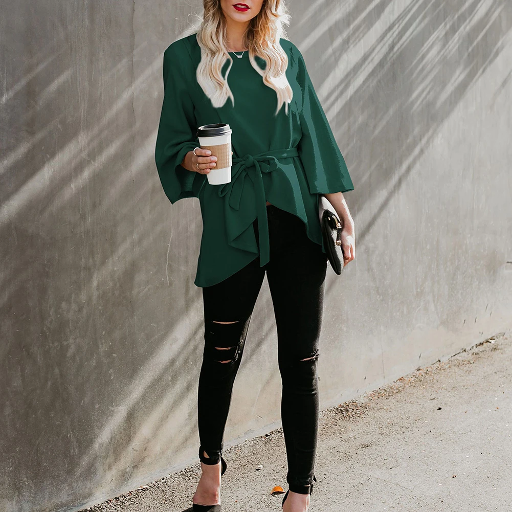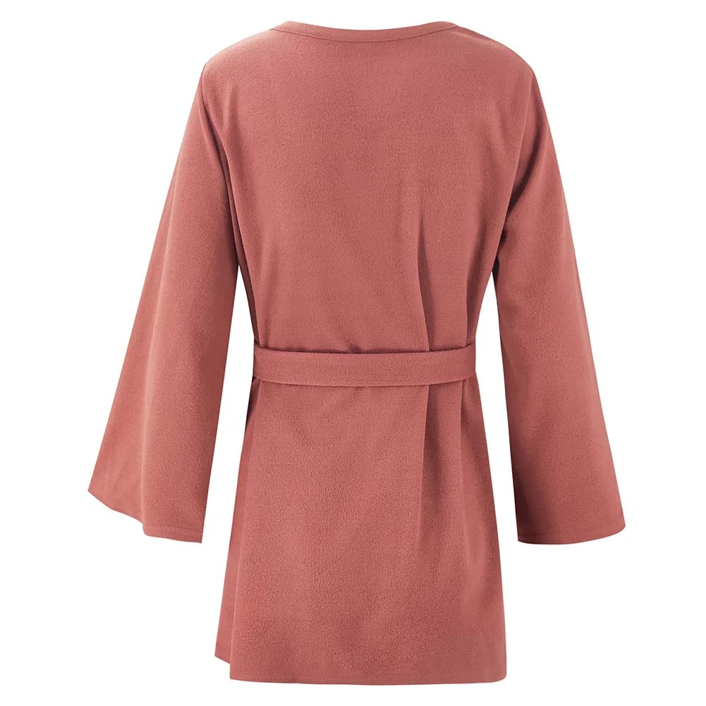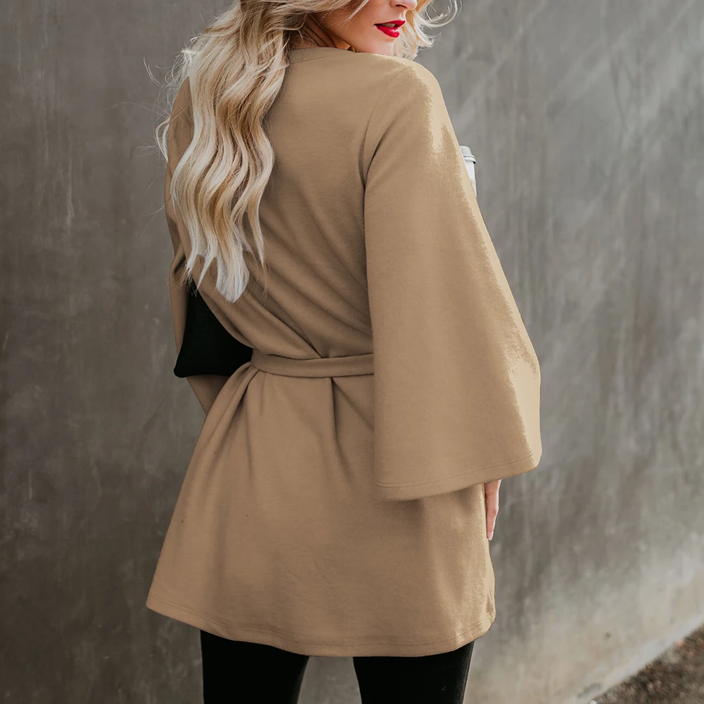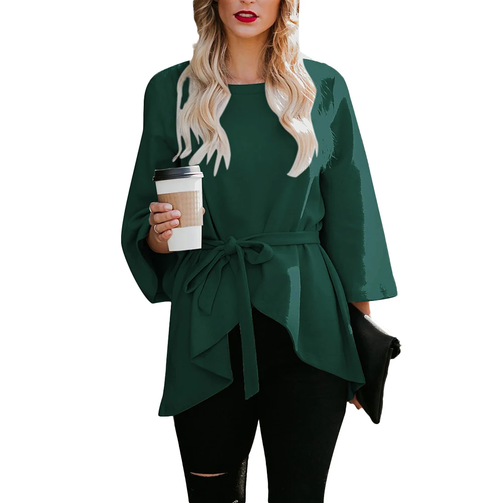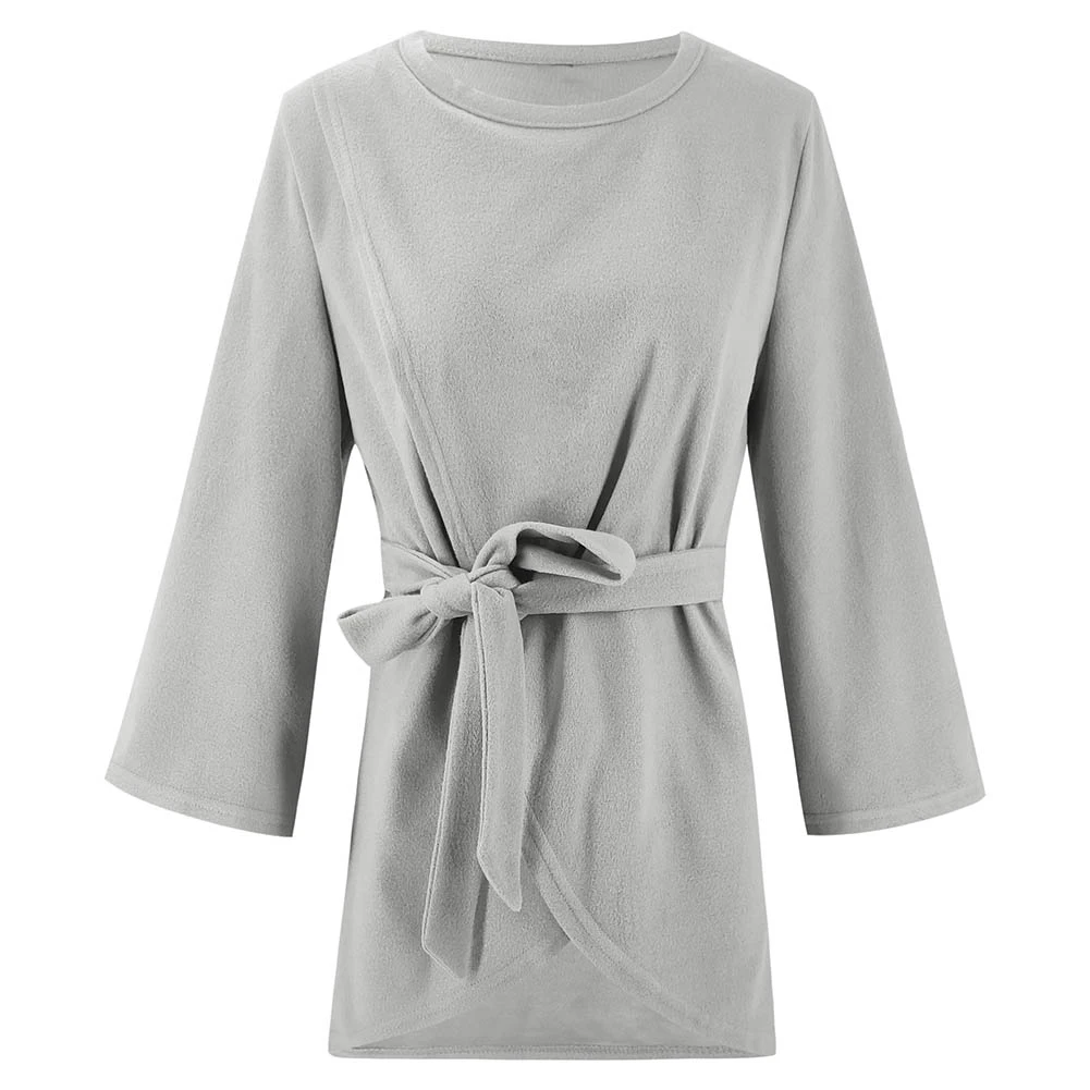 Women Autumn Solid Color 3/4 Sleeve Waist Belt Loose Irregular Sweatshirt Coat