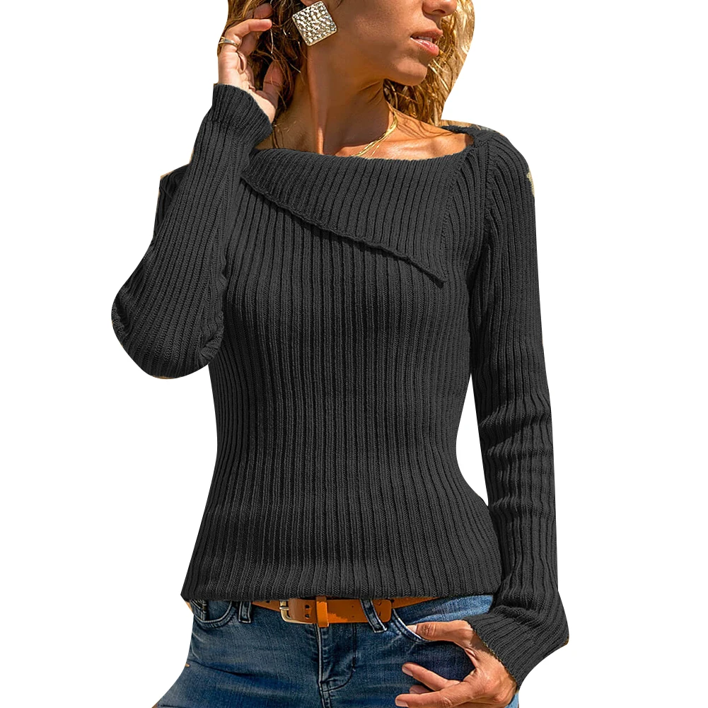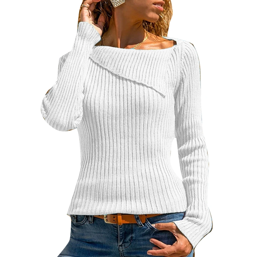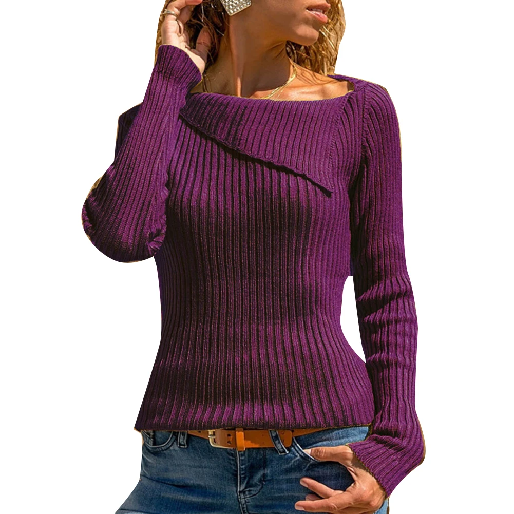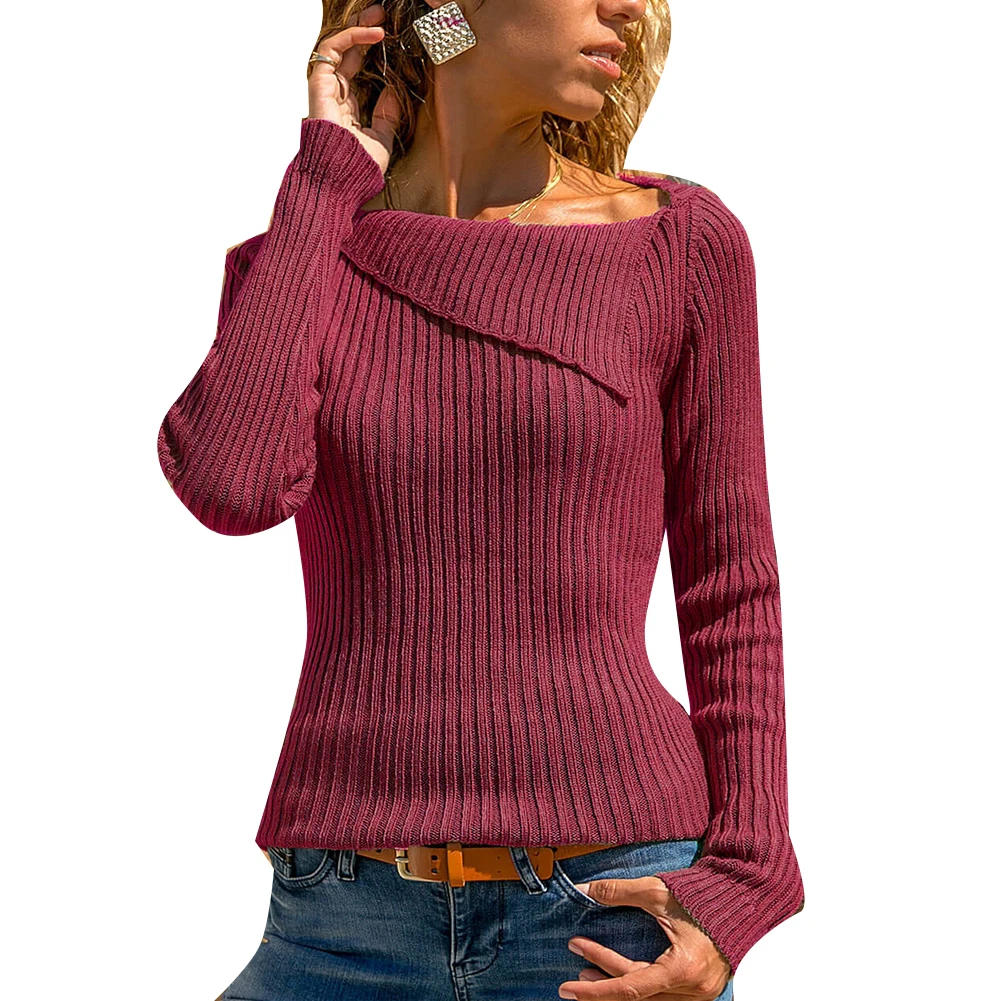 Шикарный женский отложной воротник сплошной цвет с длинным рукавом Sliming Fit вязаный свитер Топ