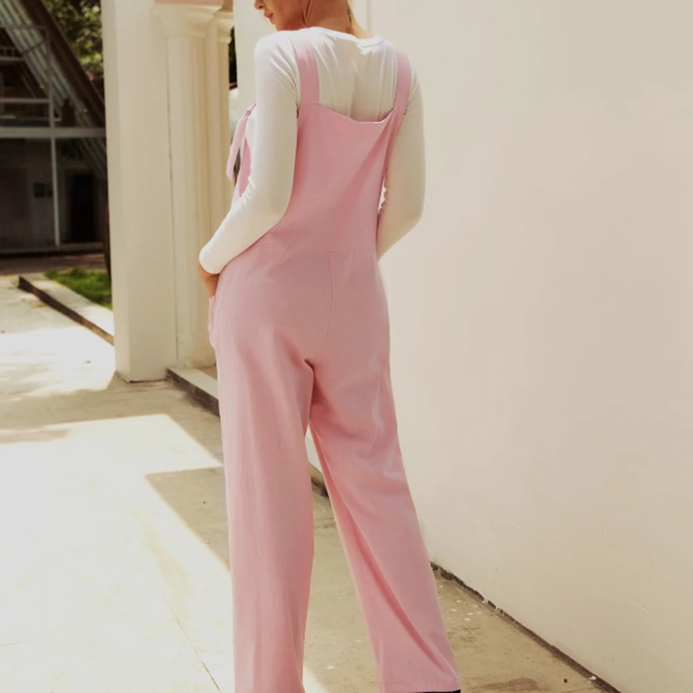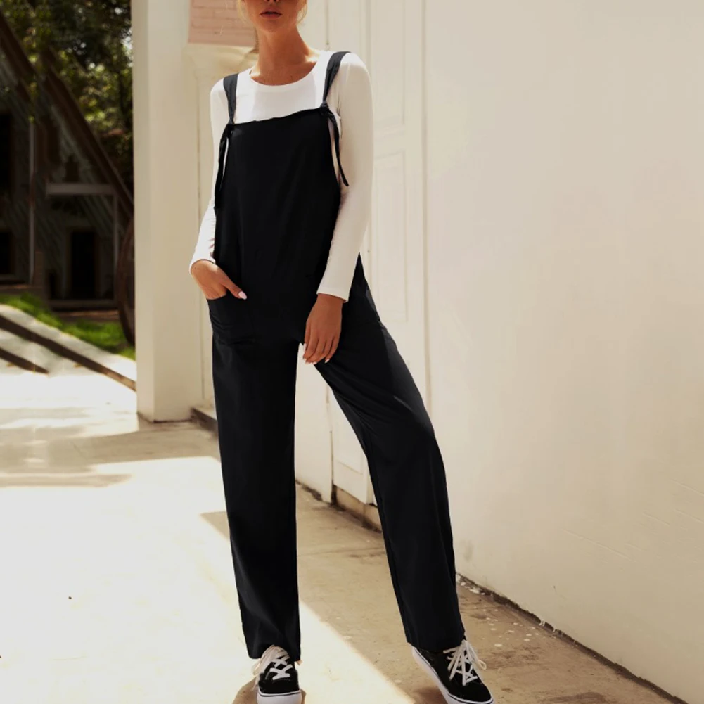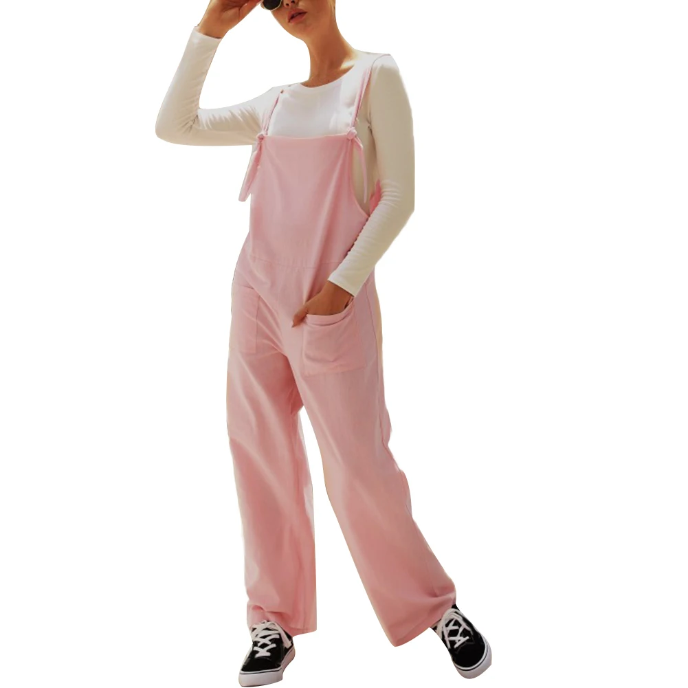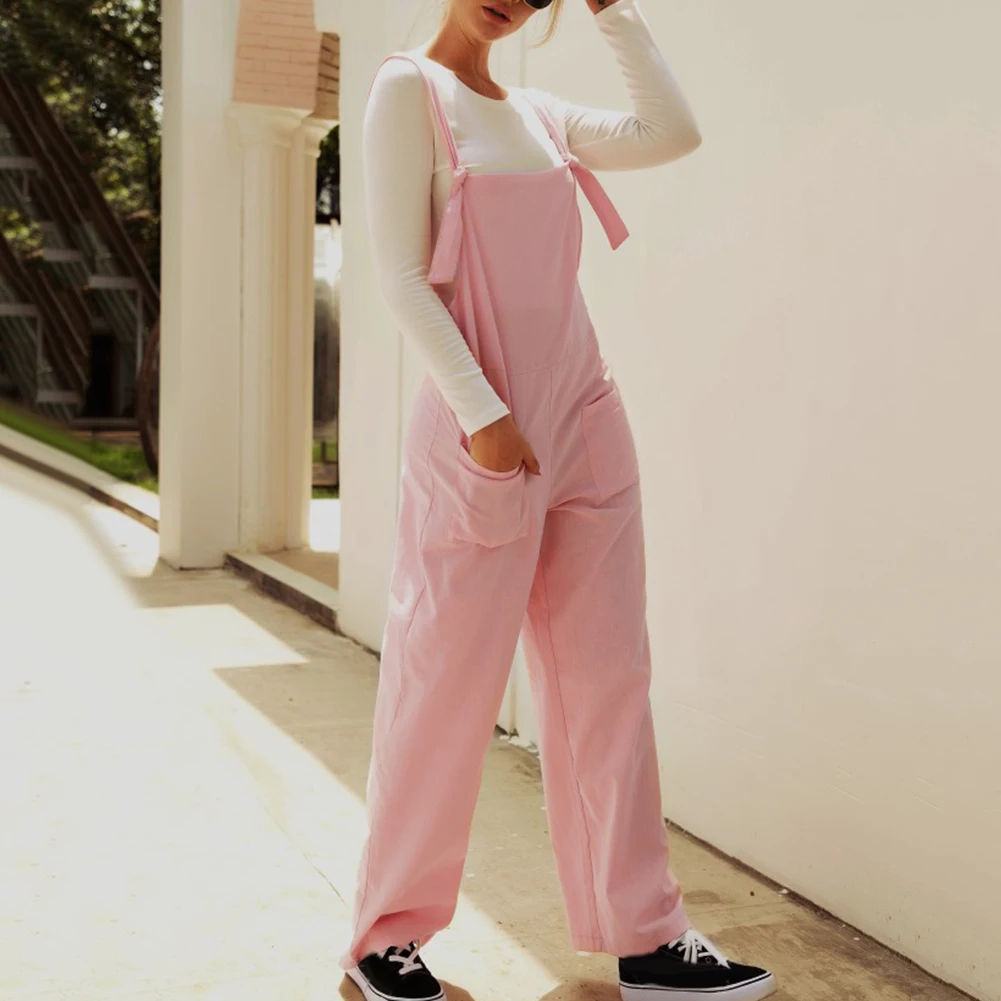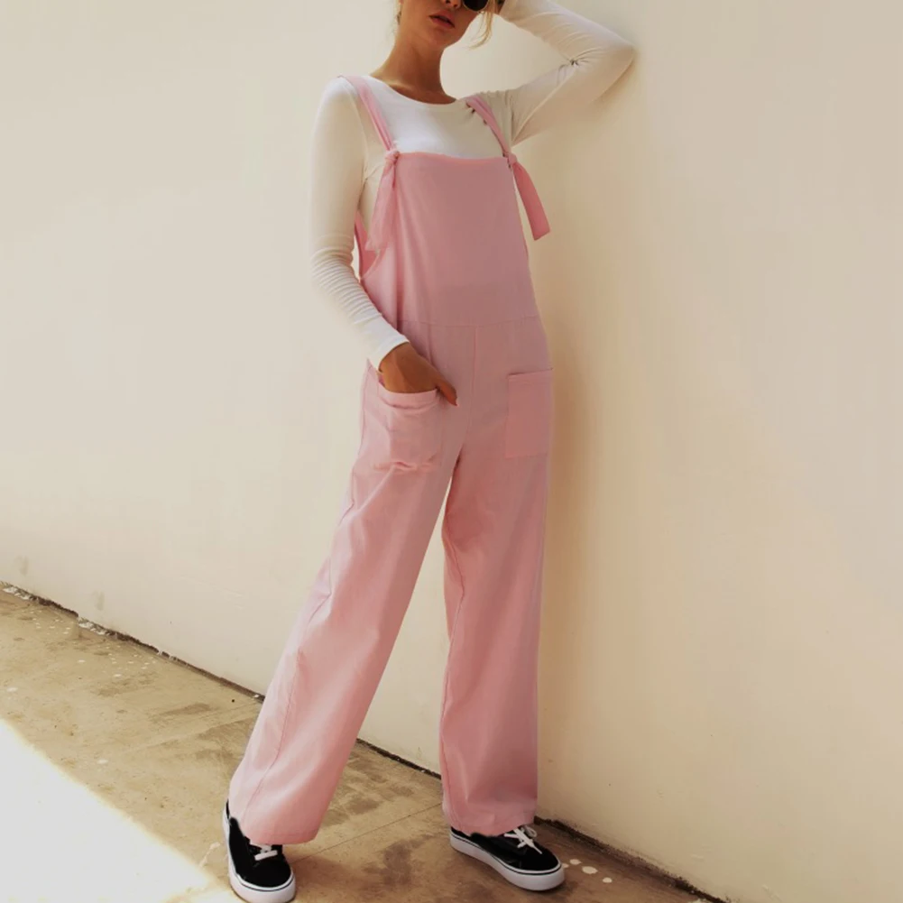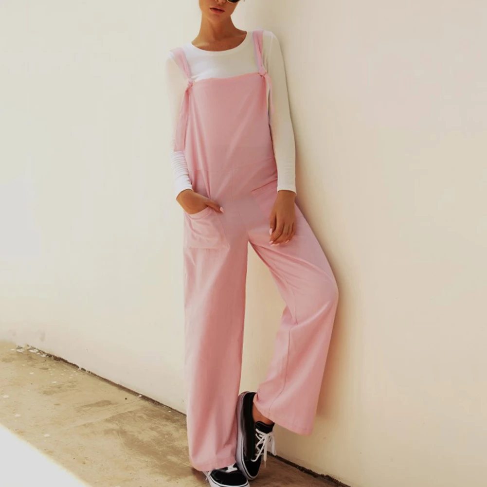 Casual Women Solid Color Multi Pockets Knot Tie Wide Leg Loose Overalls Jumpsuit