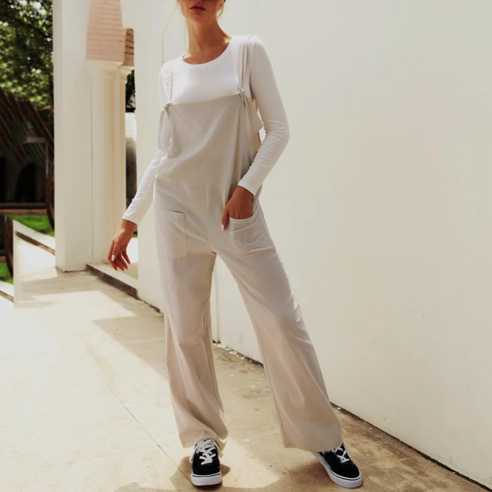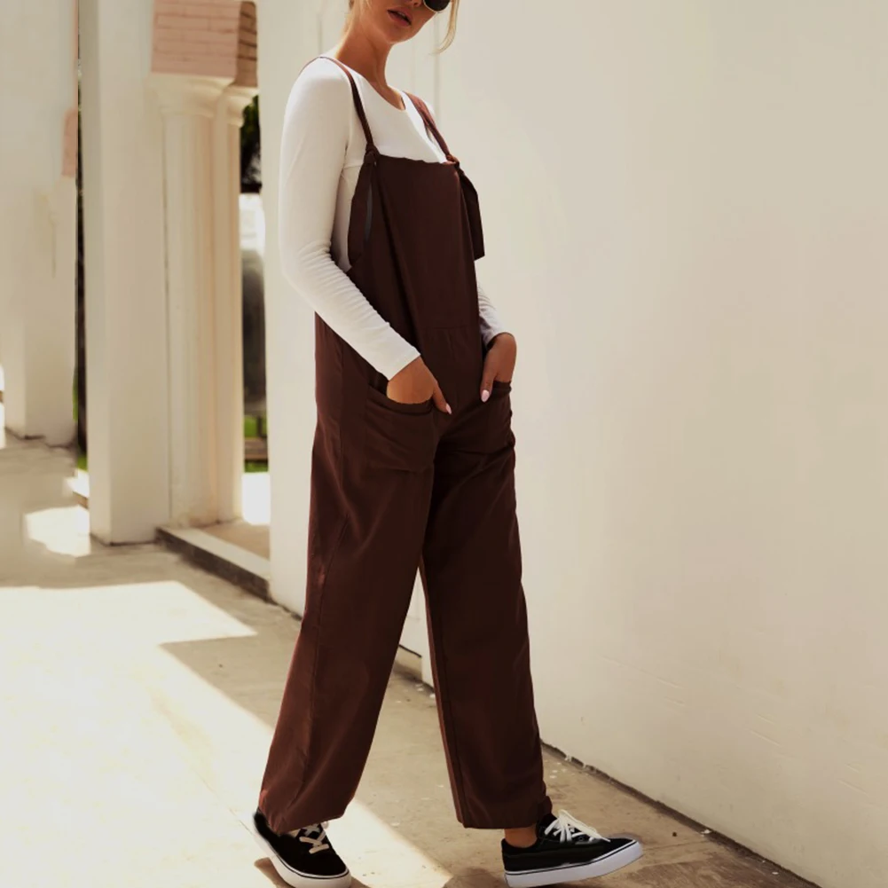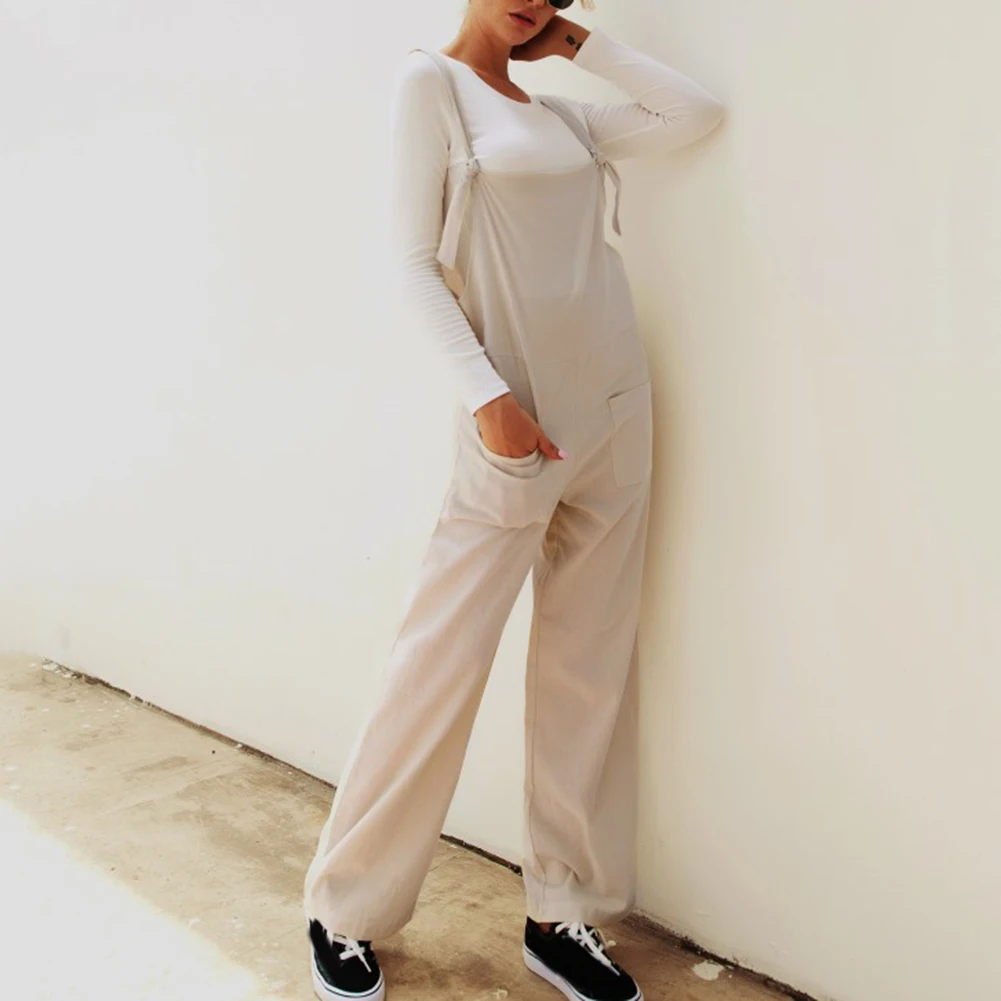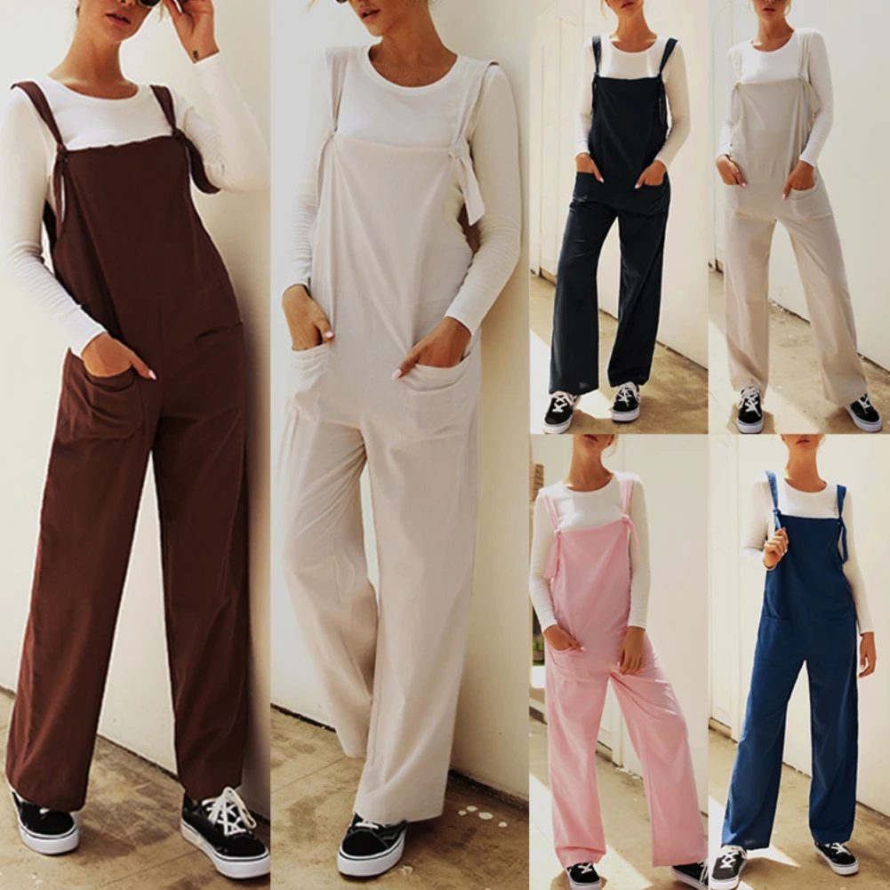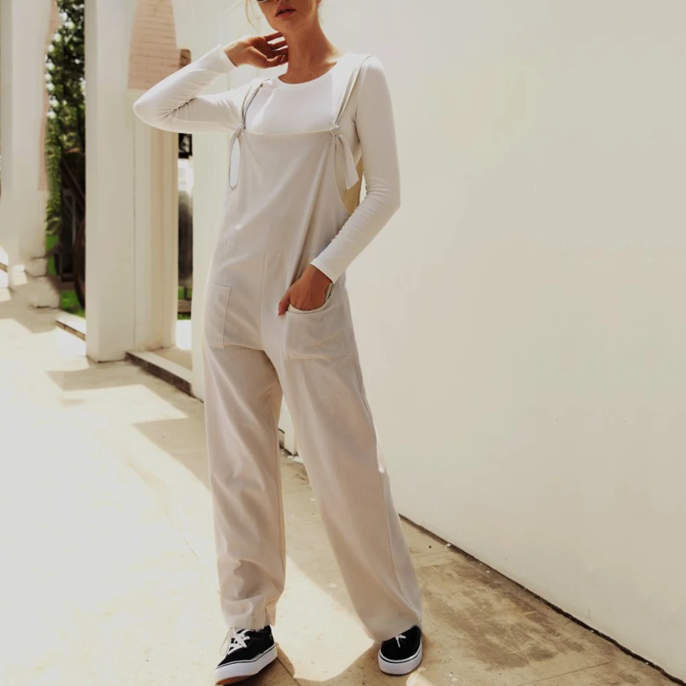 Casual Women Solid Color Multi Pockets Knot Tie Wide Leg Loose Overalls Jumpsuit