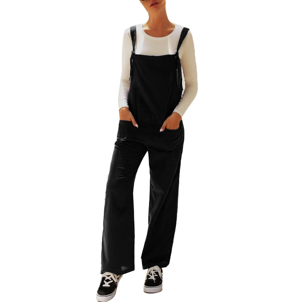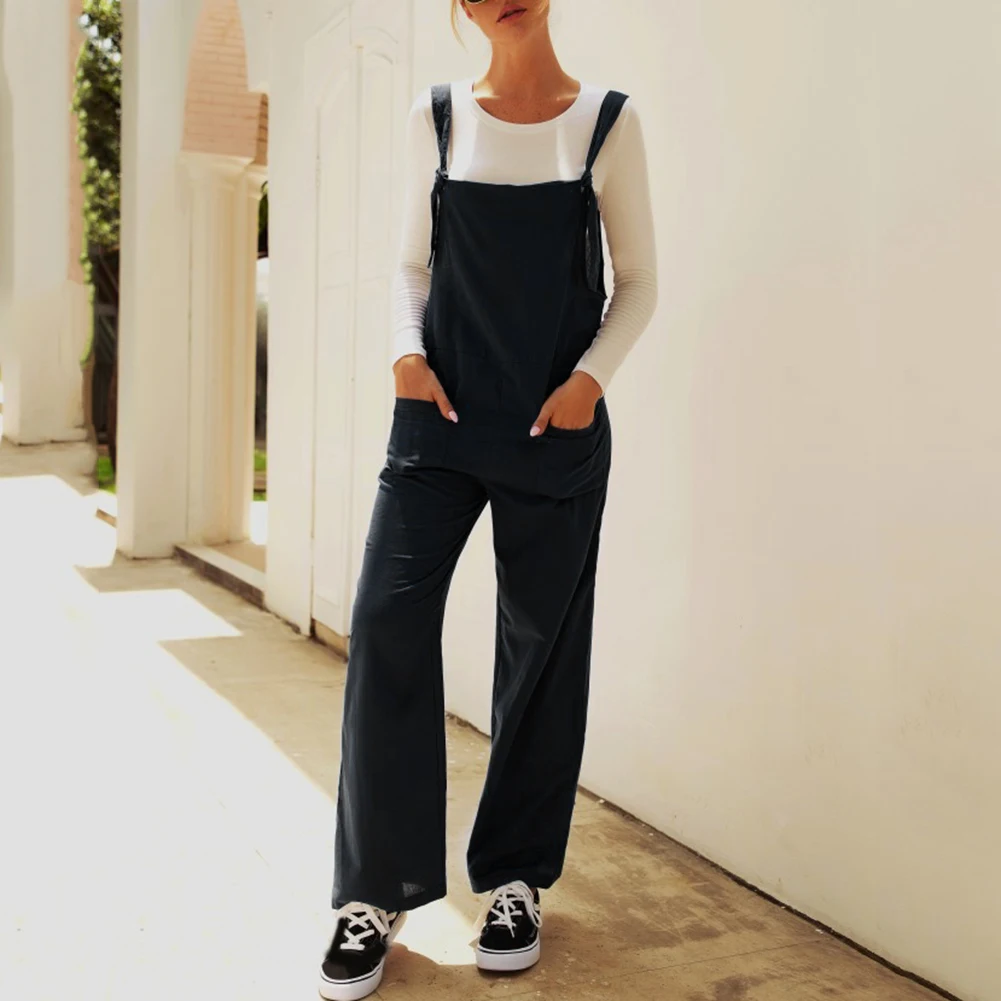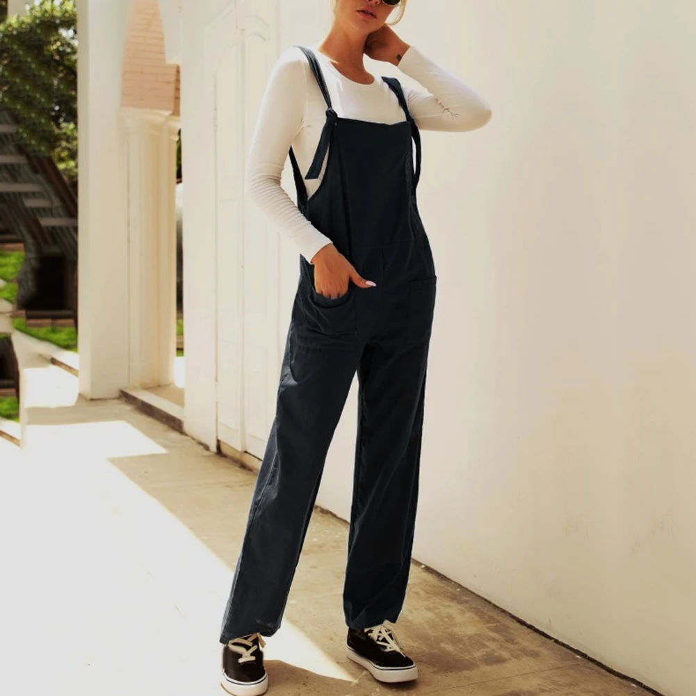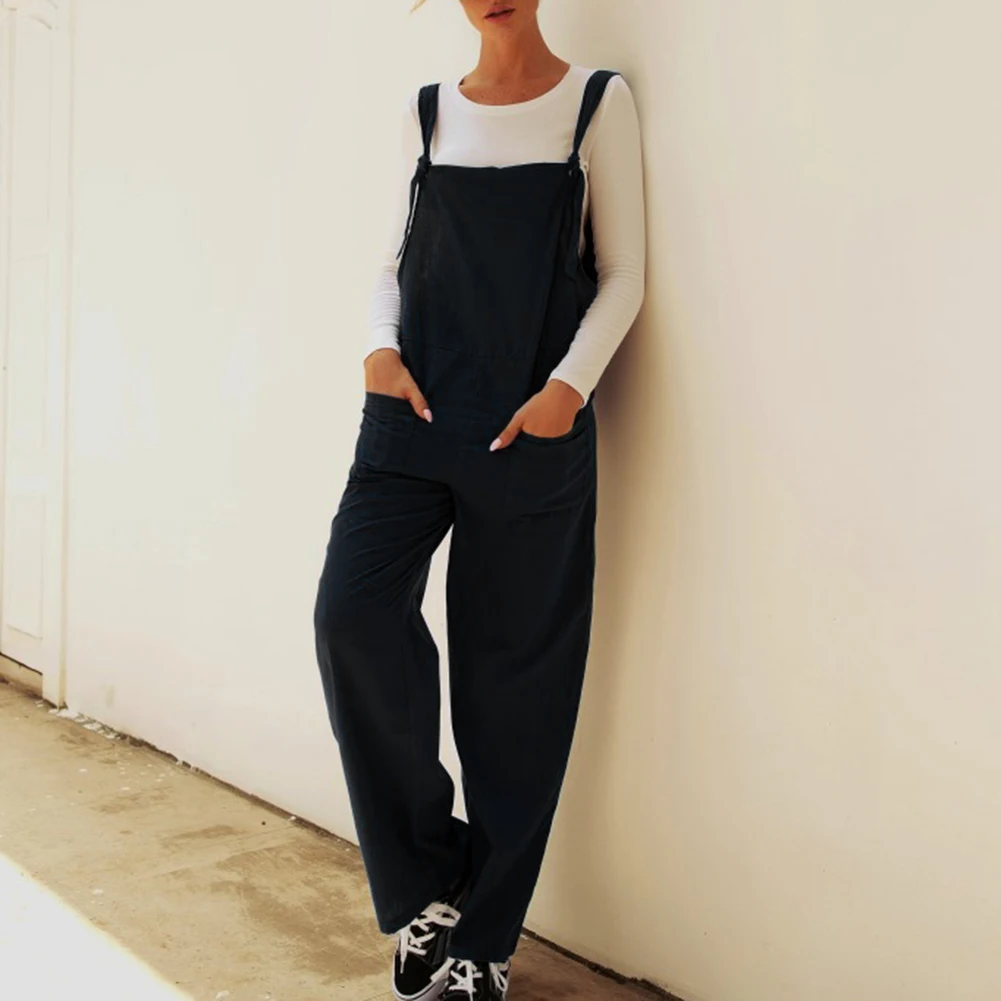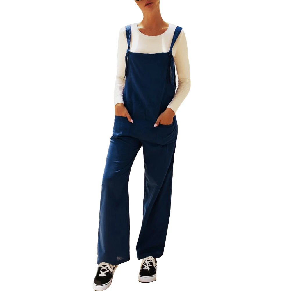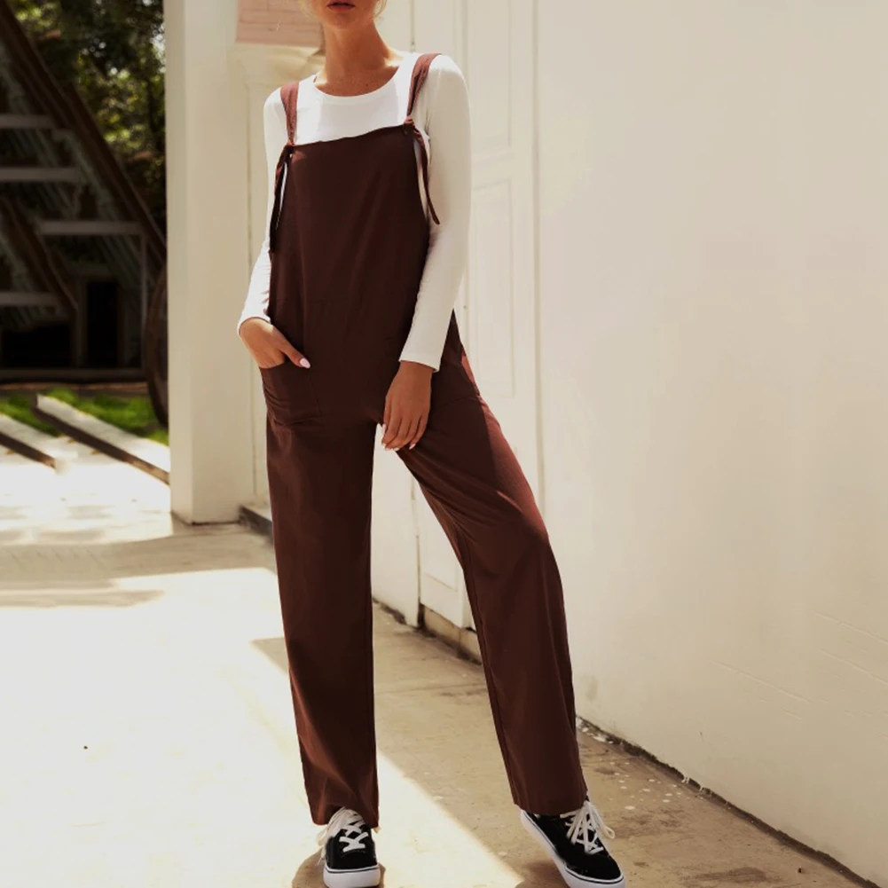 Casual Women Solid Color Multi Pockets Knot Tie Wide Leg Loose Overalls Jumpsuit