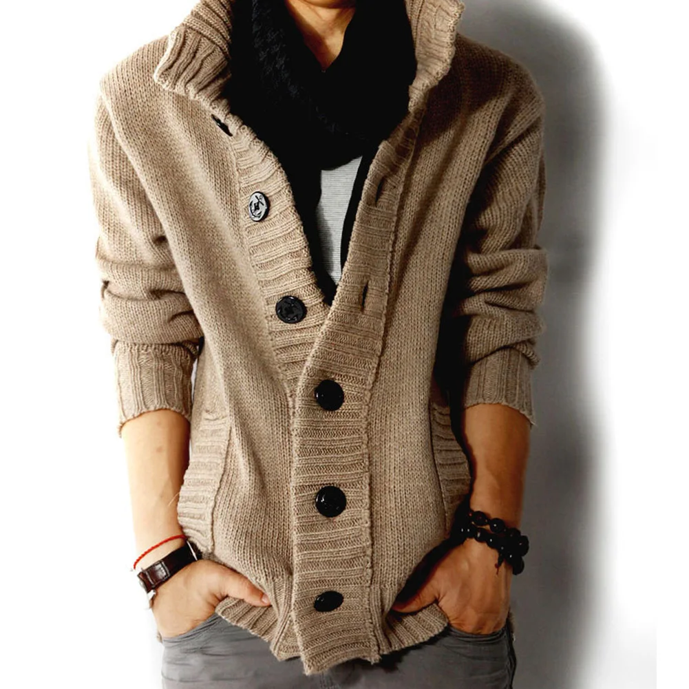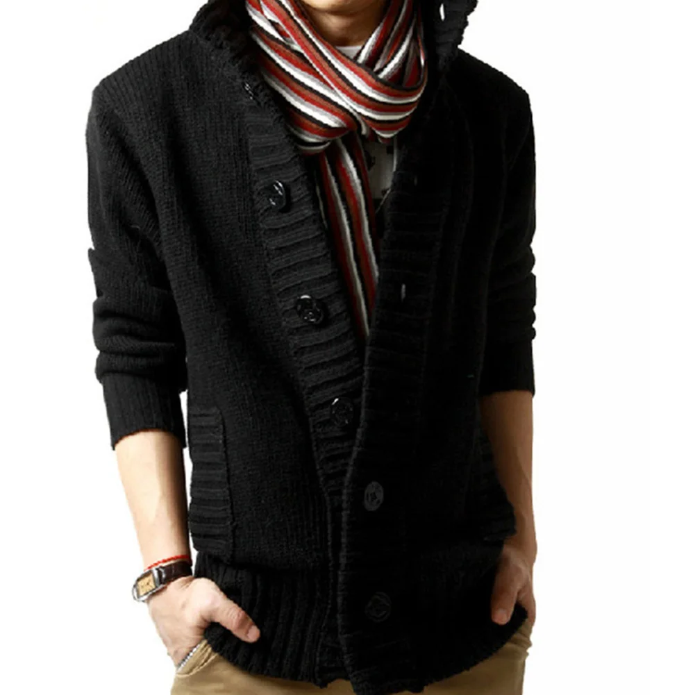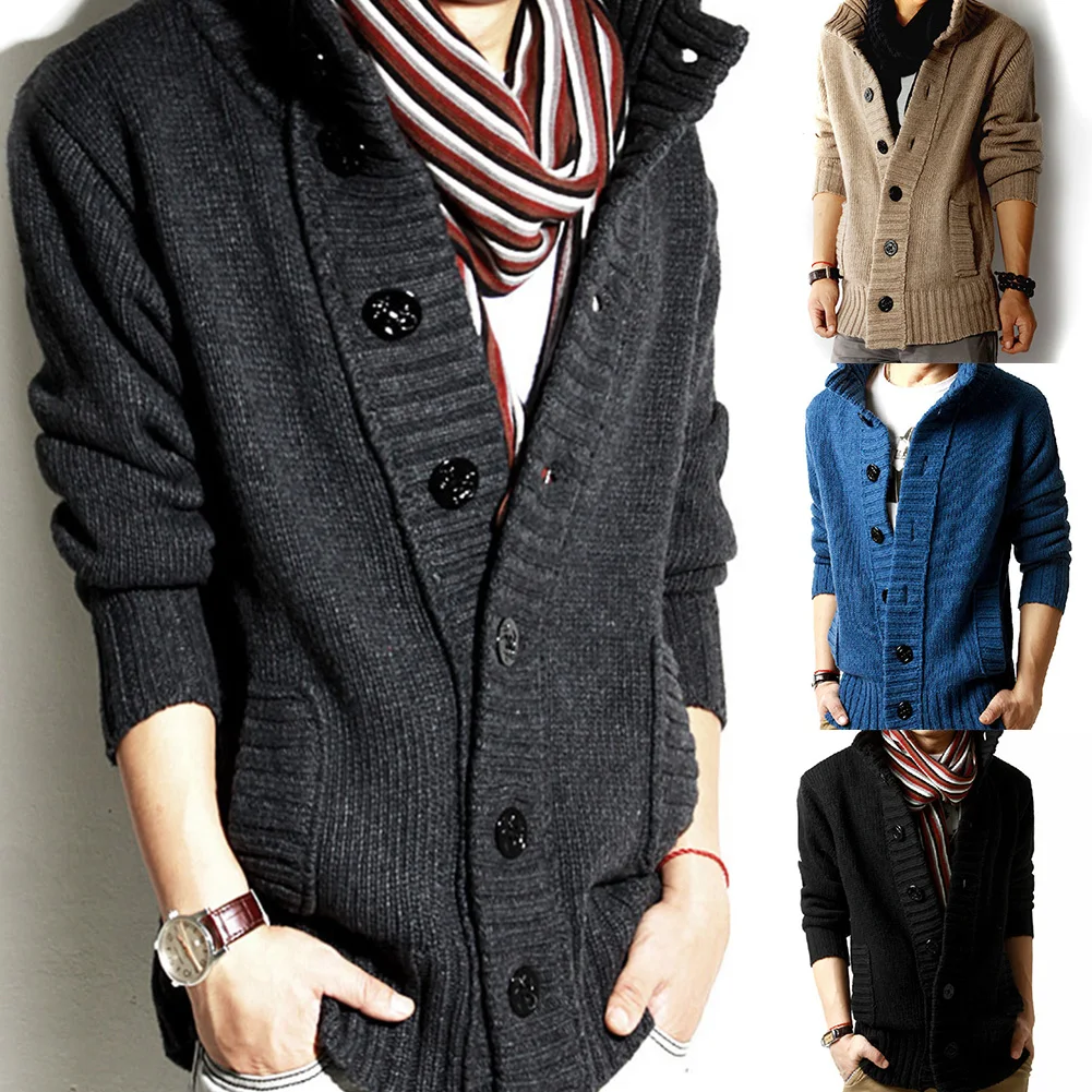 Мужской осенний вязаный свитер на пуговицах с воротником-стойкой и карманами; Утолщенное теплое пальто
