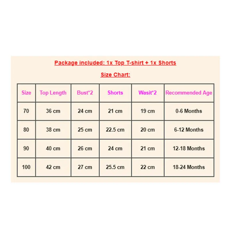 Размеры Топ Длина Размер бюста * 2 Шорты Обхват талии * 2 Рекомендуемый возраст 70 36 см 24 см 21 см 19 см Для детей от 0 до 6 месяцев 80 38 см 25 см 22,5 см 20 см 6-12 месяцев 90 40 см 26 см 24 см 21 см 12-18 месяцев 100 42 см 27 см 25,5 см 22 см 18-24 месяцев