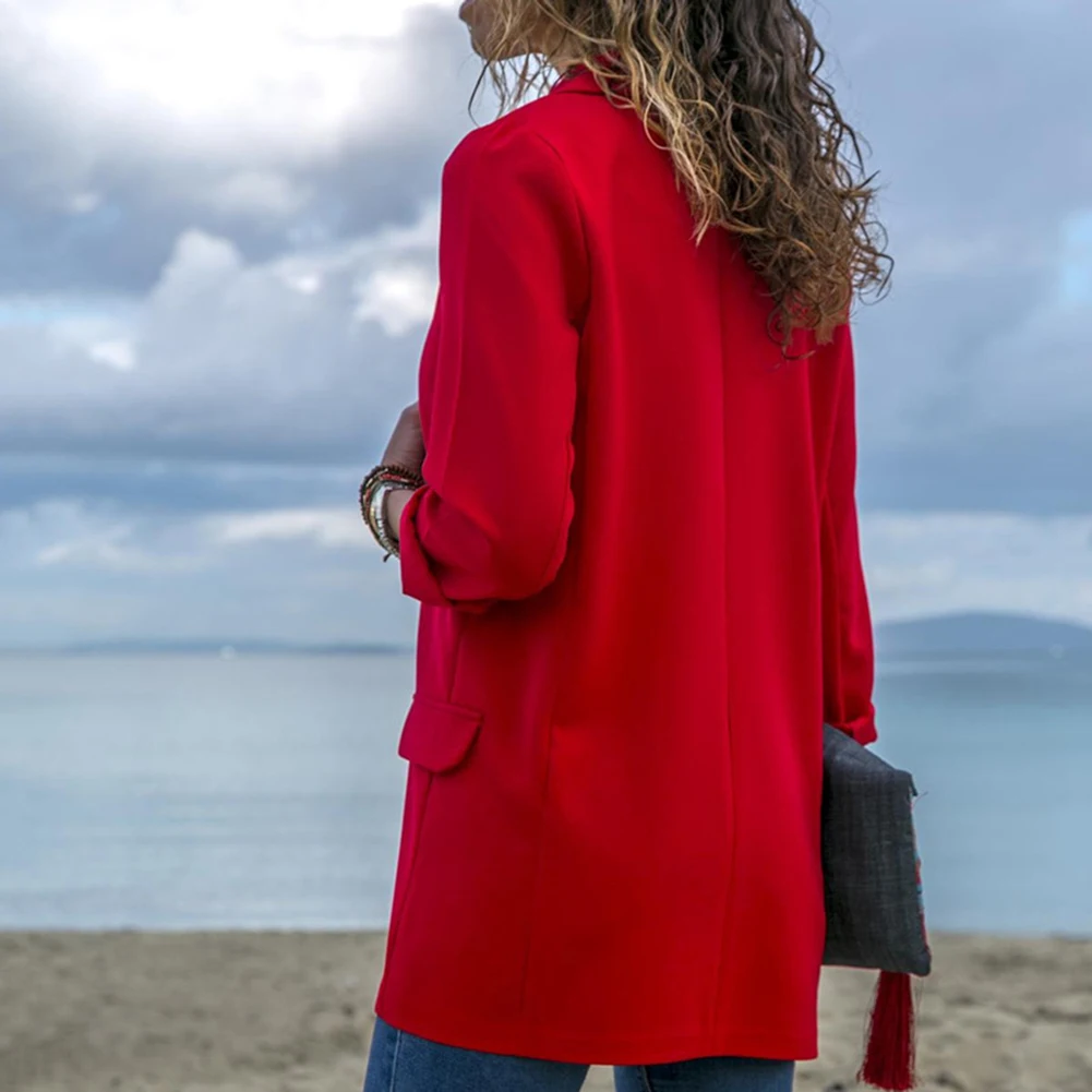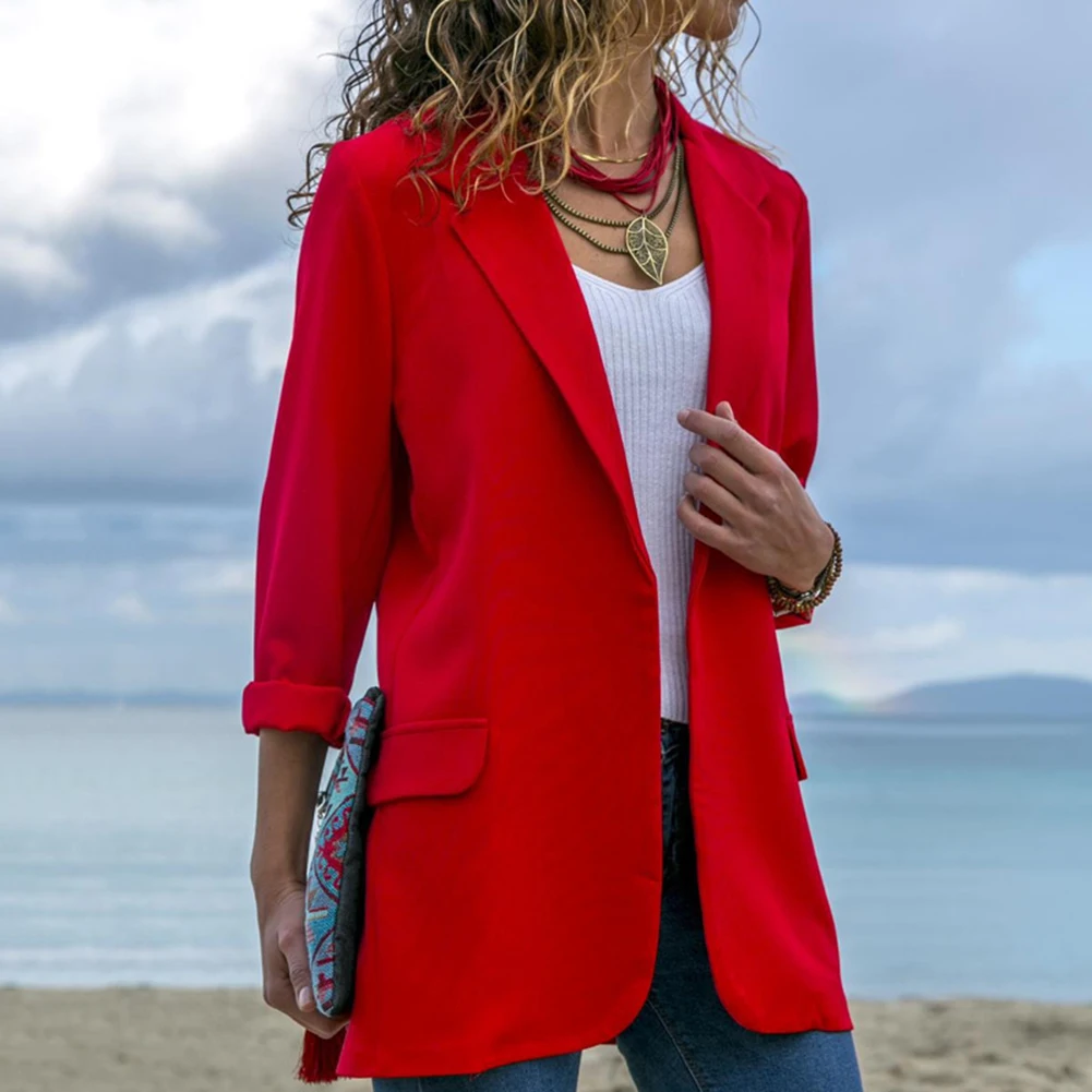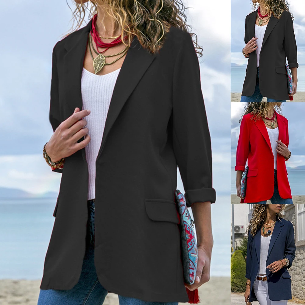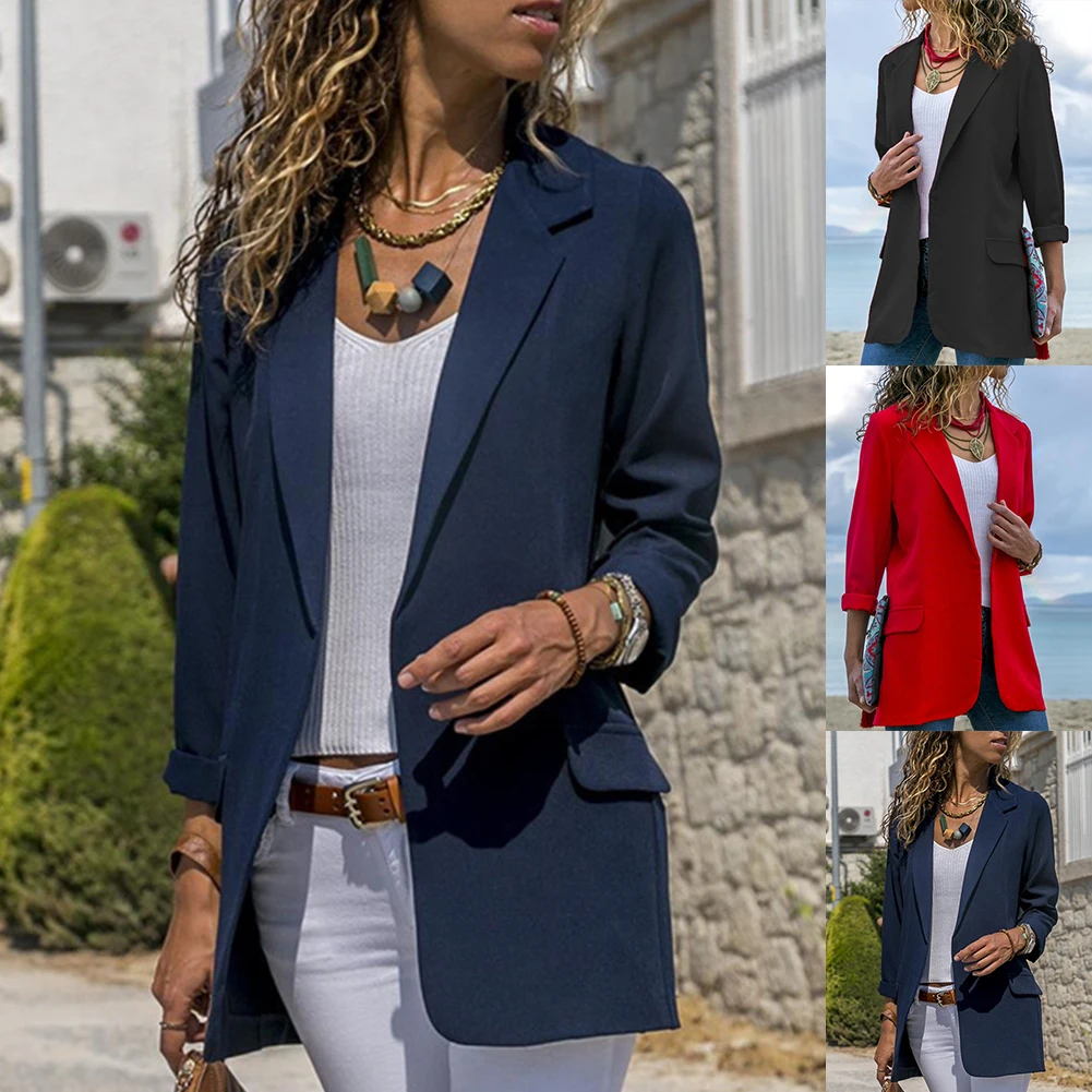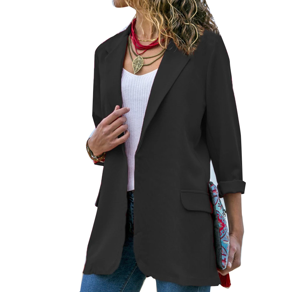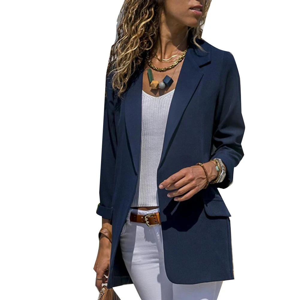 Осенний женский модный однотонный блейзер с отворотом, открытый передний пиджак с длинным рукавом