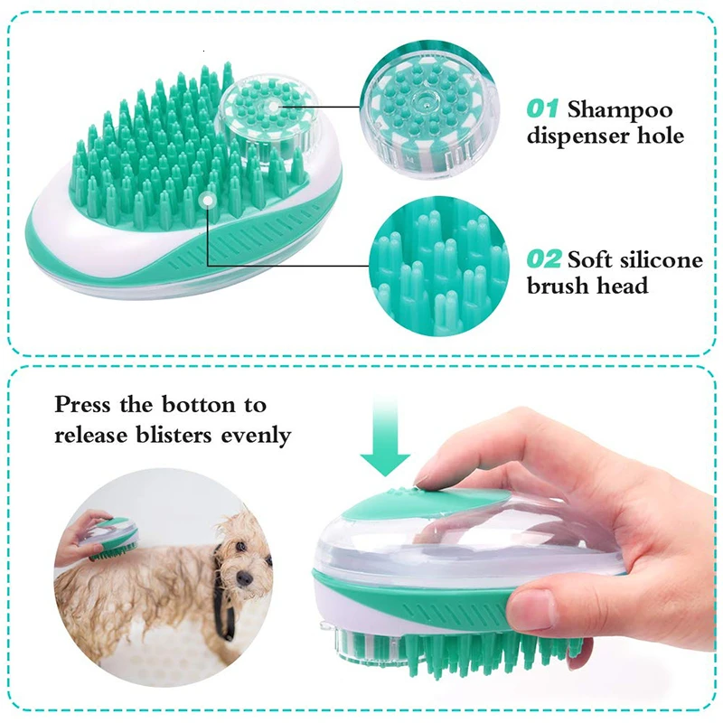 【 2-в-1 массаж BRUSH】Автономный пенопластовый контейнер для удобства использования. Встроенный резервуар для шампуня, надавите на лампочку сверху, чтобы распределить шампунь через щетину. Налейте собачий гель для душа сверху в емкость и Разбавьте водой. Он экономит гель для душа, облегчает создание пены и облегчает чистку. Набор щеток pet perfect отлично подходит для предотвращения кожных заболеваний и увеличения кровообращения, массажные частицы не поцарапают домашних животных.