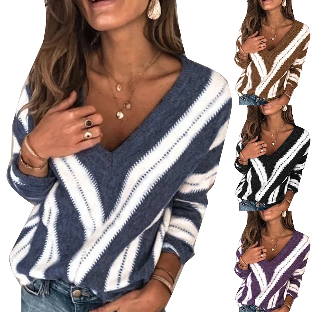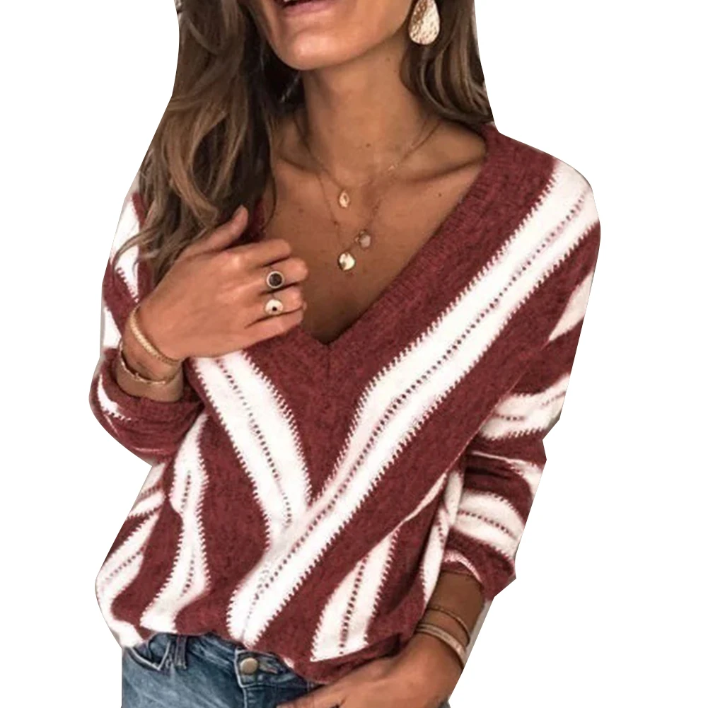 Модный женский свитер свободного размера плюс с длинным рукавом и v-образным вырезом