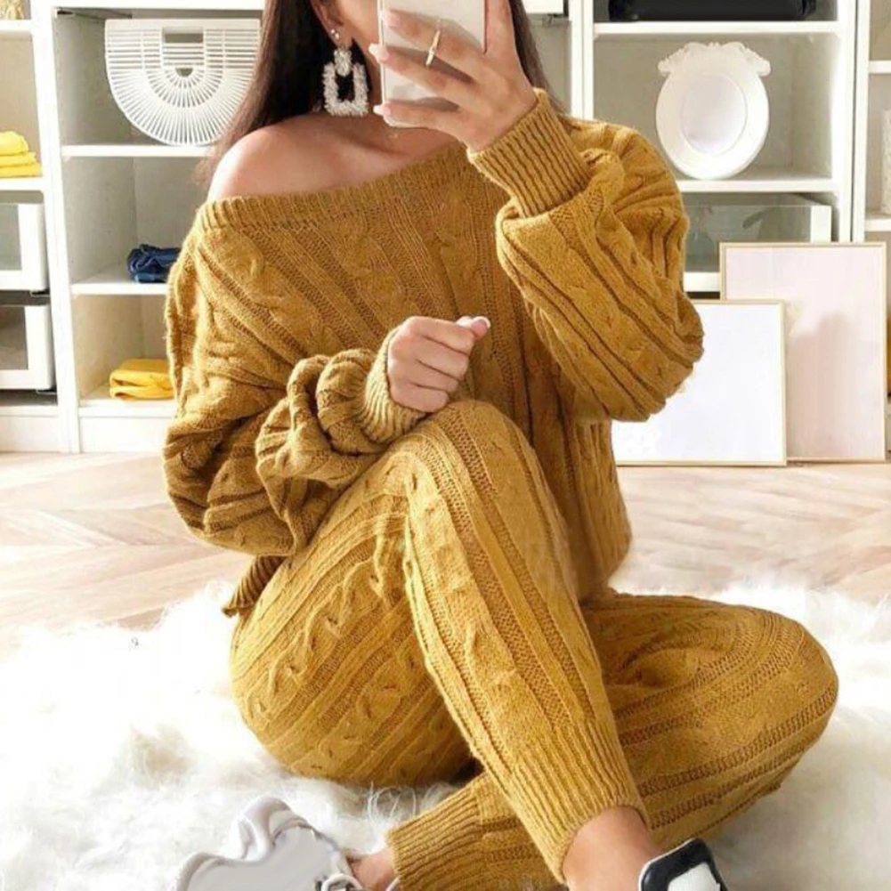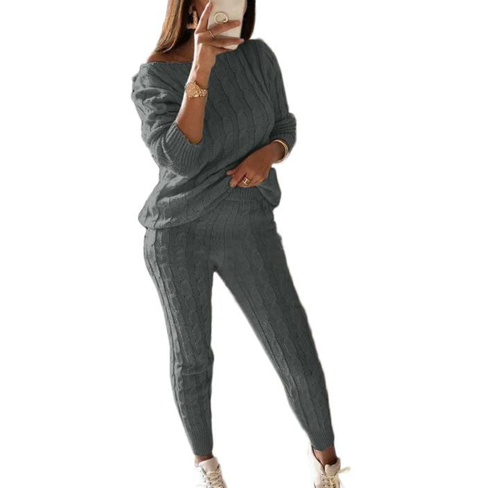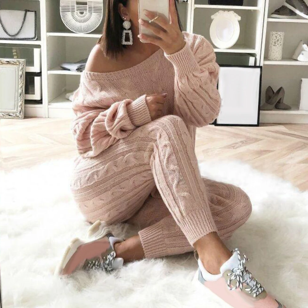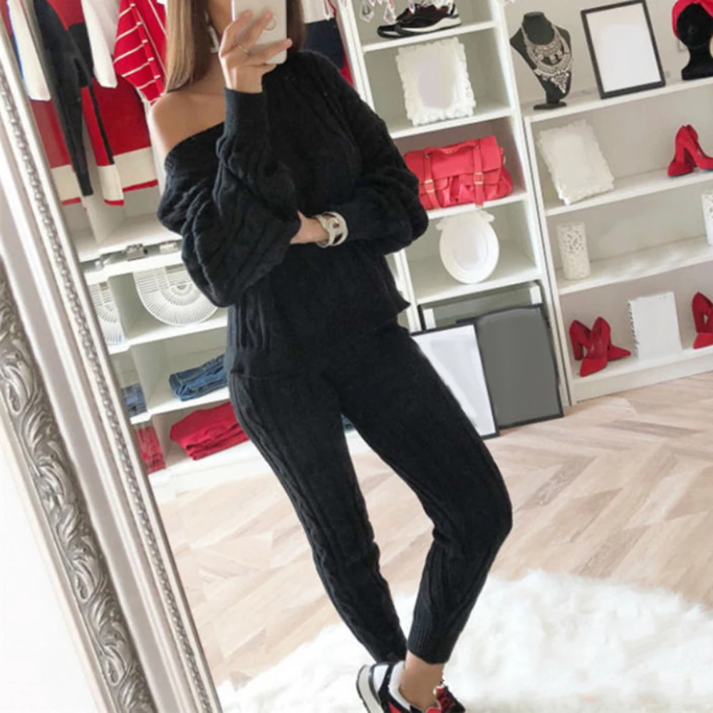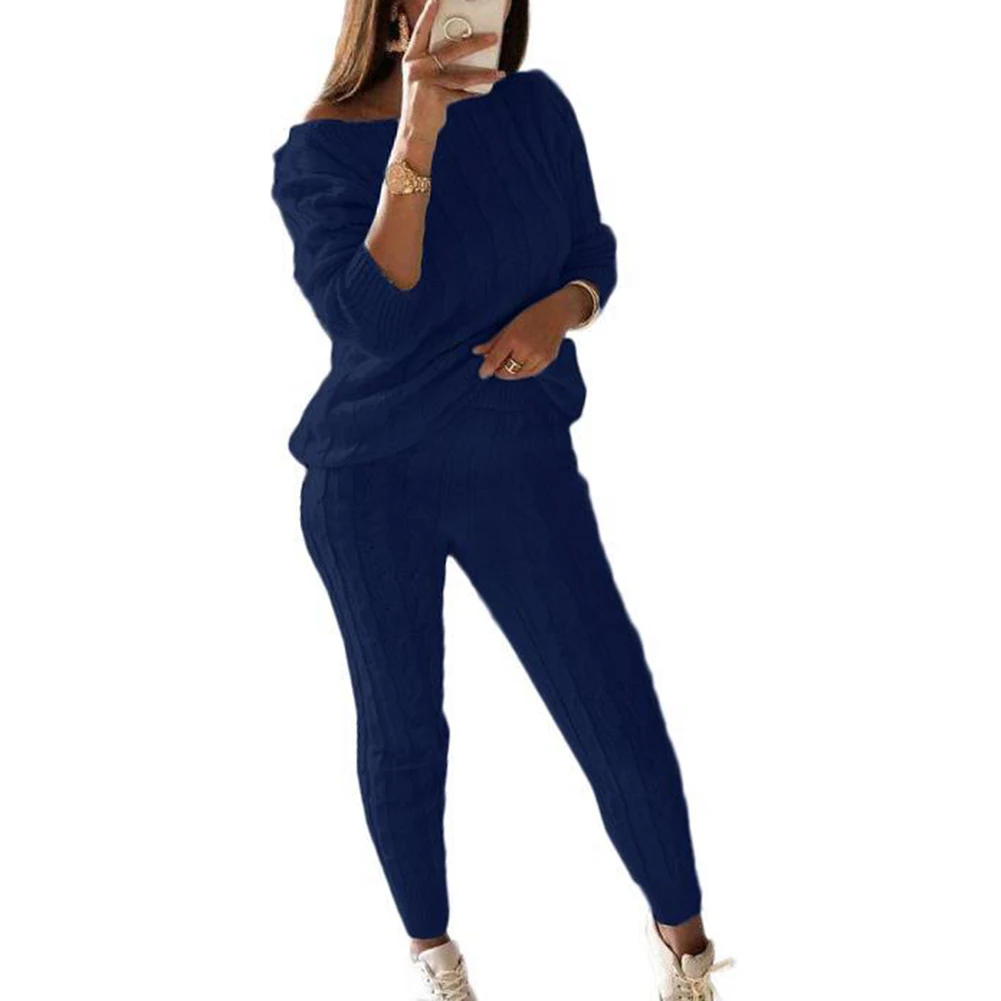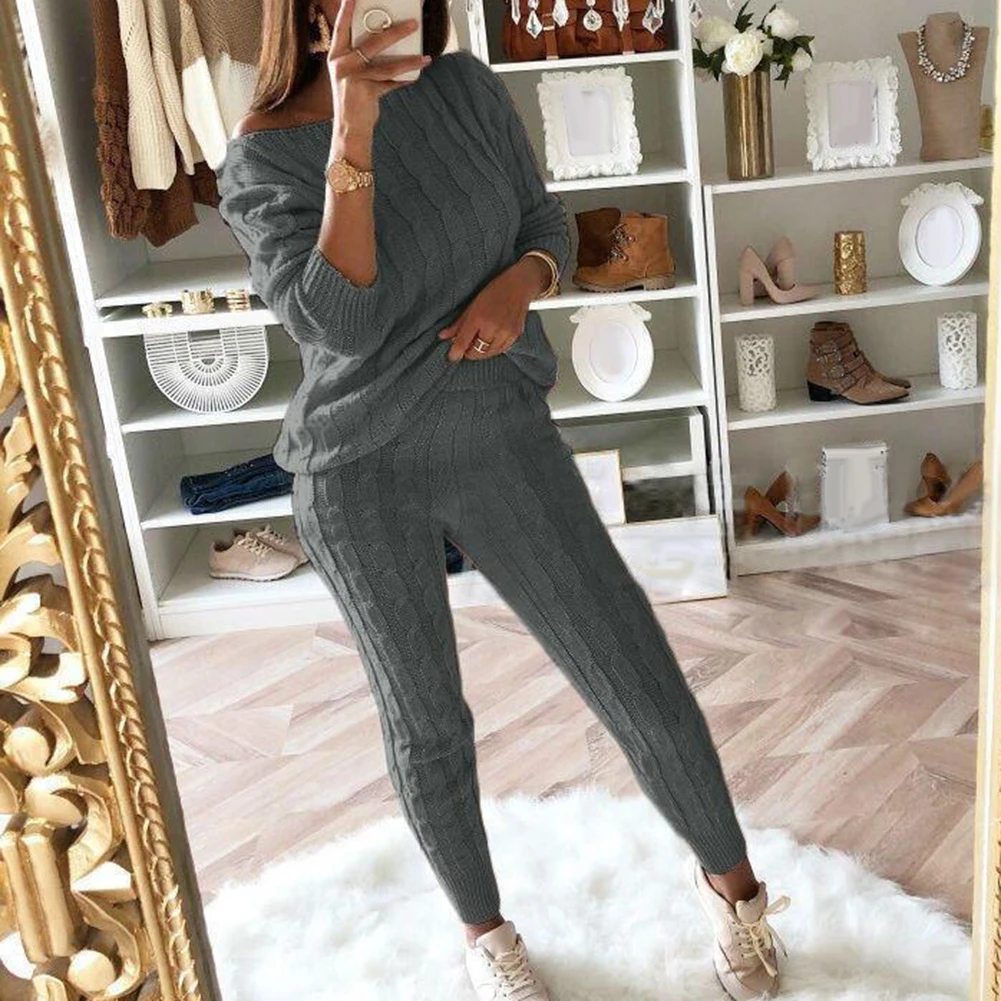 2 шт./компл., зимний женский Однотонный свитер с открытыми плечами и длинными рукавами, трикотажные штаны