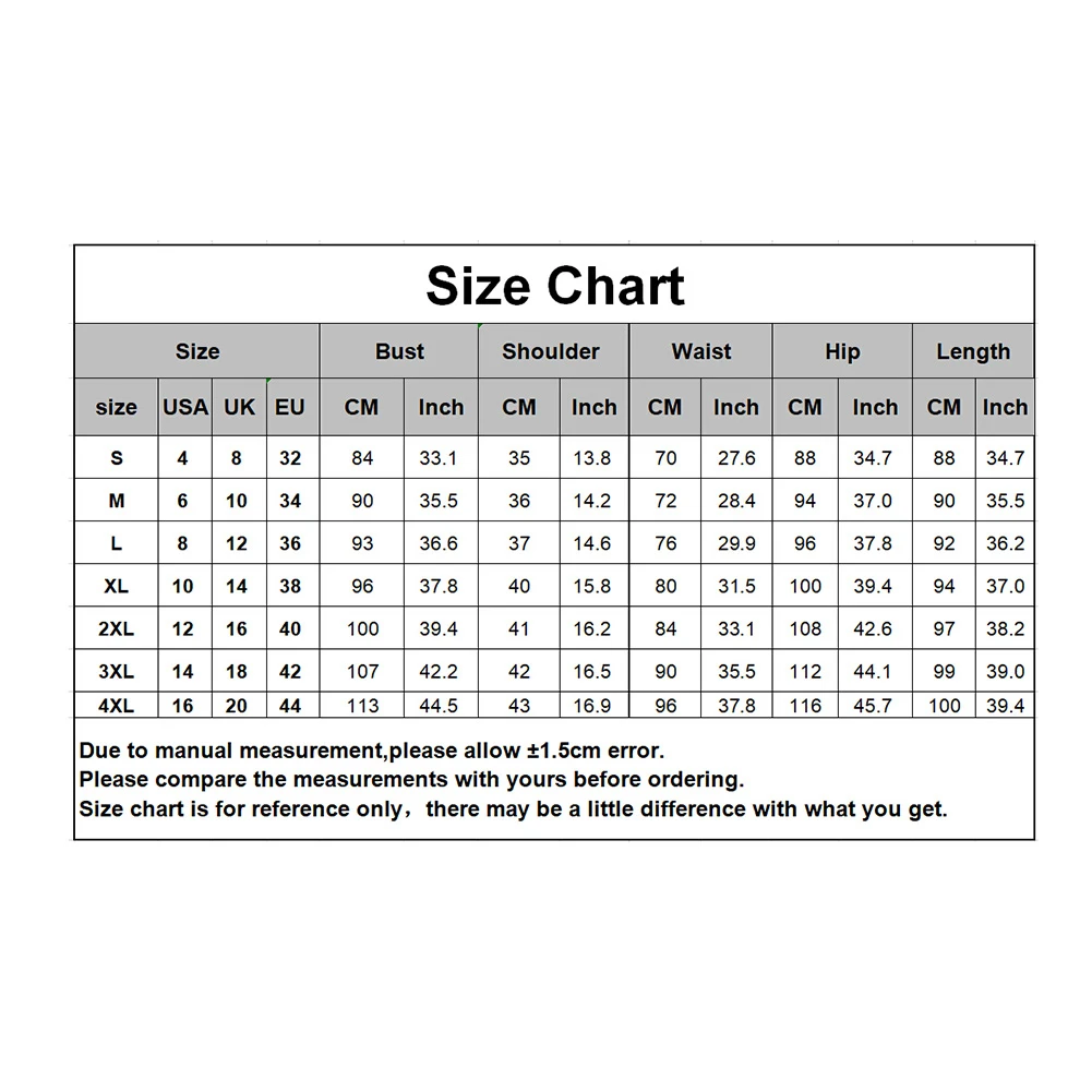 [Наш Размер 2XL] Ширина плеч: 41 см/16,14 дюйма, обхват груди: 100 см/39,37 дюйма, обхват талии: 84 см/33,07 дюйма, обхват бедер: 108 см/42,52 дюйма, длина: 97 см/38,19 ", разрез: 24 см/9,45" (прибл.)