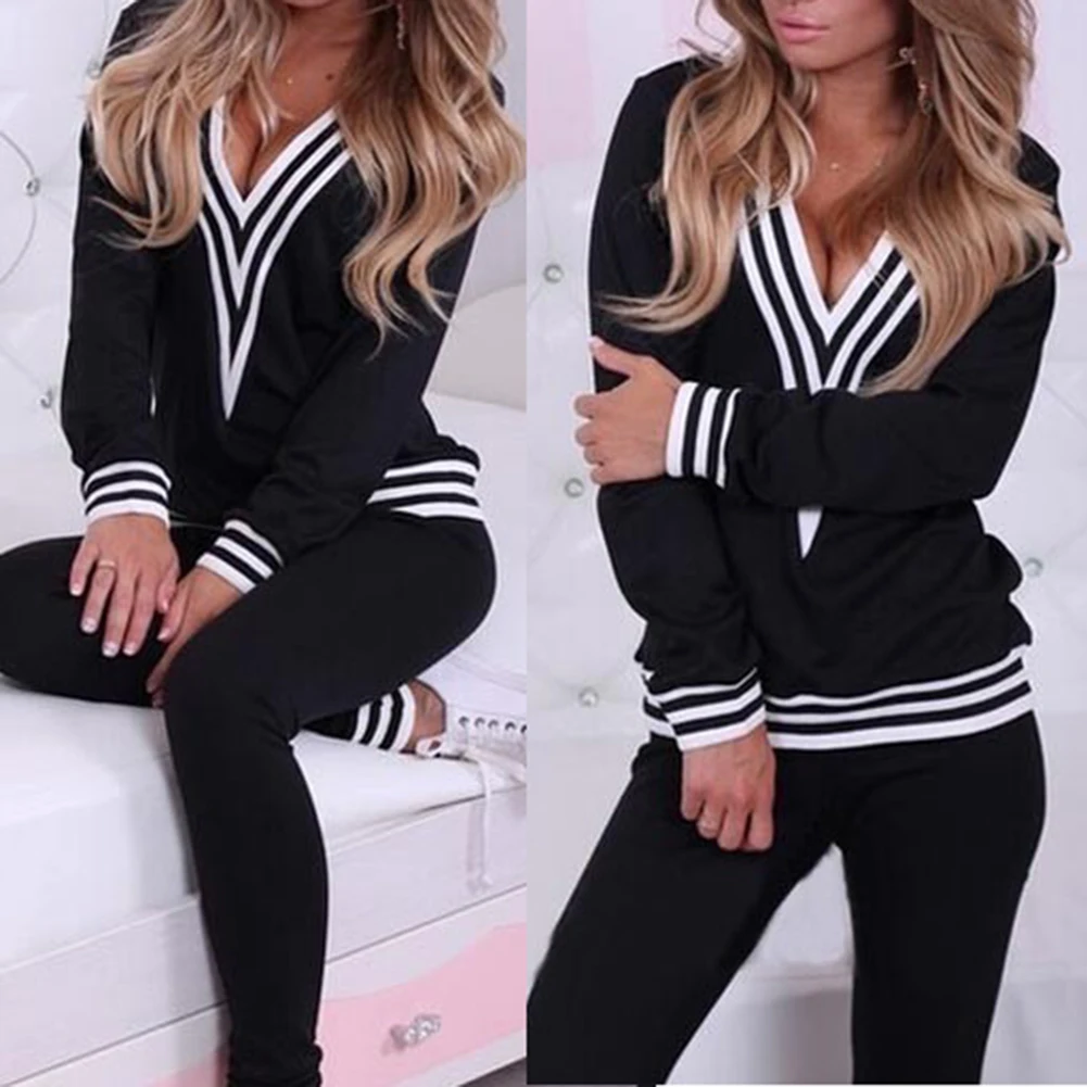 2 шт./компл. Для женщин Повседневное подол в полоску с v-образным вырезом Свитшот и штаны, хлопковый спортивный костюм, тренировочный костюм