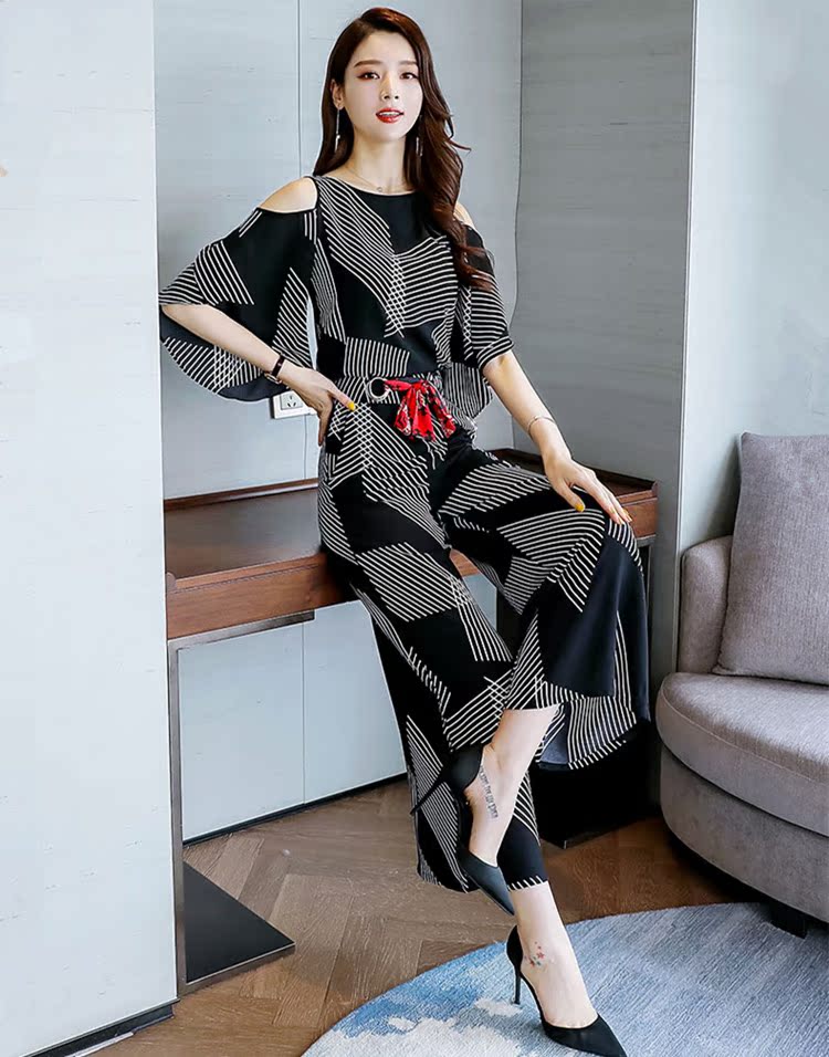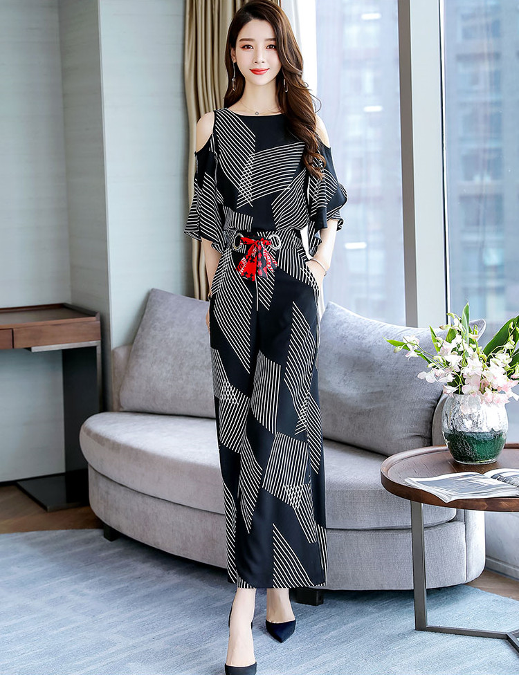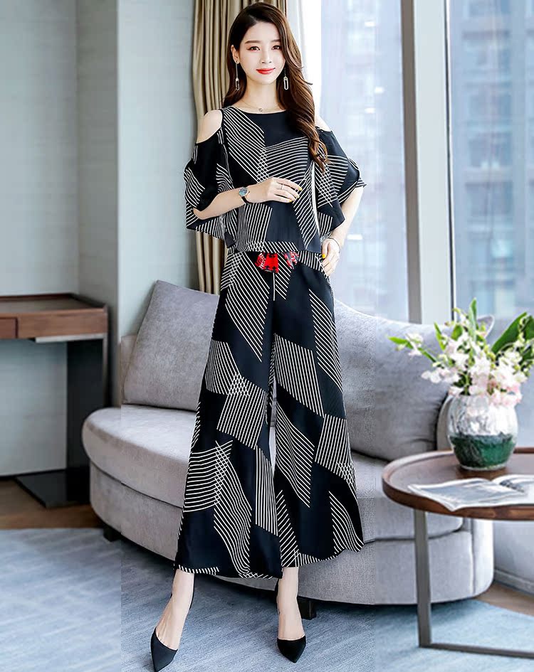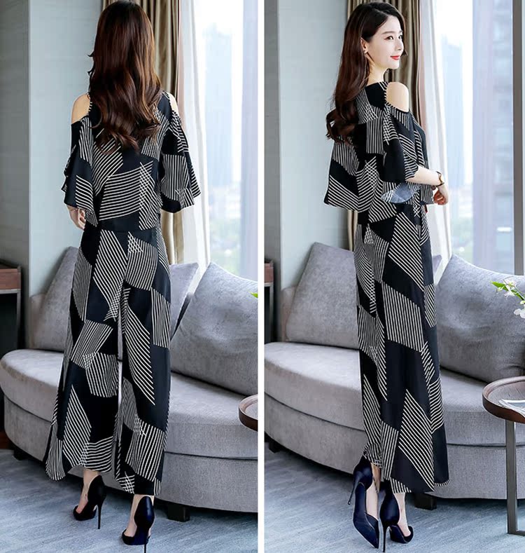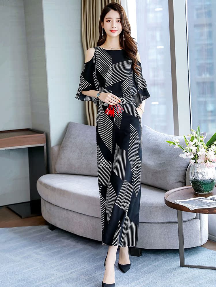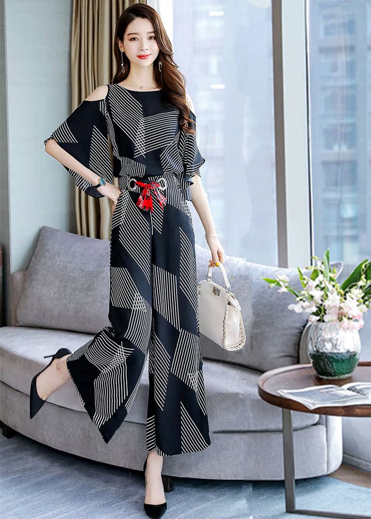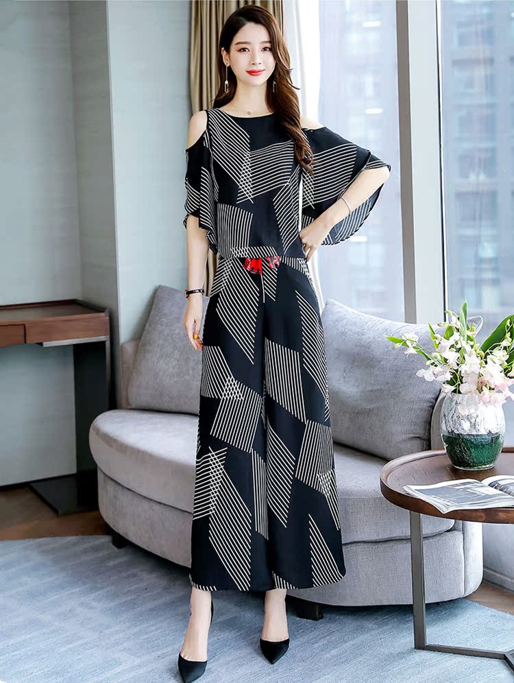 2020 летний черный комплект из двух предметов с принтом для женщин, большие размеры, открытые топы и широкие брюки, элегантные женские комплекты DG135