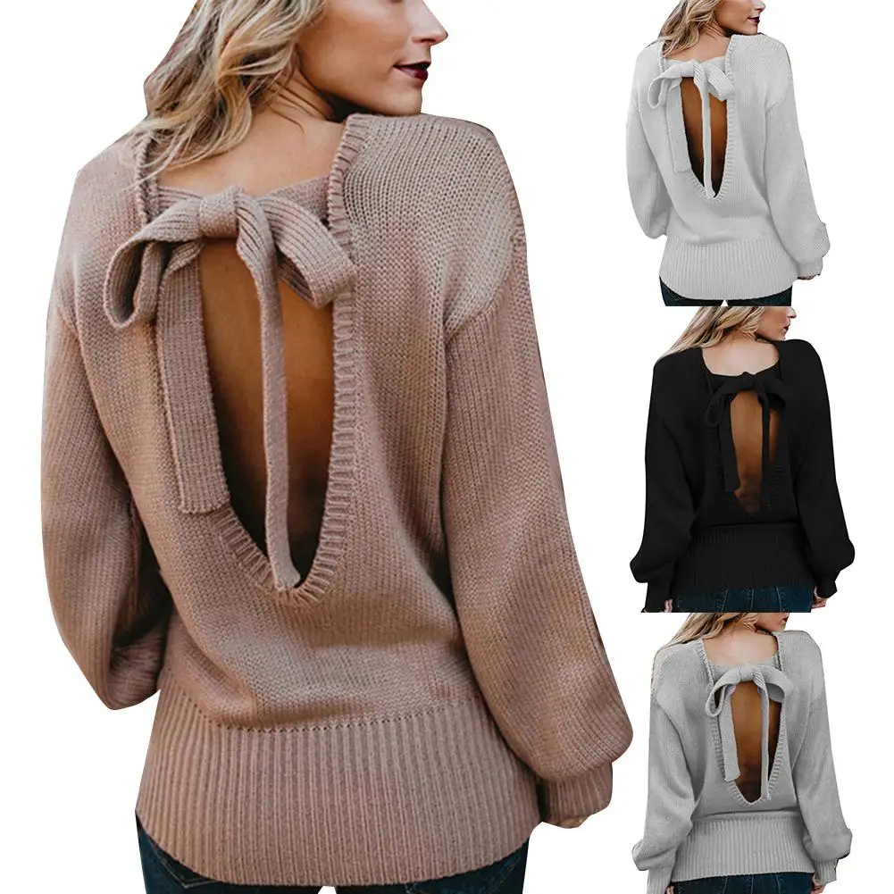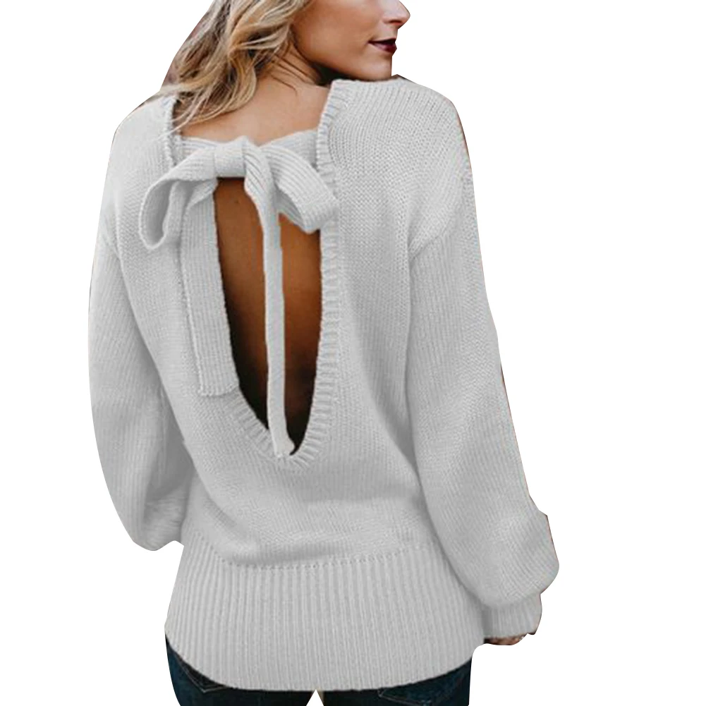 Модный женский осенний однотонный трикотажный свитер с круглым вырезом и открытой спиной и галстуком-бабочкой