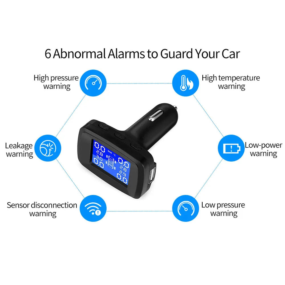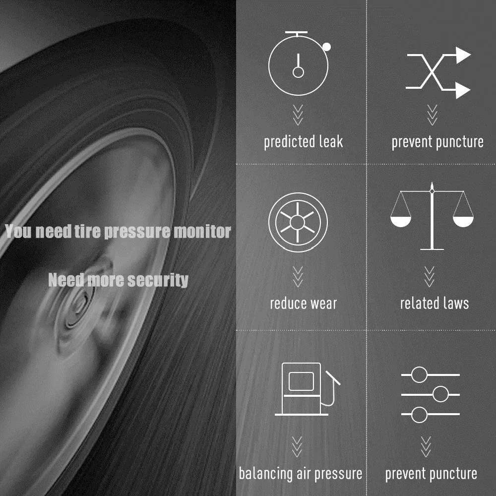 * Мониторинг состояния шин в реальном времени. Когда давление в шинах и температура слишком высоки или слишком низки, на дисплее будет звучать сигнал тревоги и отображаться давление в шинах и температура в режиме реального времени.