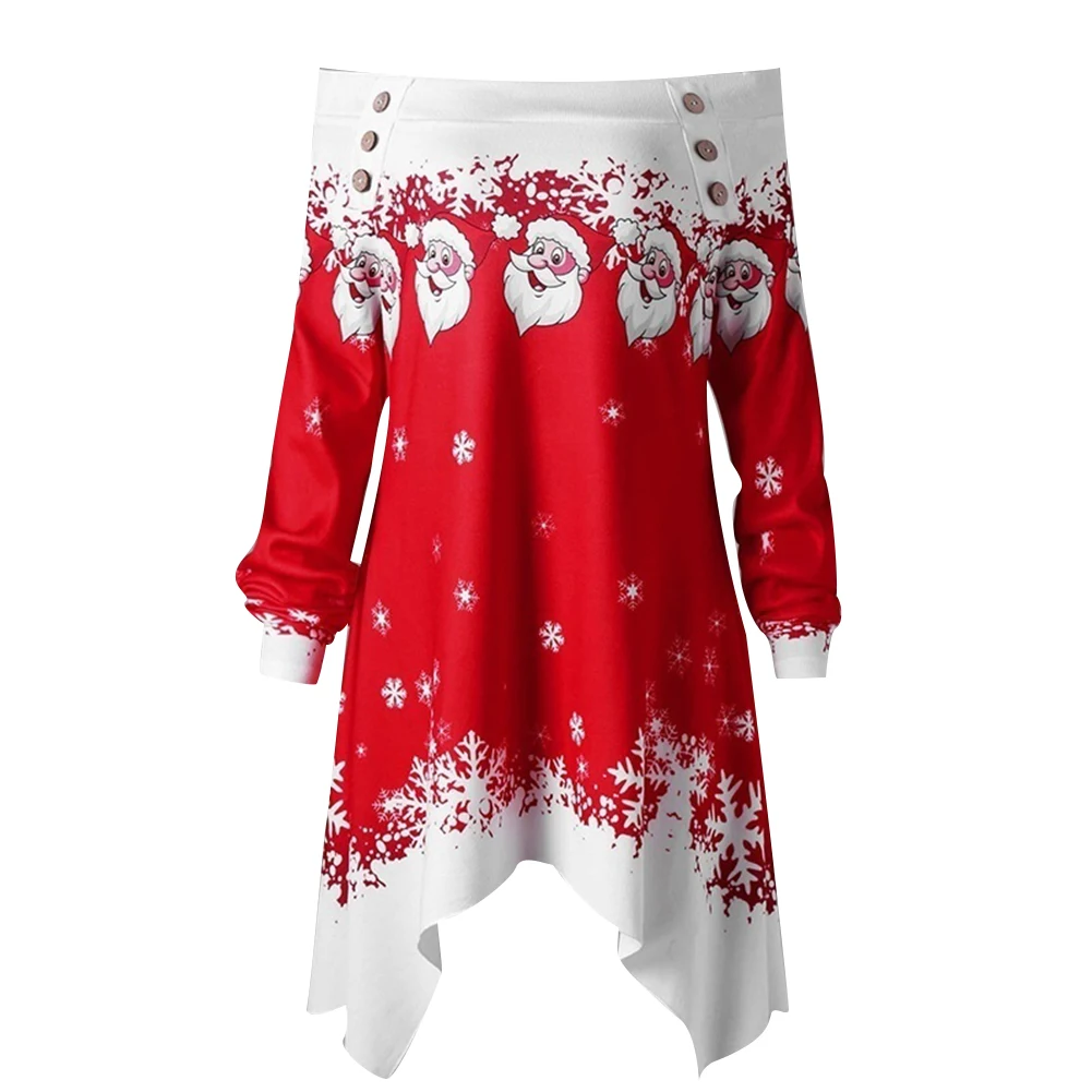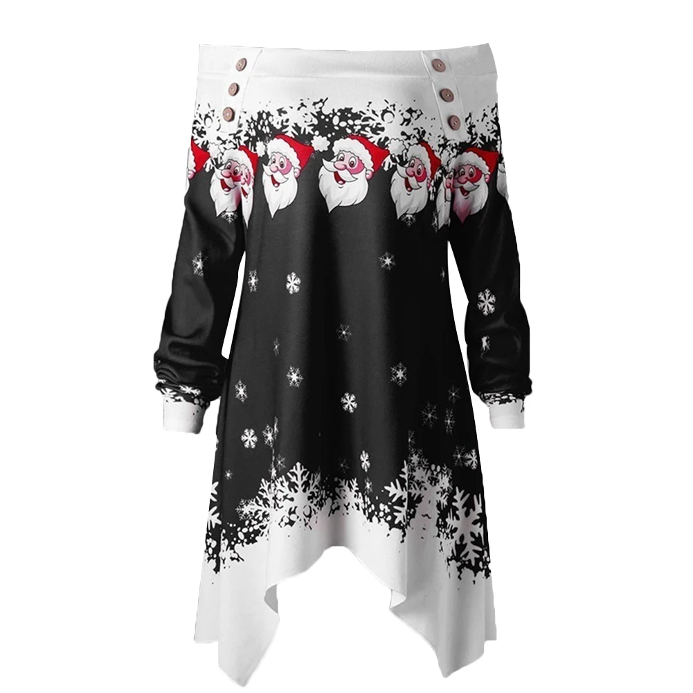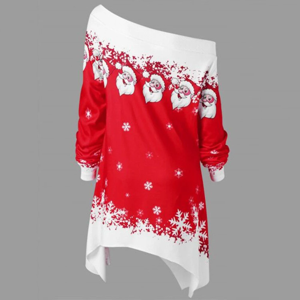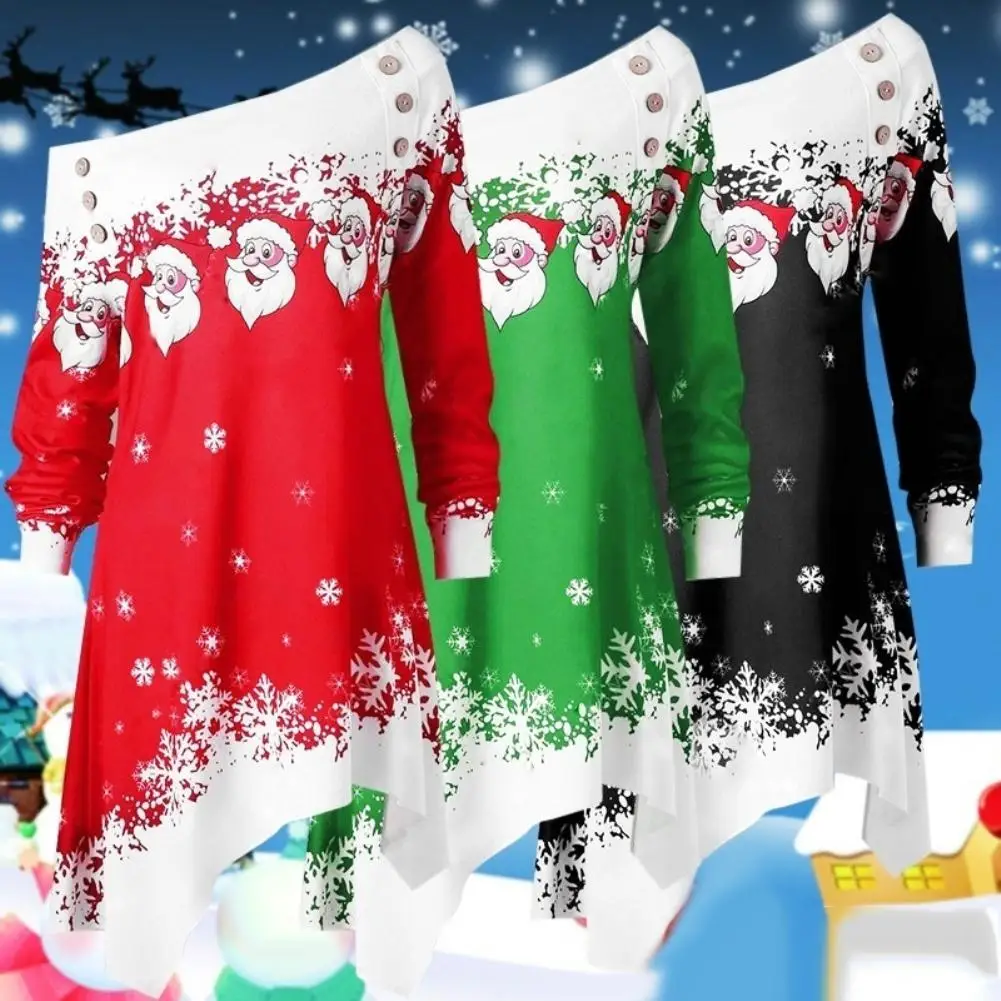 Особенности: с открытыми плечами; Принт Санта-Клауса со снежинками; Асимметричный подол
