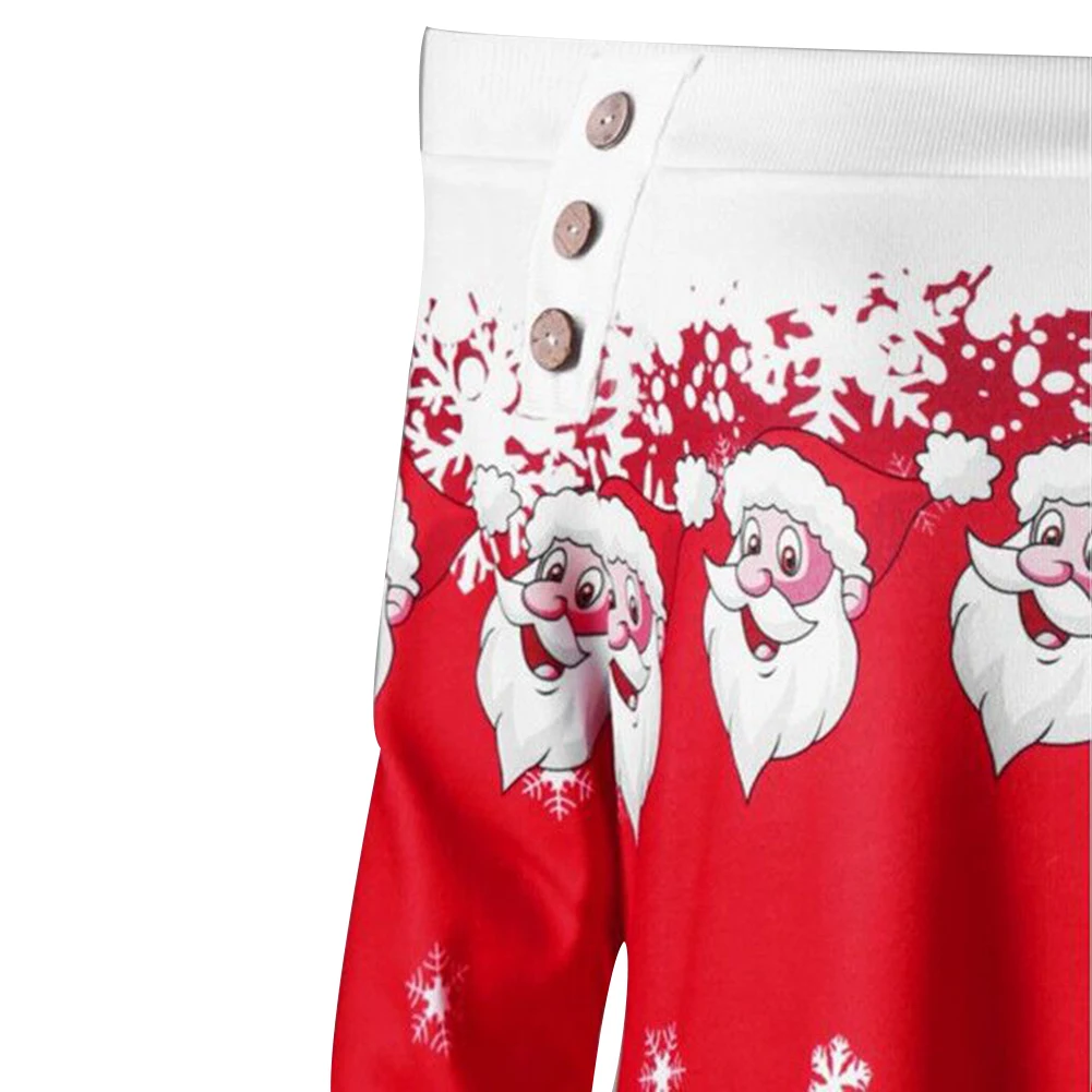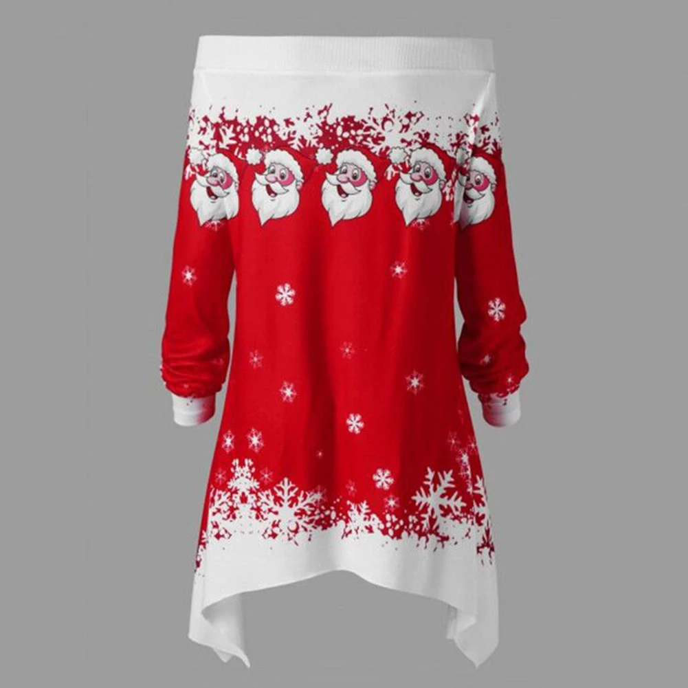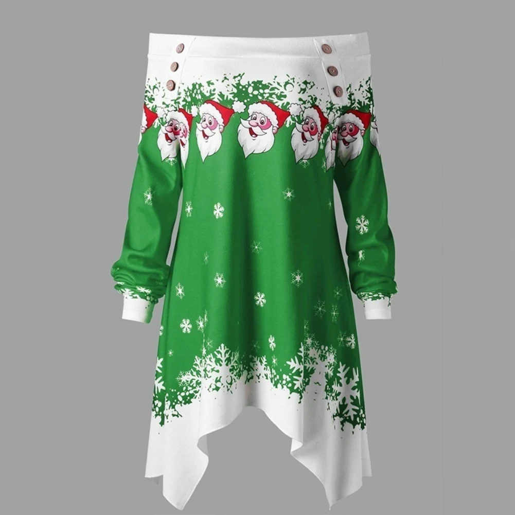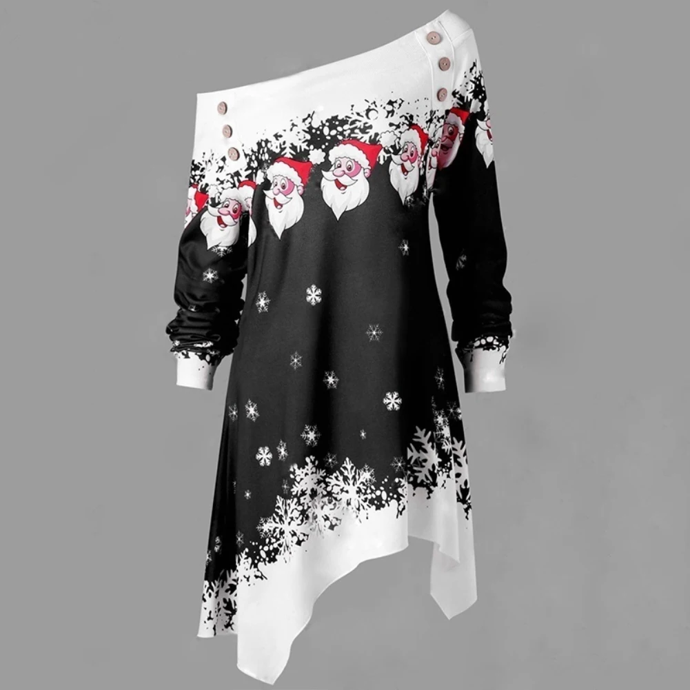 Особенности: с открытыми плечами; Принт Санта-Клауса со снежинками; Асимметричный подол