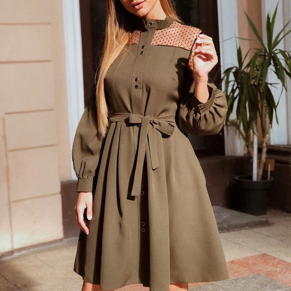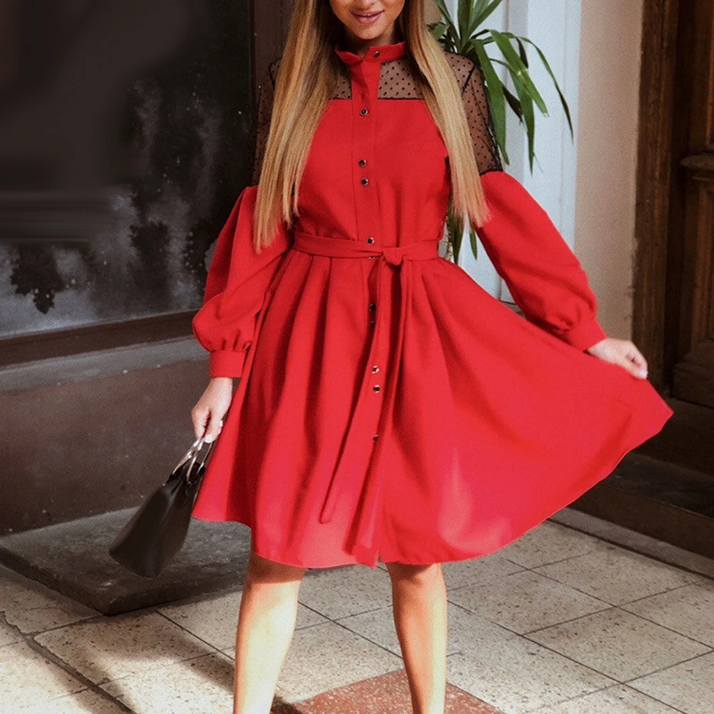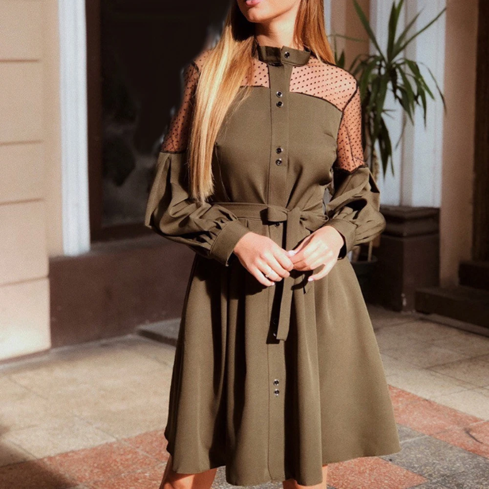 Женское однобортное платье с пышными рукавами и кружевной вышивкой, пояс на талии