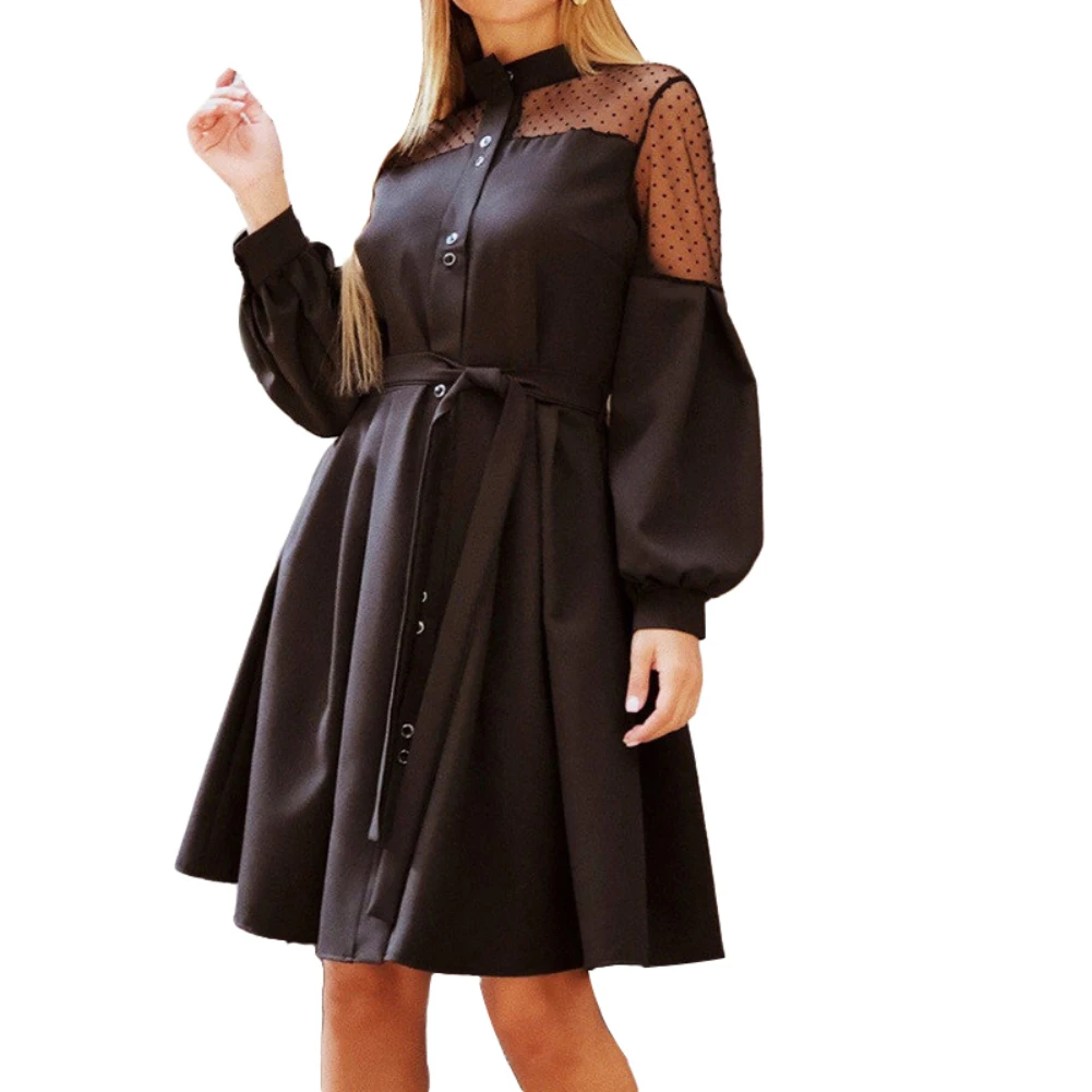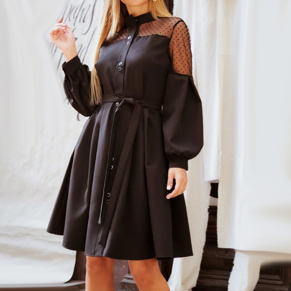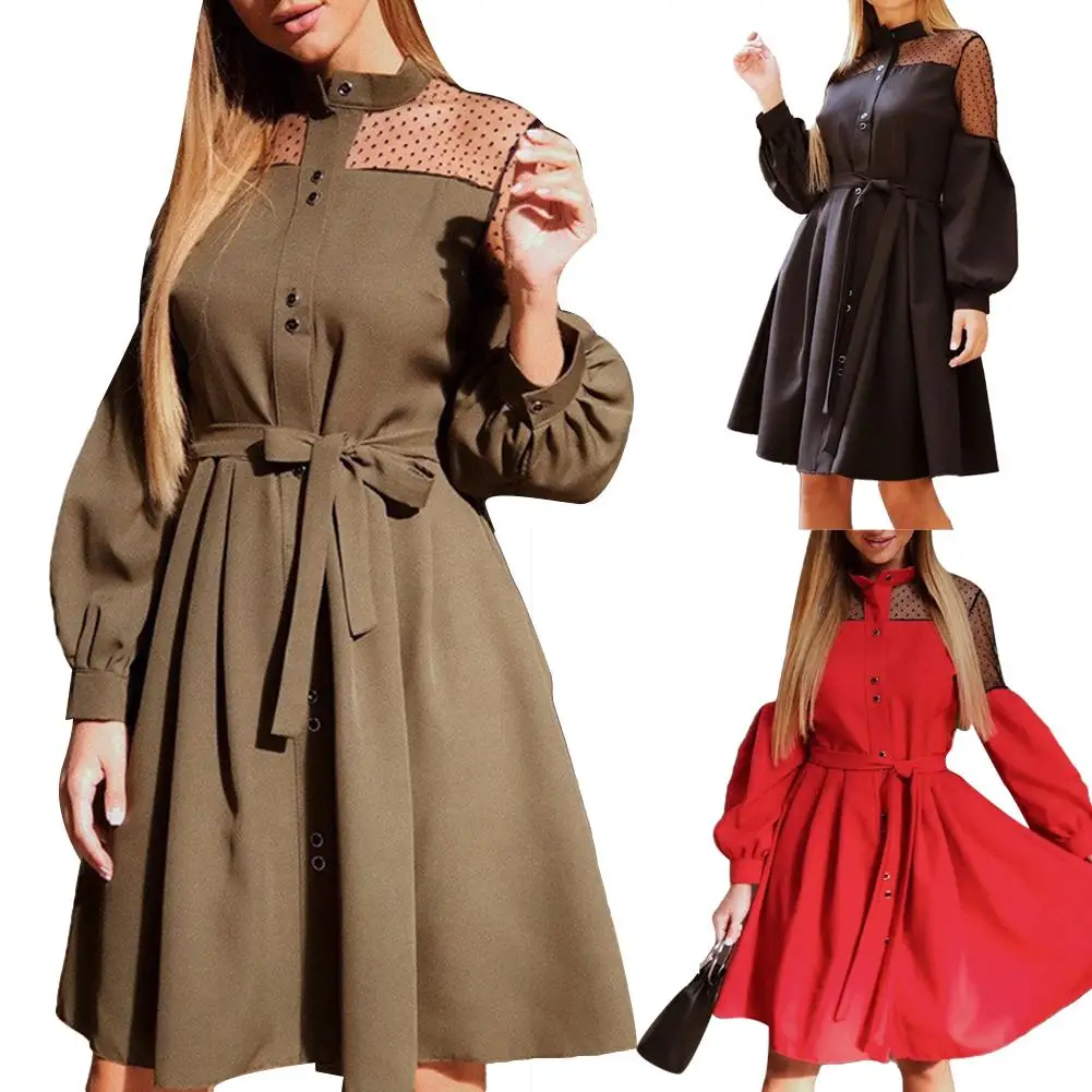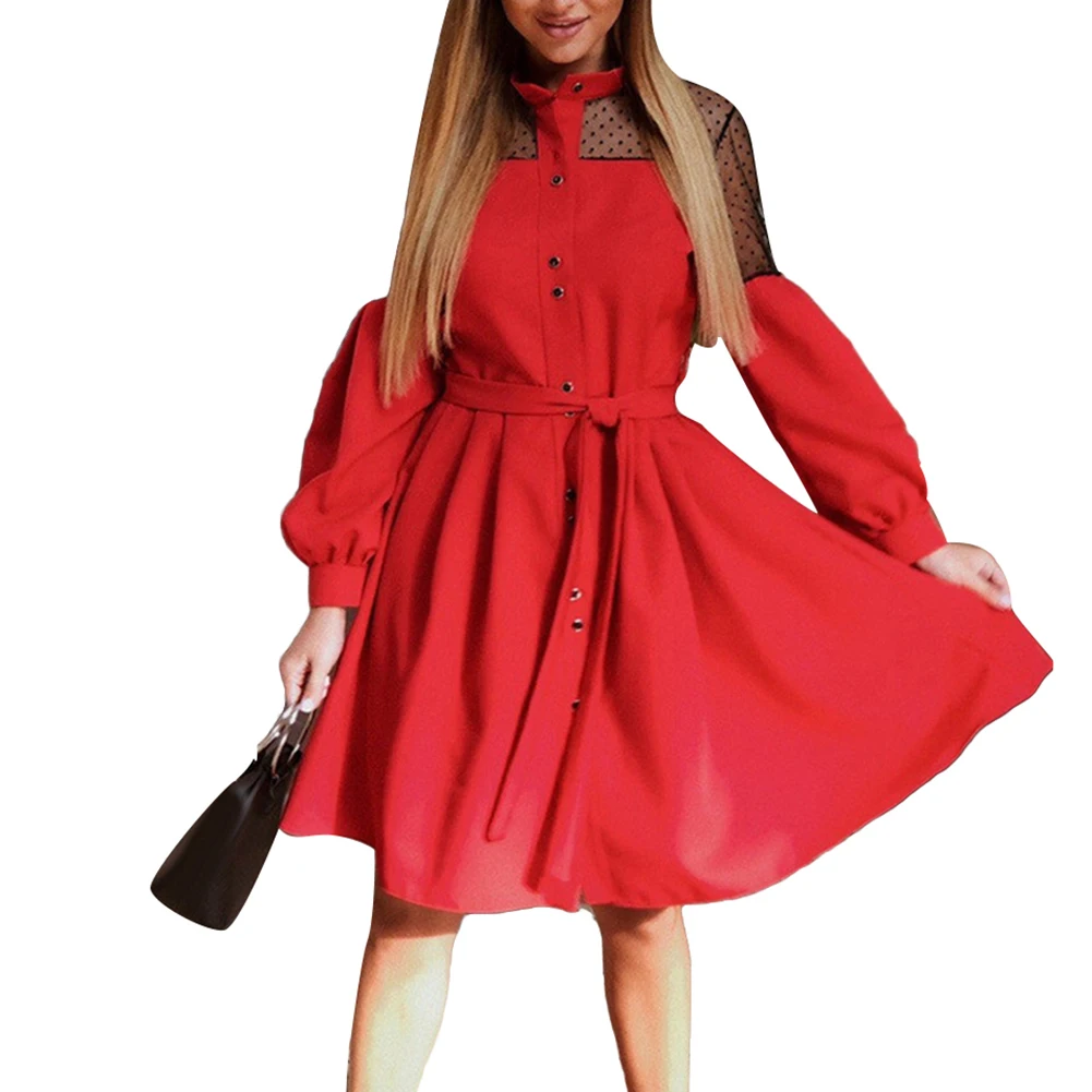 Женское однобортное платье с пышными рукавами и кружевной вышивкой, пояс на талии