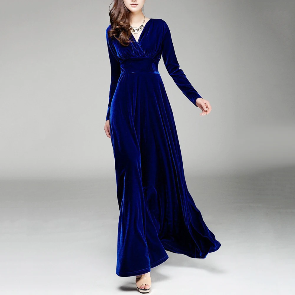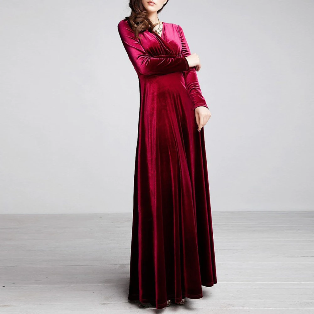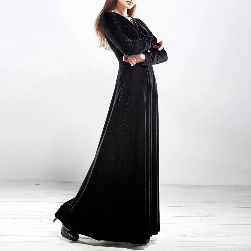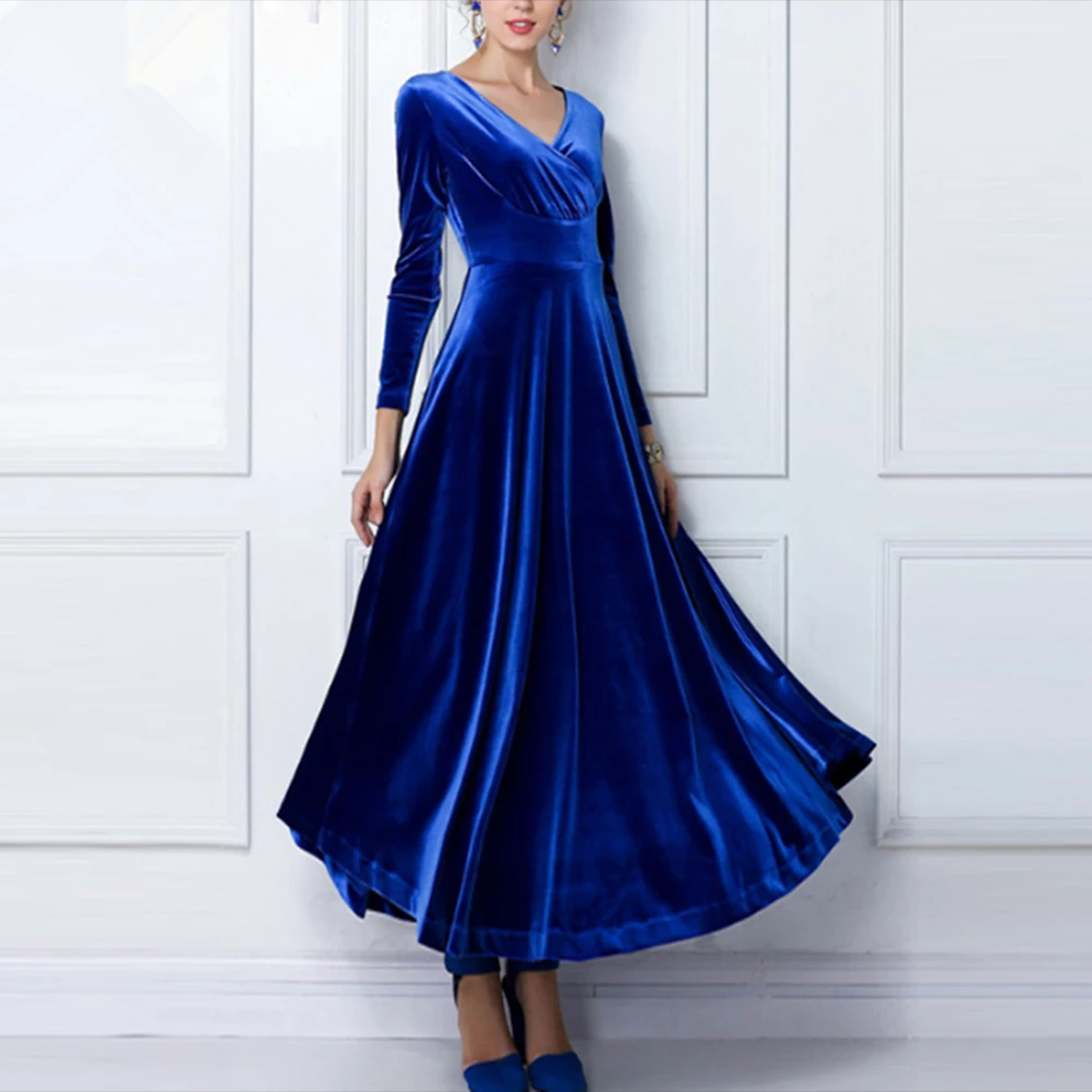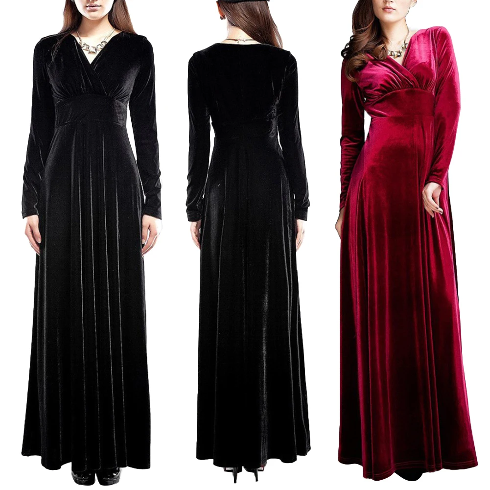 Винтажное женское осеннее Плиссированное бархатное платье макси с длинным рукавом и v-образным вырезом, вечерние платья