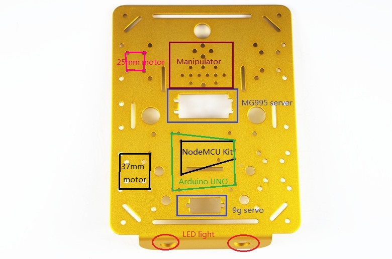 Новый дизайн уже пришел для шасси бака, с красивой формой и полностью металлическим алюминиевым сплавом. В этом шасси бака для ультразвукового датчика остается место для сервопривода 9g, а для сервопривода MG995 также остается место для вращения механического манипулятора.