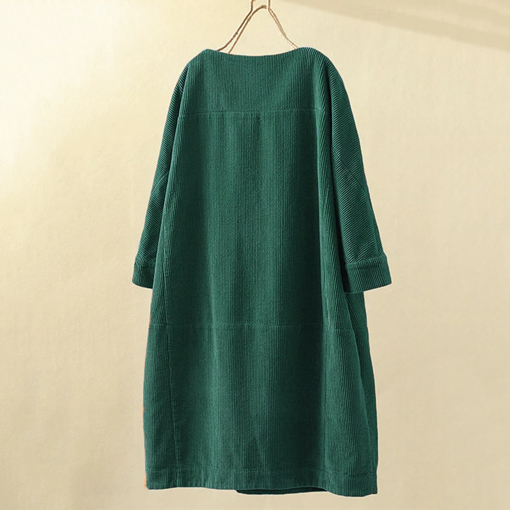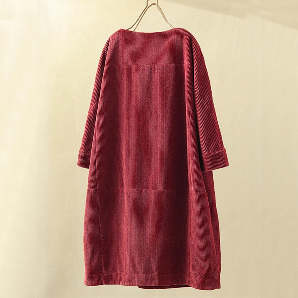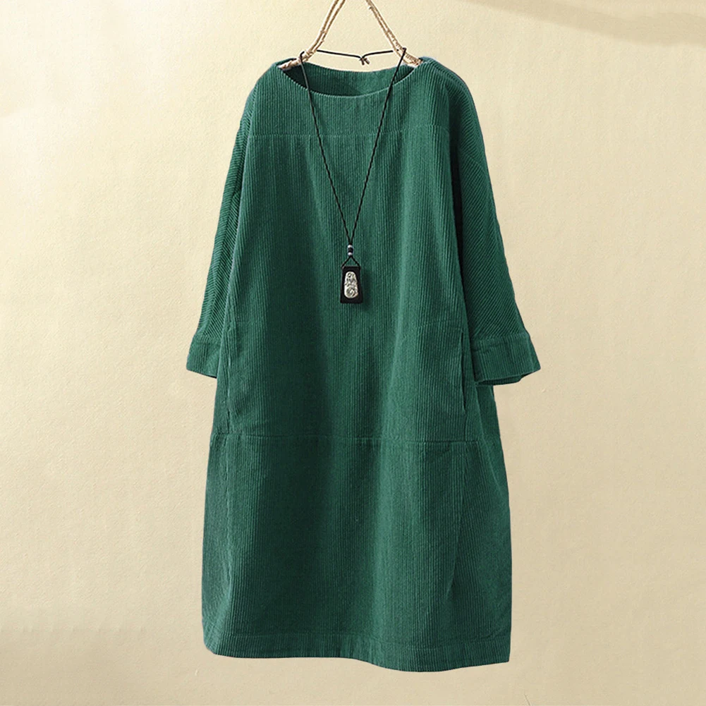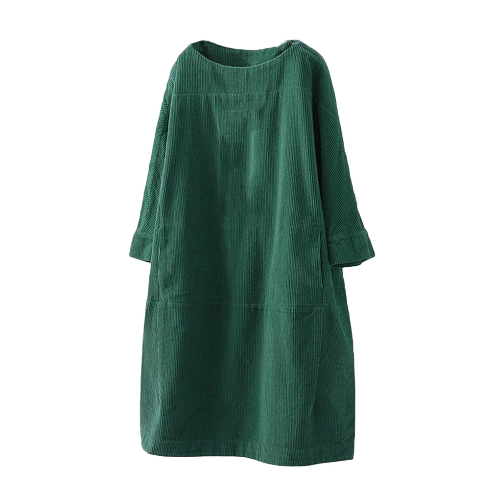 Женское однотонное вельветовое платье миди с длинными рукавами и круглым вырезом и карманами размера плюс