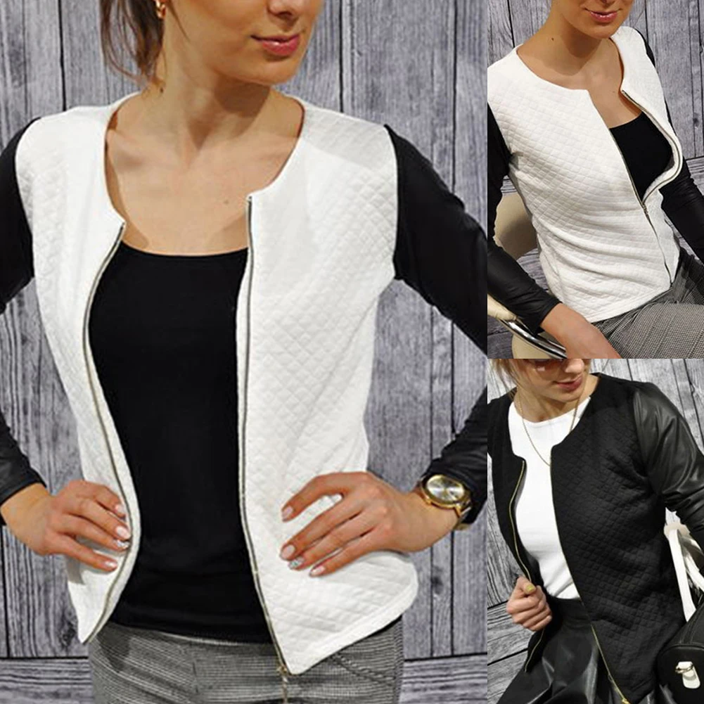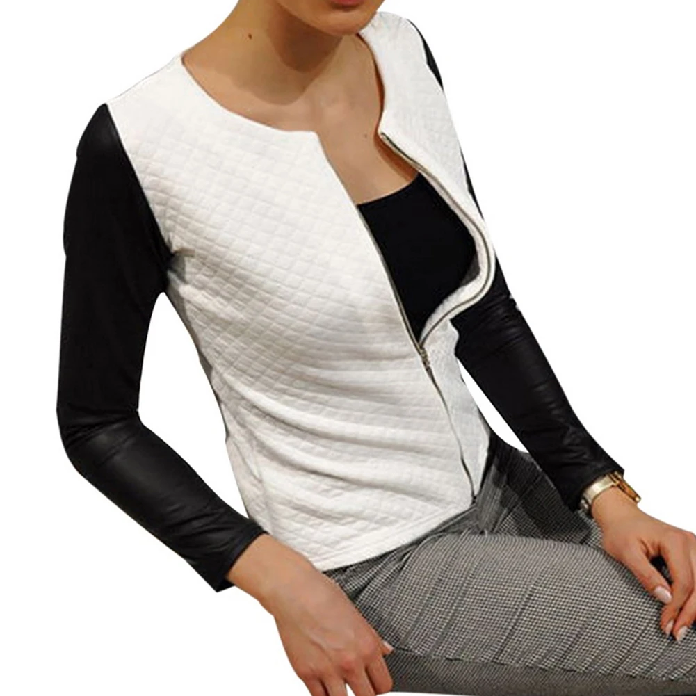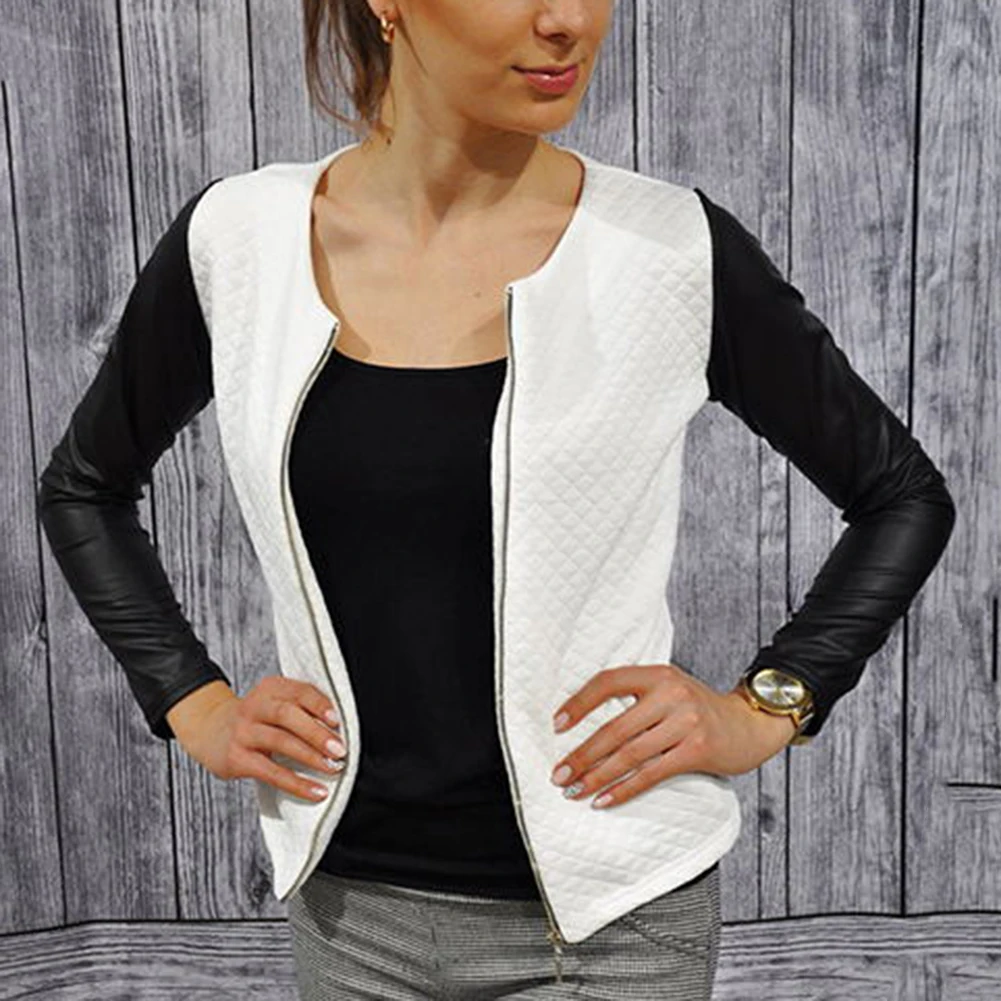 Модная женская куртка из искусственной кожи в стиле пэчворк с длинным рукавом, короткое пальто