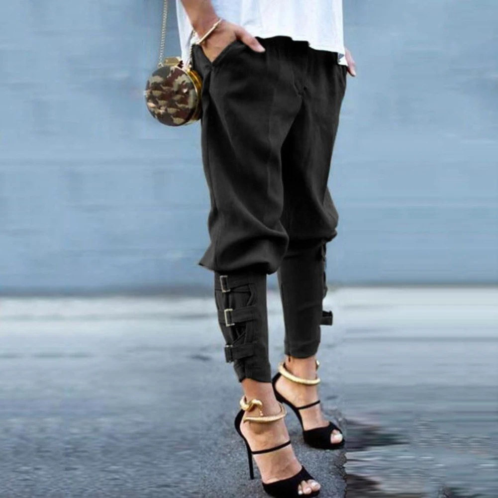 Однотонные Длинные шаровары на ремешке с пряжкой; повседневные женские свободные длинные брюки
