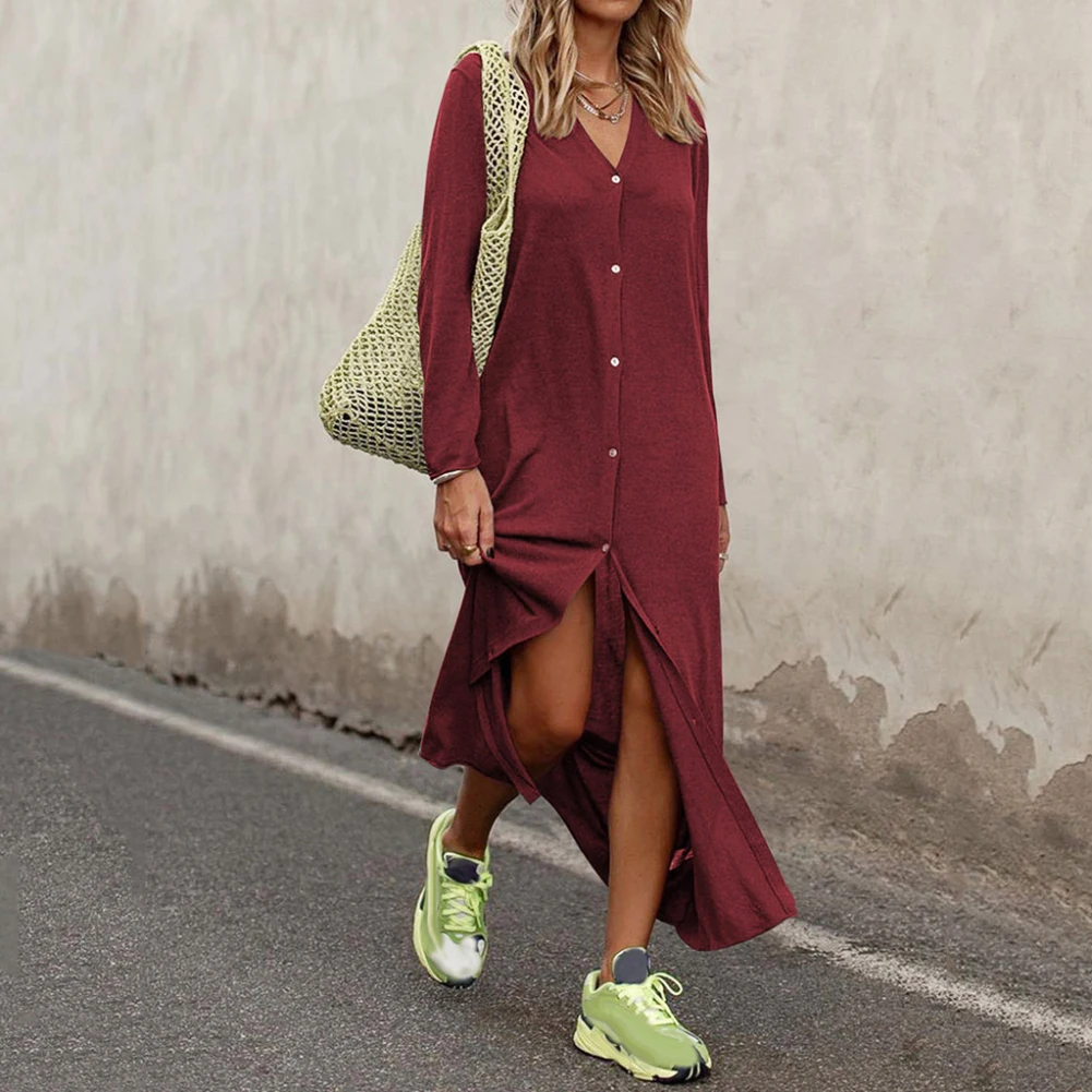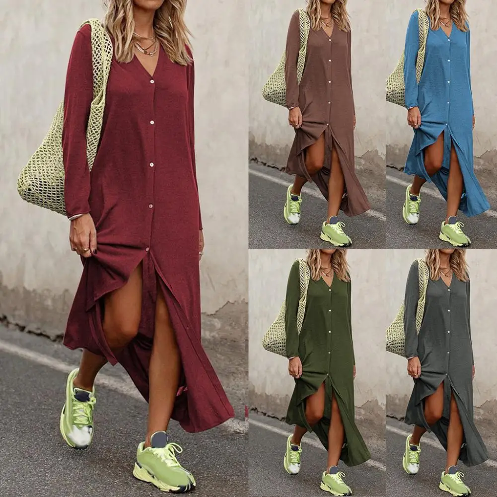 Женское однотонное платье с длинным рукавом и v-образным вырезом на пуговицах размера плюс
