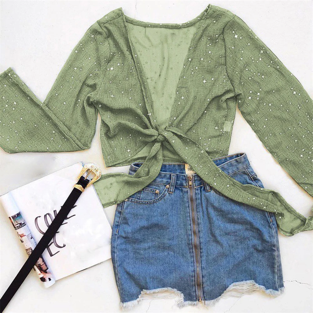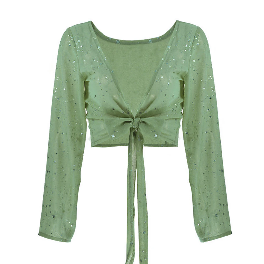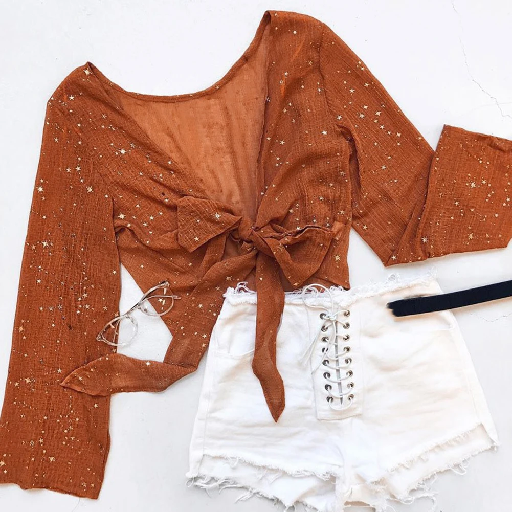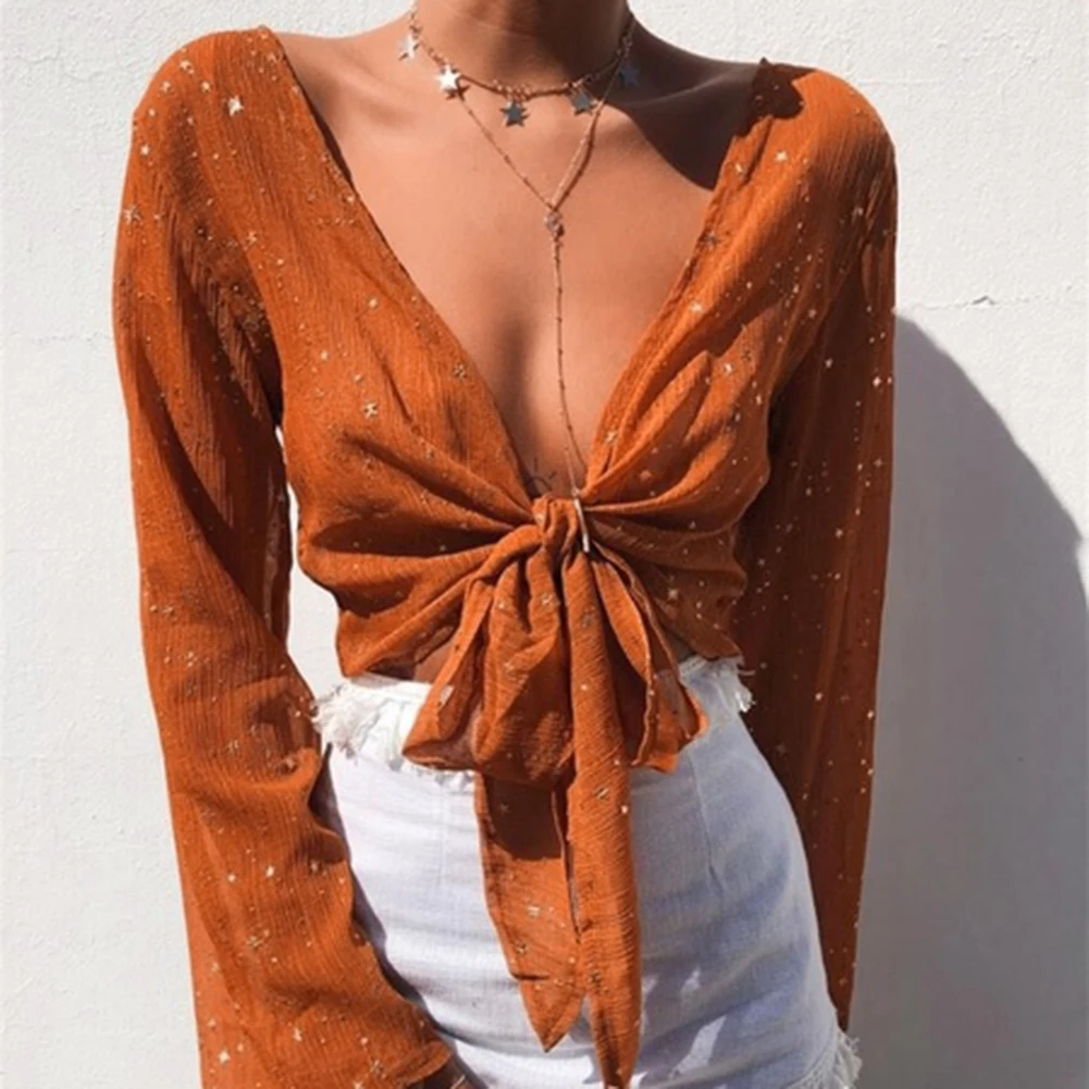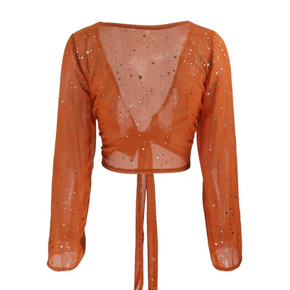 Сексуальный женский топ с глубоким v-образным вырезом и золотым тиснением, бандаж на грудь, прозрачный Свободный укороченный топ