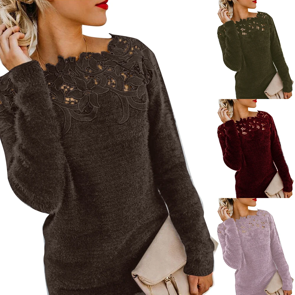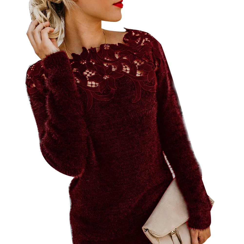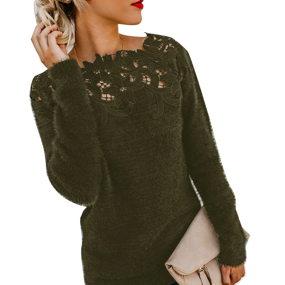 Сексуальные Женщины О-образным вырезом с длинным рукавом кружева шить выдалбливают тонкий пуловер Блузка