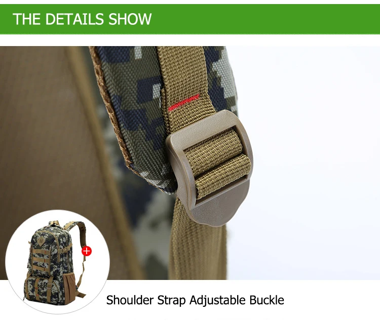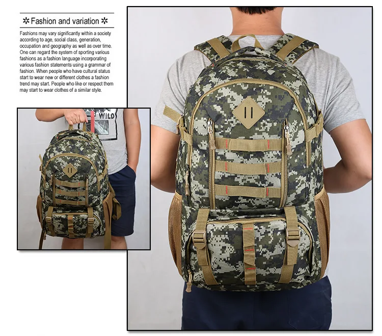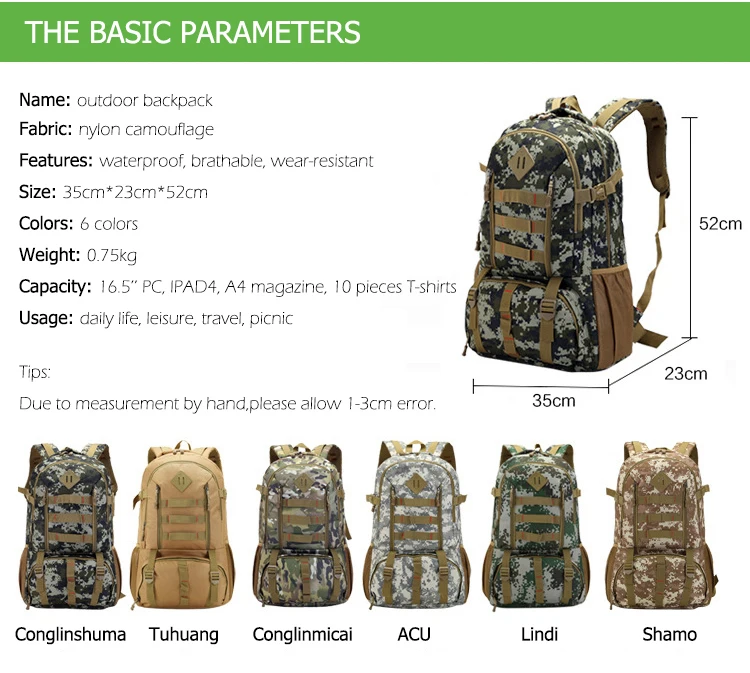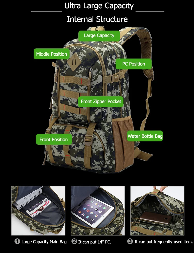 Название: тактический военный рюкзак Категория: открытый спальные мешки Пол: унисекс для мужчин и женщин Подходит для: пеших прогулок, кемпинга, альпинизма, рыбалки, спорта на открытом воздухе, путешествий, туризма Особенность: дышащий, водонепроницаемый, износостойкий, большой емкости. Материал: нейлон Цвет: шесть цветов на выбор. Размер: длина * ширина * высота 35*23*52 см (прибл.) Емкость: около 50 литров. Вес: около 0,8 кг.AE Стандартный доставка