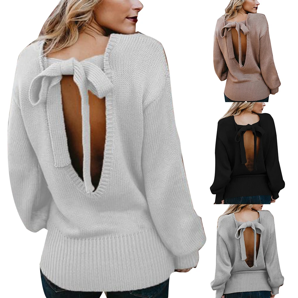 Модный женский осенний однотонный трикотажный свитер с круглым вырезом и открытой спиной и галстуком-бабочкой