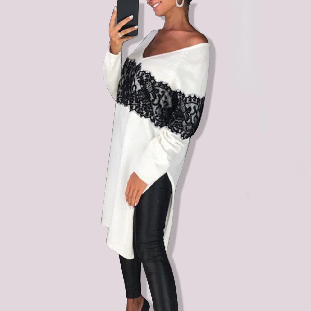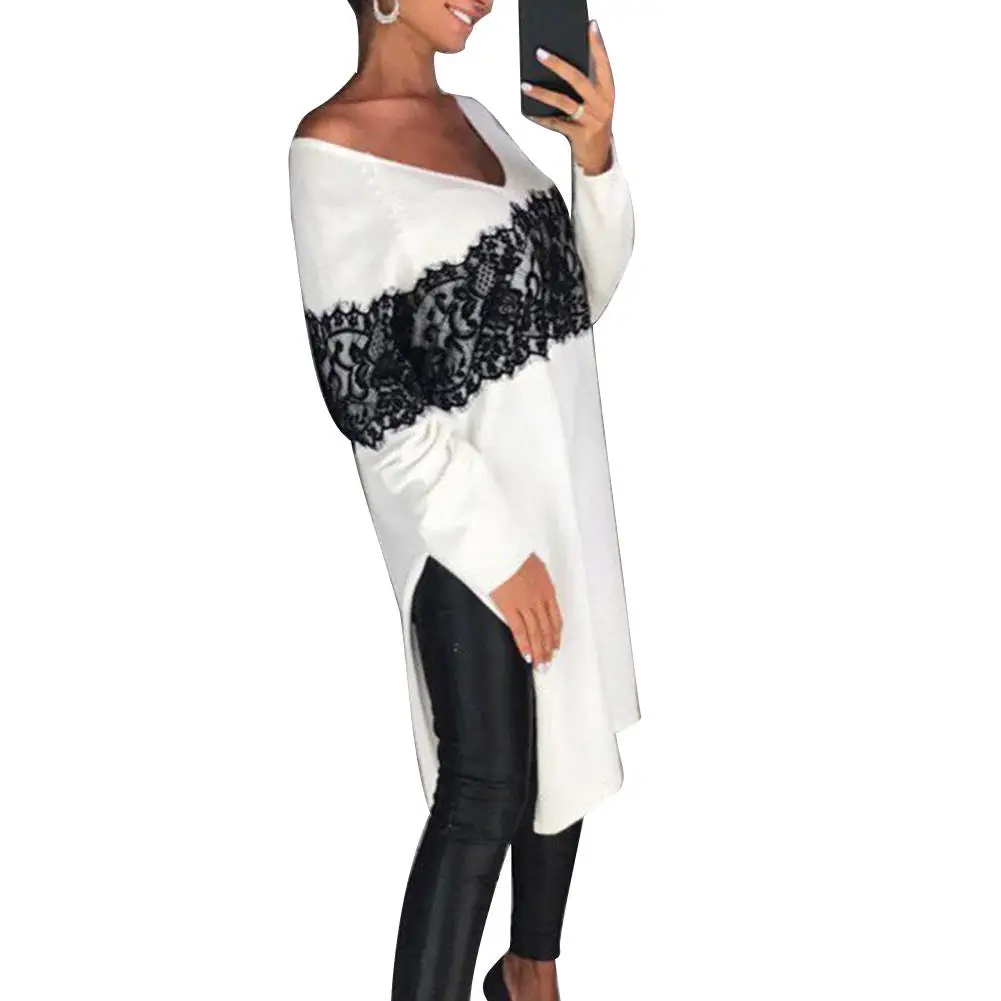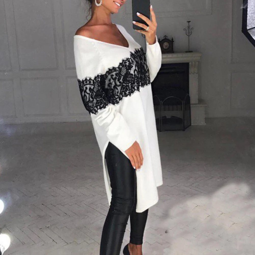 Женское осеннее однотонное кружевное платье до колена с v-образным вырезом и разрезом сбоку