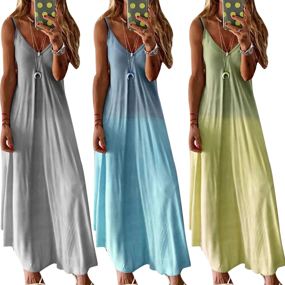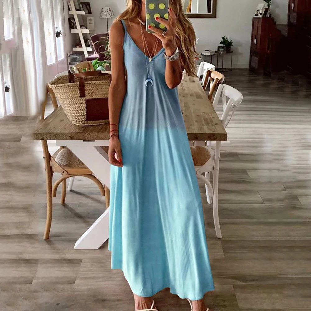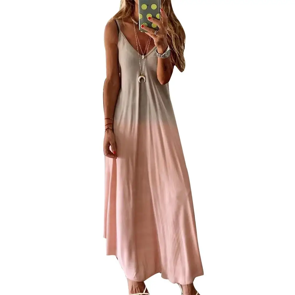 Летнее пляжное повседневное женское градиентное платье с v-образным вырезом без рукавов трапециевидной формы макси