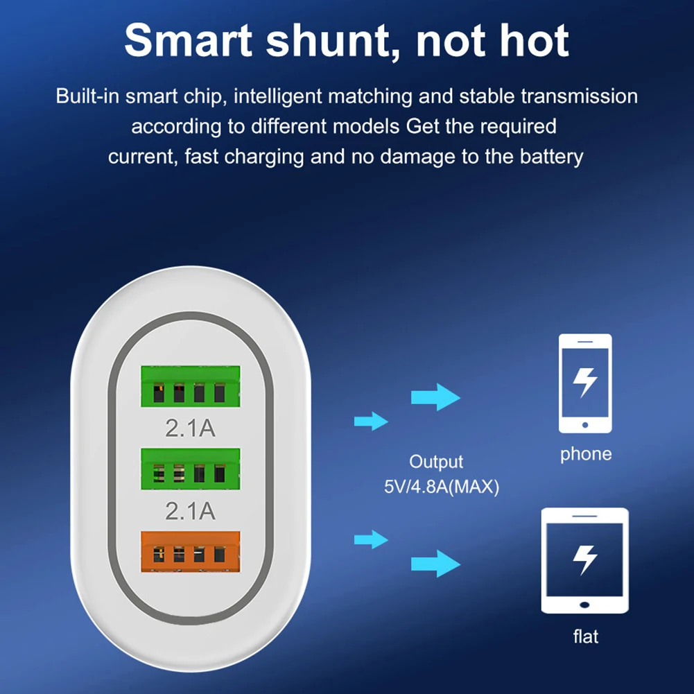 3 порта USB, поэтому вы можете заряжать 3 устройства одновременно.