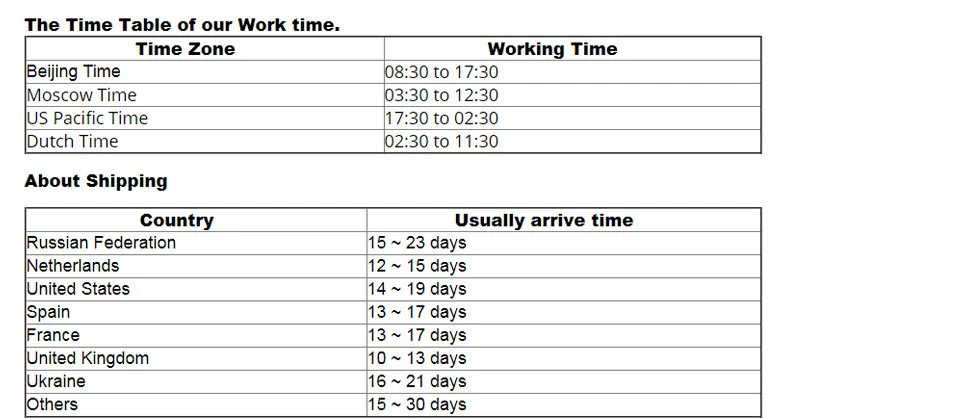 1. Если у вас есть какие-либо вопросы, пожалуйста, свяжитесь с нами, и мы ответим в течение 24 часов, за исключением будней. 2. Если возникнут какие-либо проблемы, пожалуйста, не волнуйтесь, вы можете сначала связаться с нами, мы обещаем, что сделаем все возможное, чтобы помочь вам. 3. Пожалуйста, обратите внимание на разницу во времени между нами. Мы работаем в Китае.