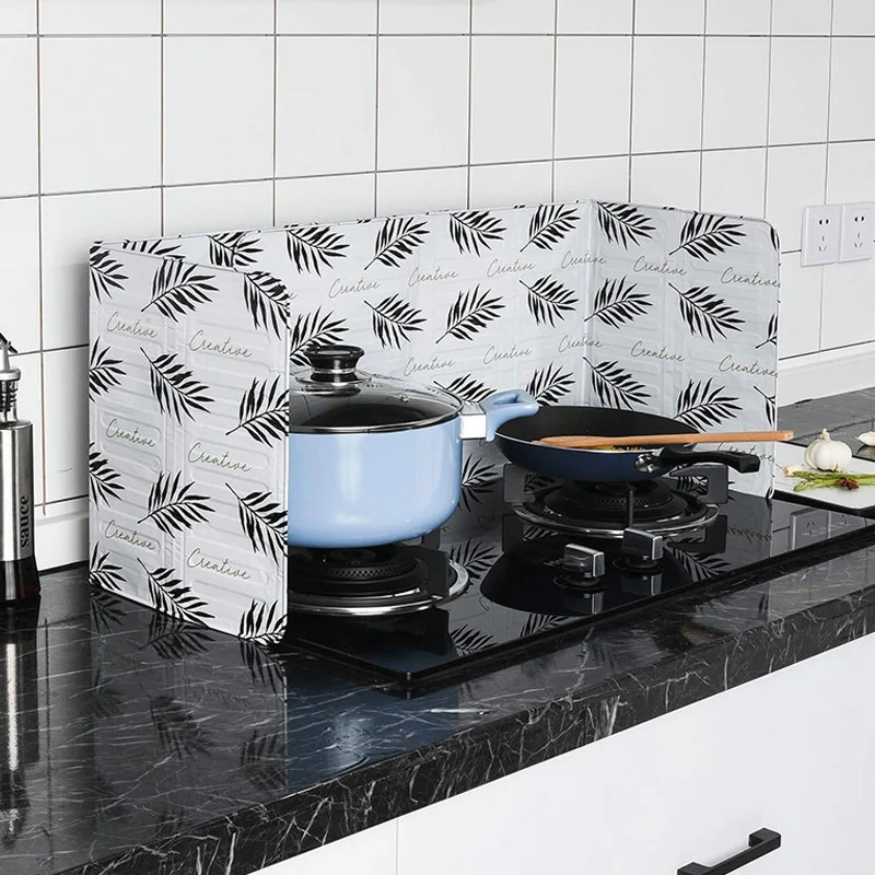 Три откидных панели разворачиваются и окружают ваши сковородки и сковородки, чтобы обеспечить высокий защитный барьер от горячей, вредной смазки. Складывается, чтобы хранить, когда не используется.