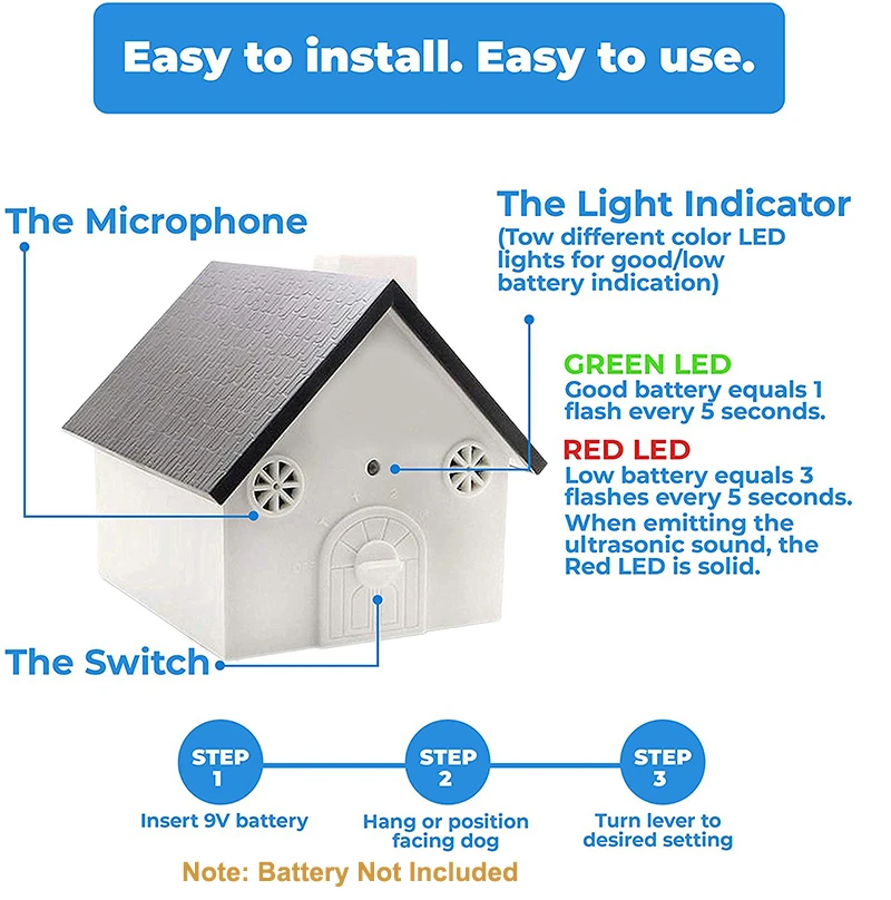 Прибор для защиты от лай эффективный диапазон до 15 м/50 футов: наружный контроль коры автоматически активируется, когда он обнаруживает лай на расстоянии до 50 футов. Затем он издает ультразвуковой звук.