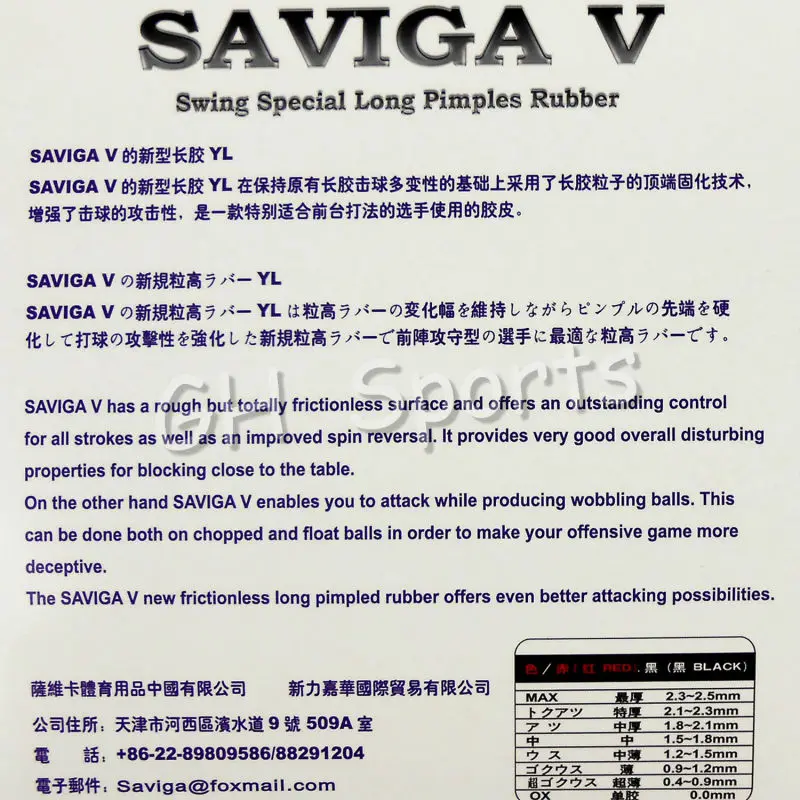 SAVIGA V имеет шероховатую, но полностью фрикционную поверхность и обеспечивает выдающийся контроль за всеми штрихами, а также улучшенный разворот вращения. Он обеспечивает очень хорошие общие тревожные свойства для блокировки близко к таблице. С другой стороны, SAVIGA V позволяет вам атаковать во время производства колеблющихся шариков. Это можно сделать как на рубленых, так и на поплавковых шариках, чтобы сделать вашу наступательную игру более обманчивой. SAVIGA V Новая фрикционно длинная резиновая Резина предлагает еще лучшие возможности атакующих. Толщина губки: 0,5-0,8 мм Цвет резины: красный или черный