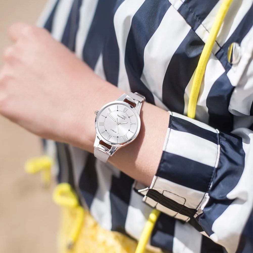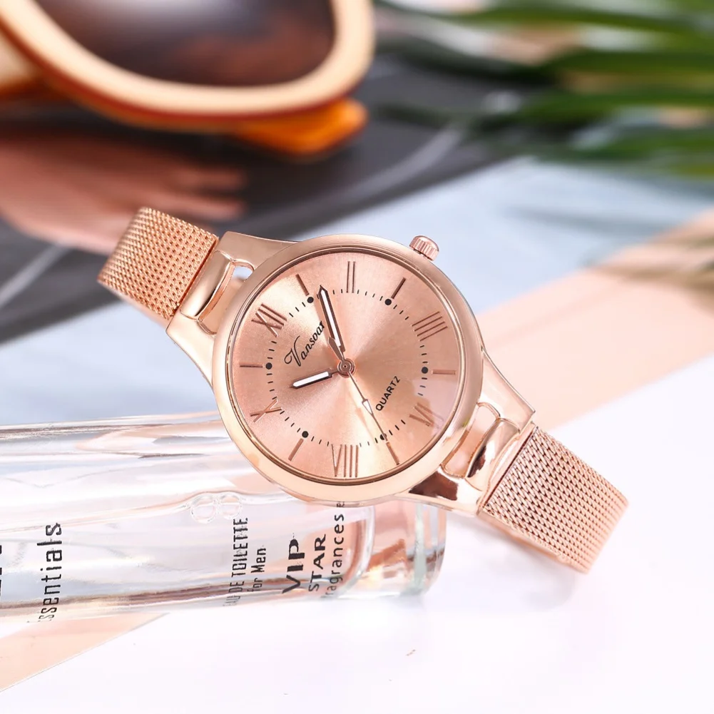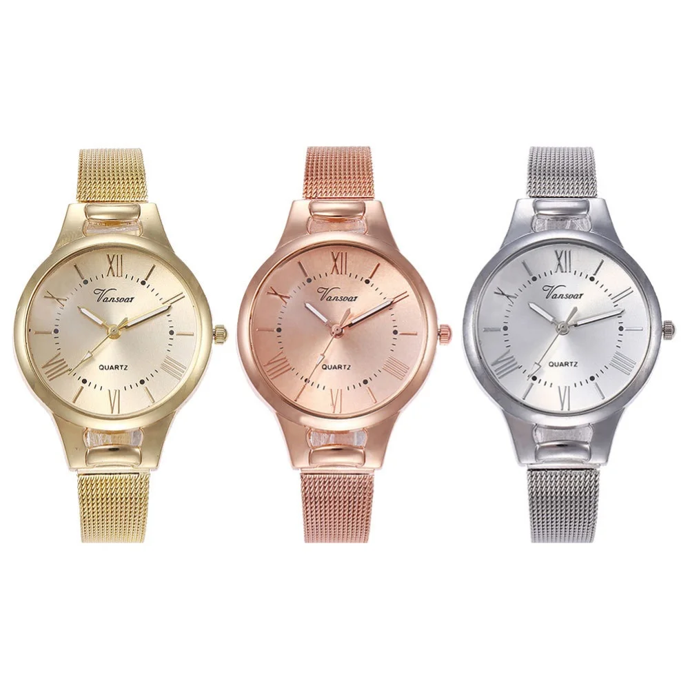 Женские римские цифры с Круглым Циферблатом из нержавеющей стали с сетчатым ремешком, аналоговые кварцевые часы